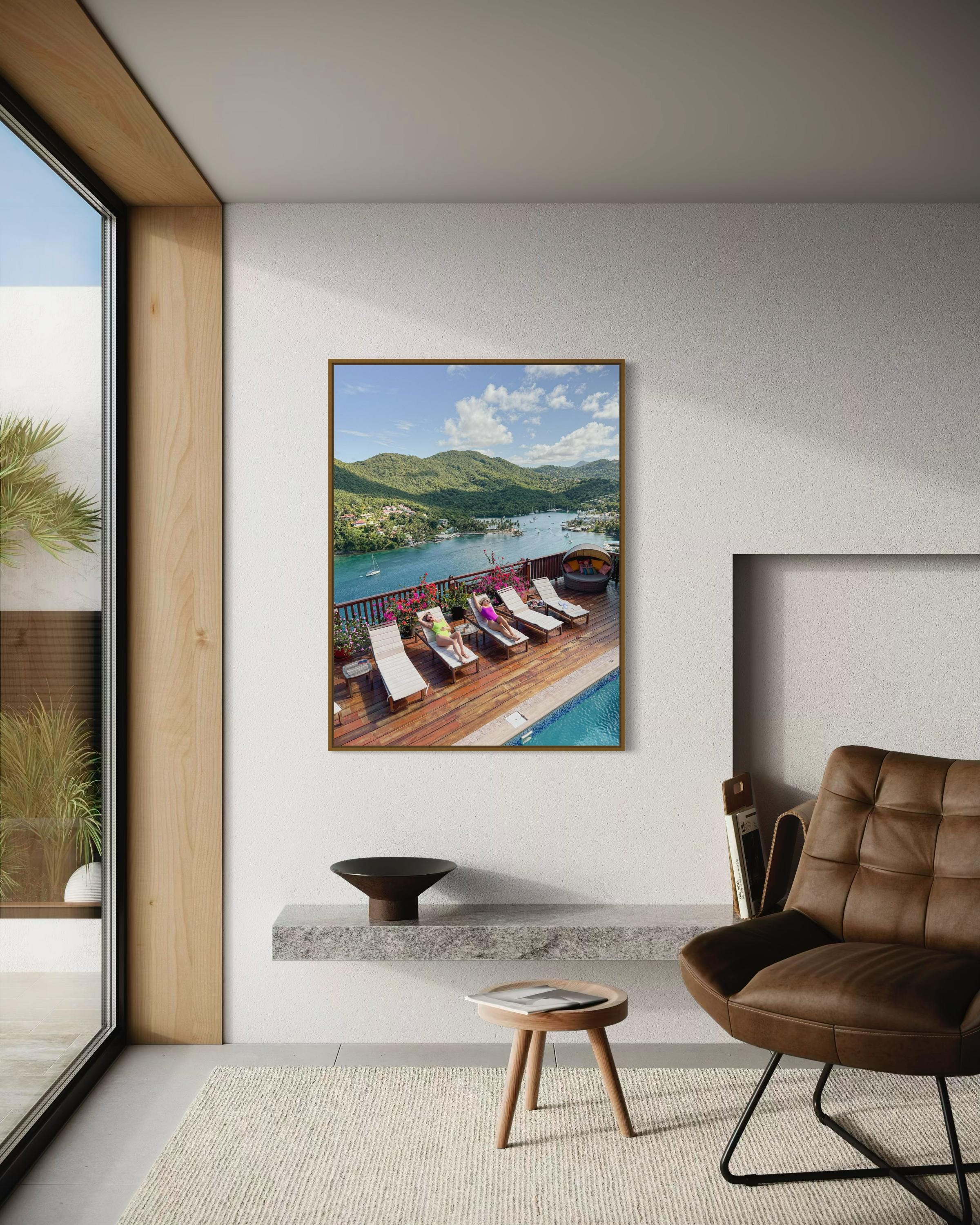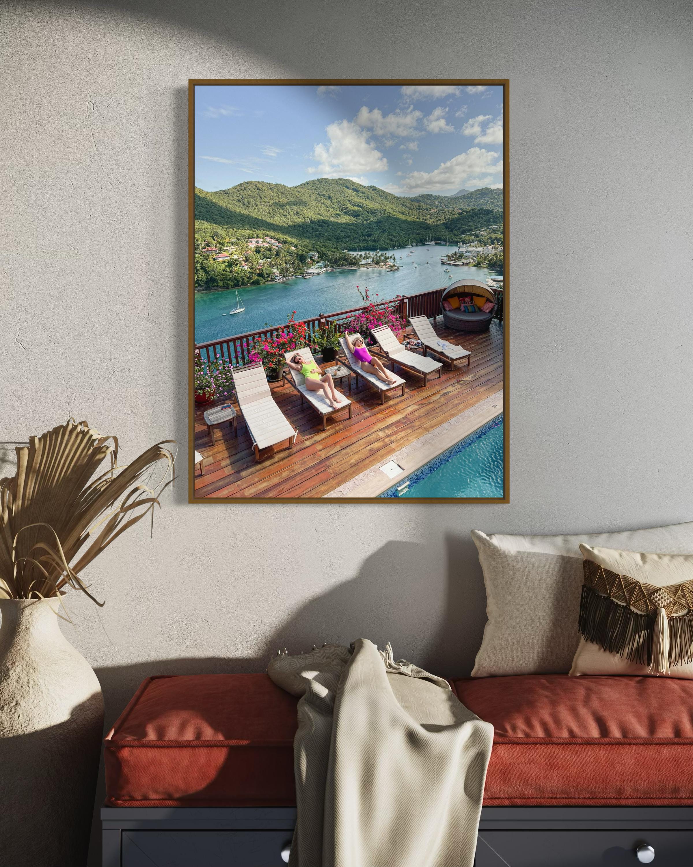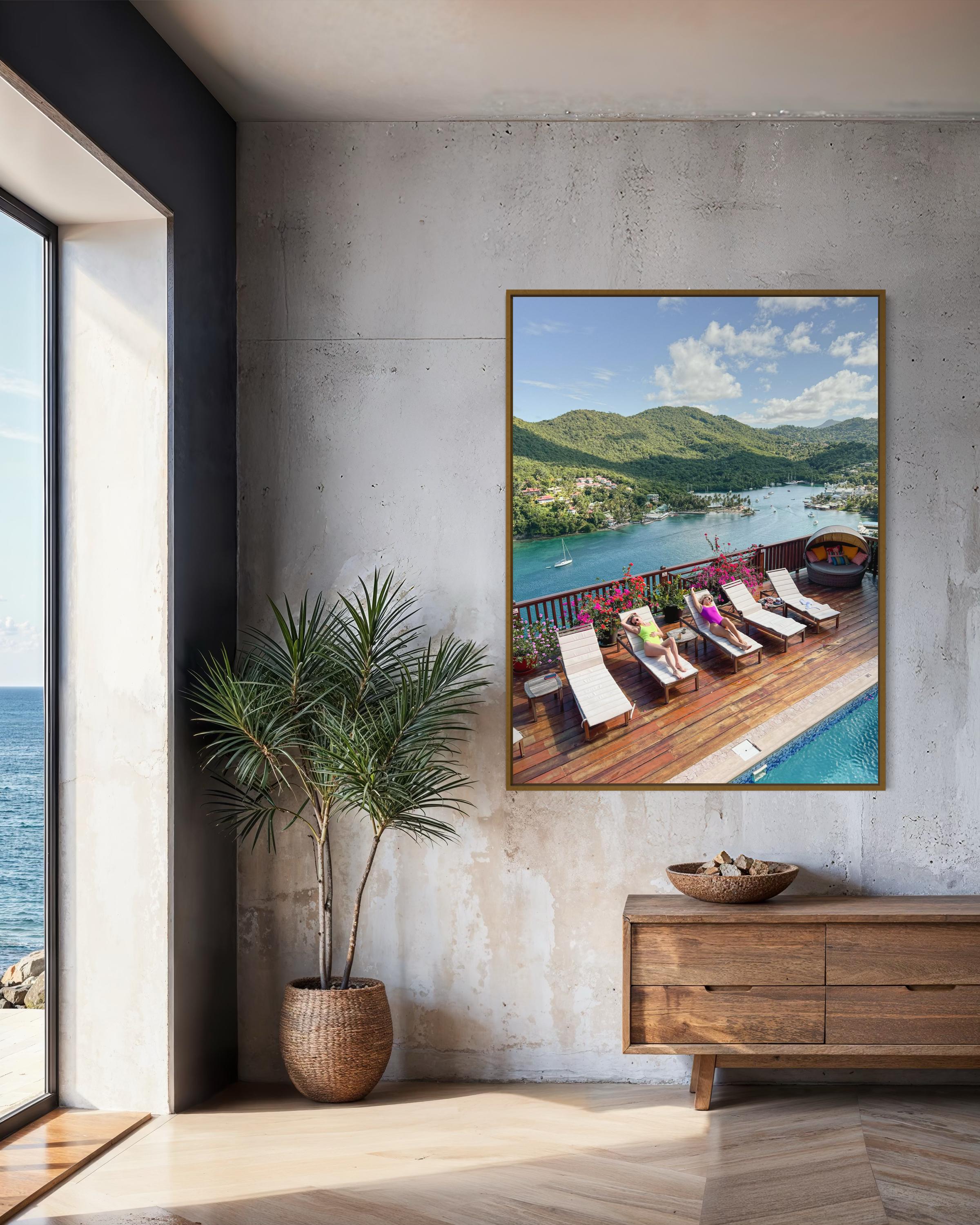 Step into Marigot Bay, St. Lucia's luxurious charm, with this exquisite photo, capturing a perfect tropical moment. Two vibrant ladies bask under the sun by a pool, their bathing suits in radiant shades of purple and yellow-green standing out against the backdrop. The wooden pool deck adds depth and a splash of rustic charm, contrasting beautifully with the bay's azure waters and the lush, mountainous landscape. From the elevated vantage point, witness a panoramic view of Marigot Bay with the vast blue sky overhead. It's a modern, fresh take on a Caribbean escape, beckoning viewers into a world of relaxation and beauty.