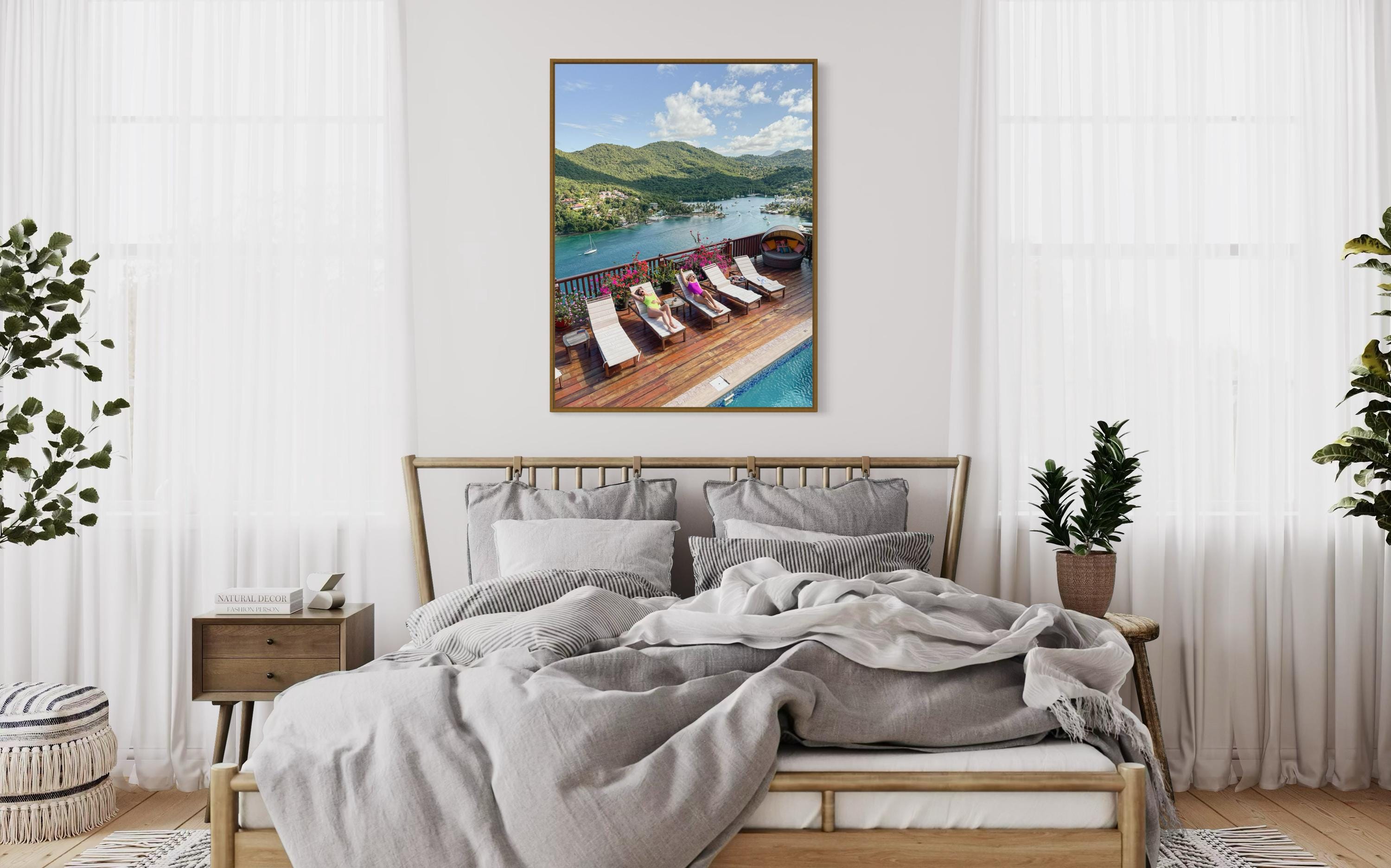With this stunning print, indulge in the serene yet vivacious beauty of Marigot Bay, St. Lucia. It is designed for Etsy aficionados and promises a daily dose of tropical allure and modern sophistication.