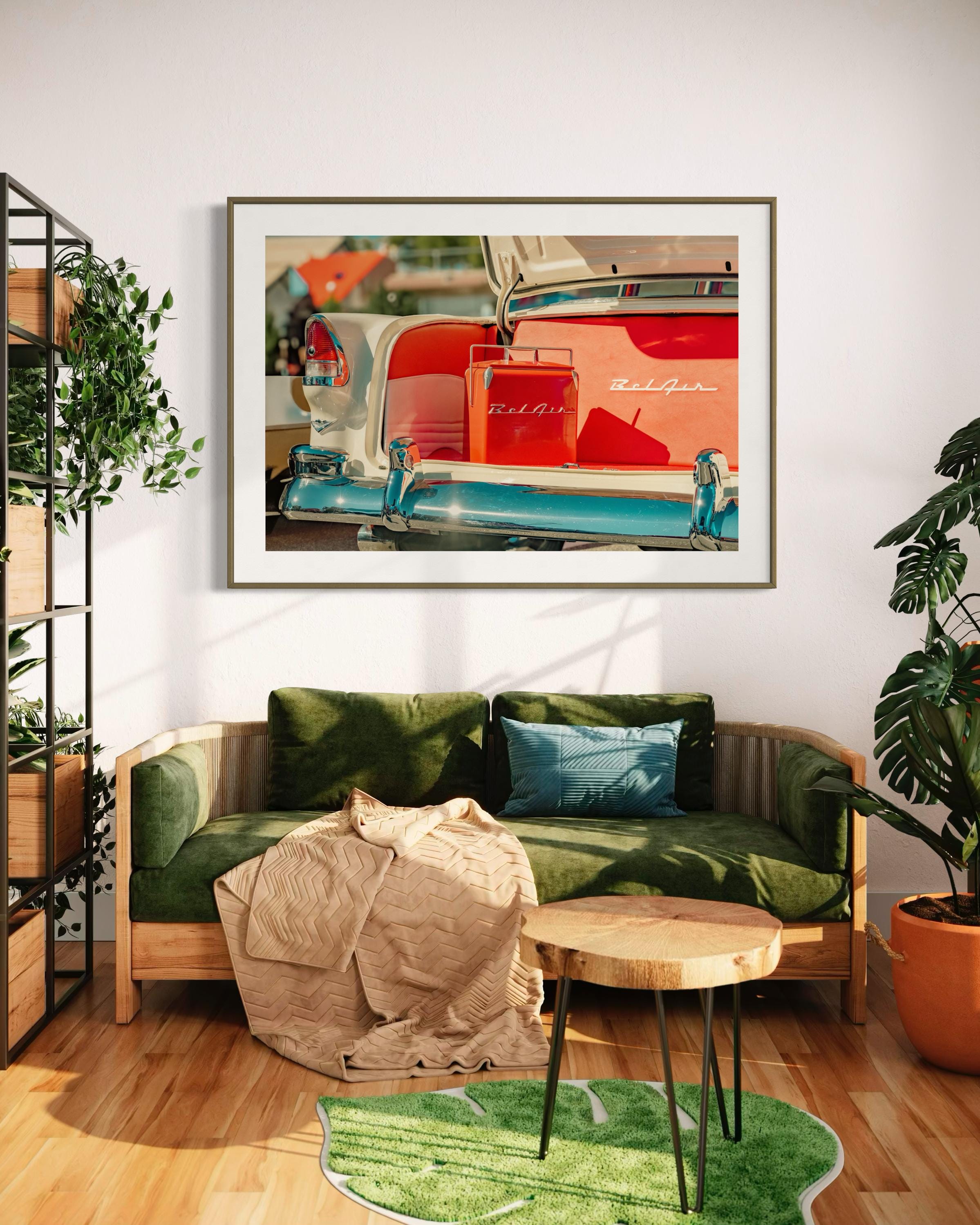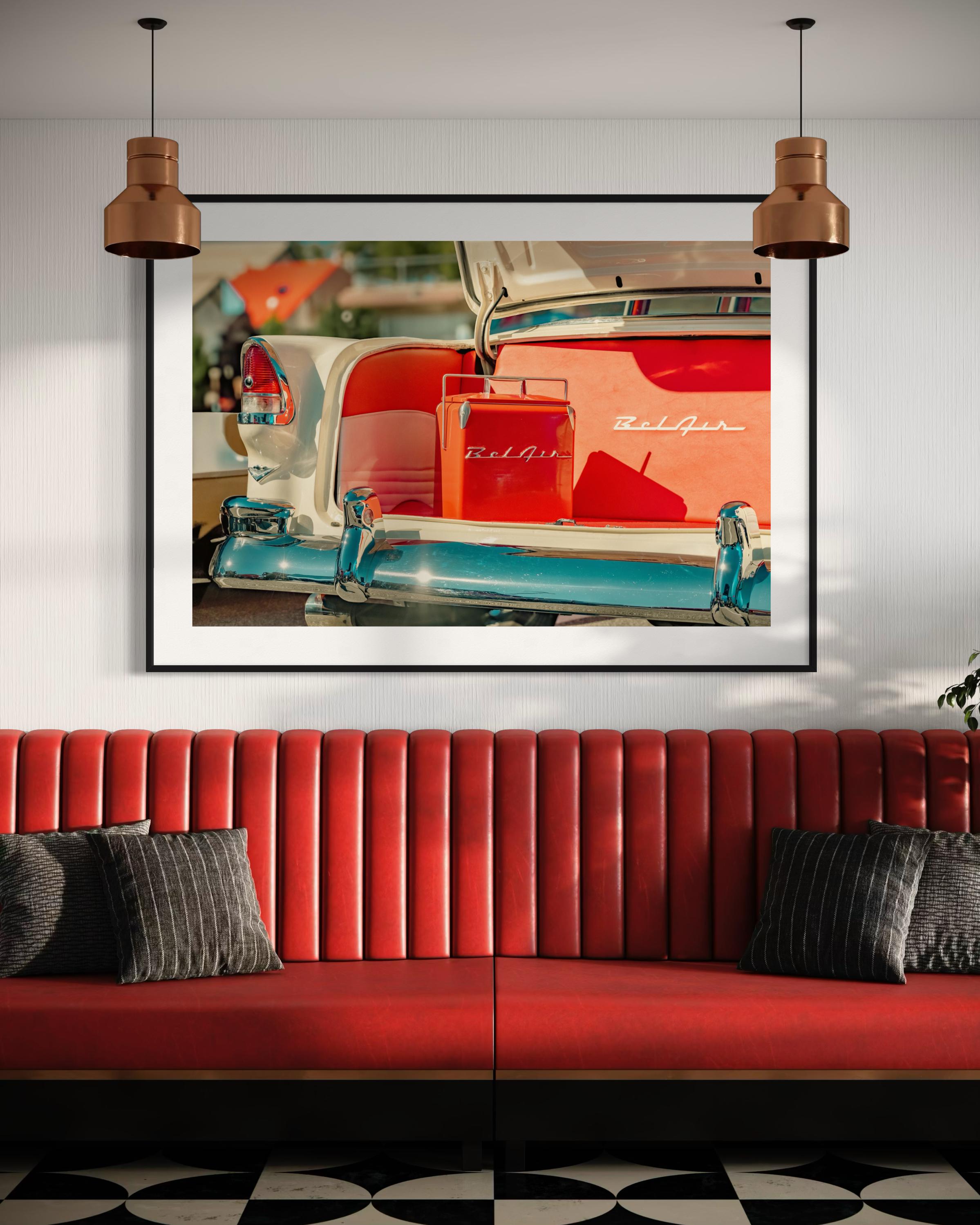 Elevate your decor with this vibrant wall art print featuring the classic Chevrolet Bel Air trunk, complete with its iconic red cooler and polished chrome accents. This nostalgic piece celebrates the golden era of American automotive design, embodying timeless elegance and retro charm. Perfect for car enthusiasts, vintage lovers, and those who cherish Americana-inspired decor.