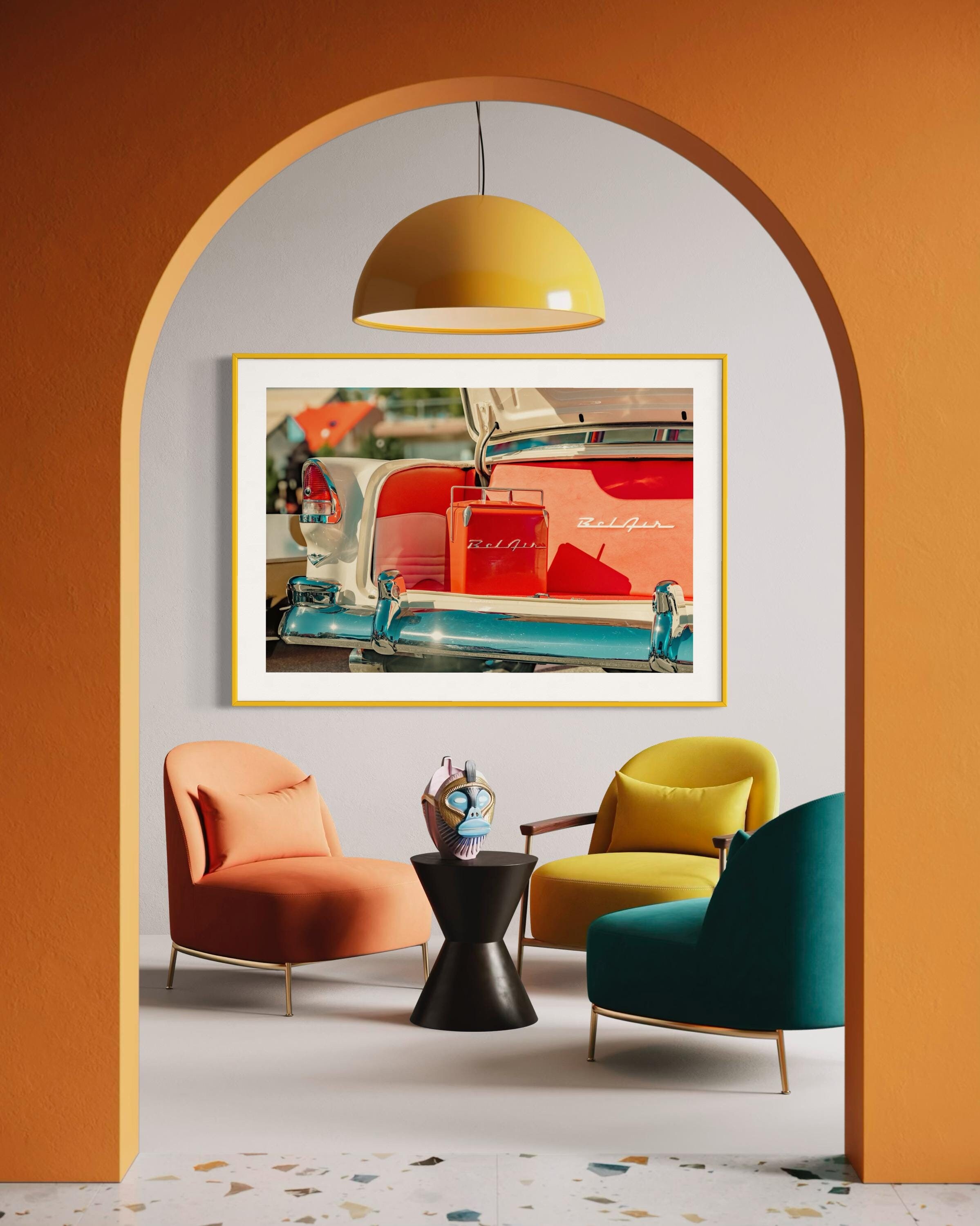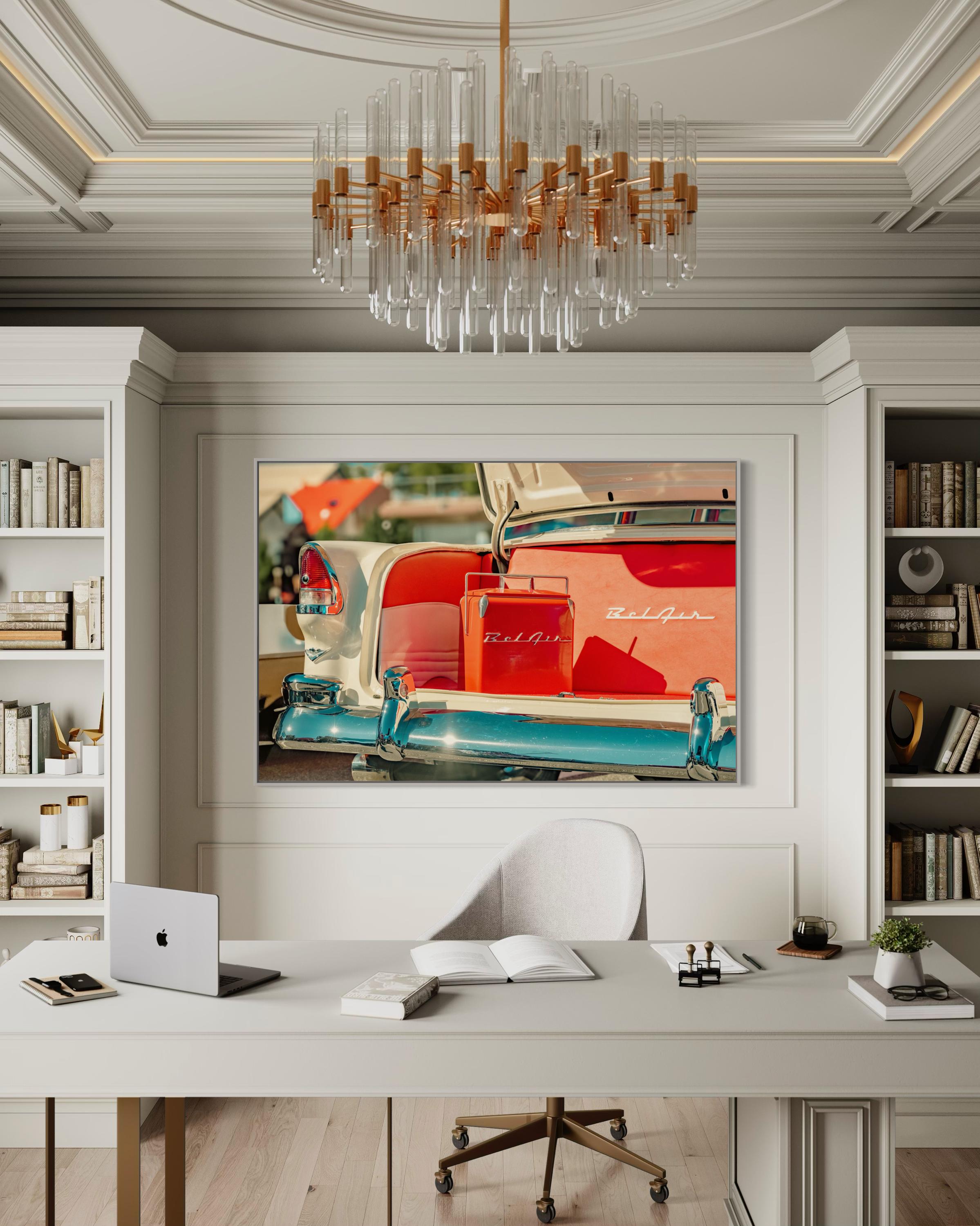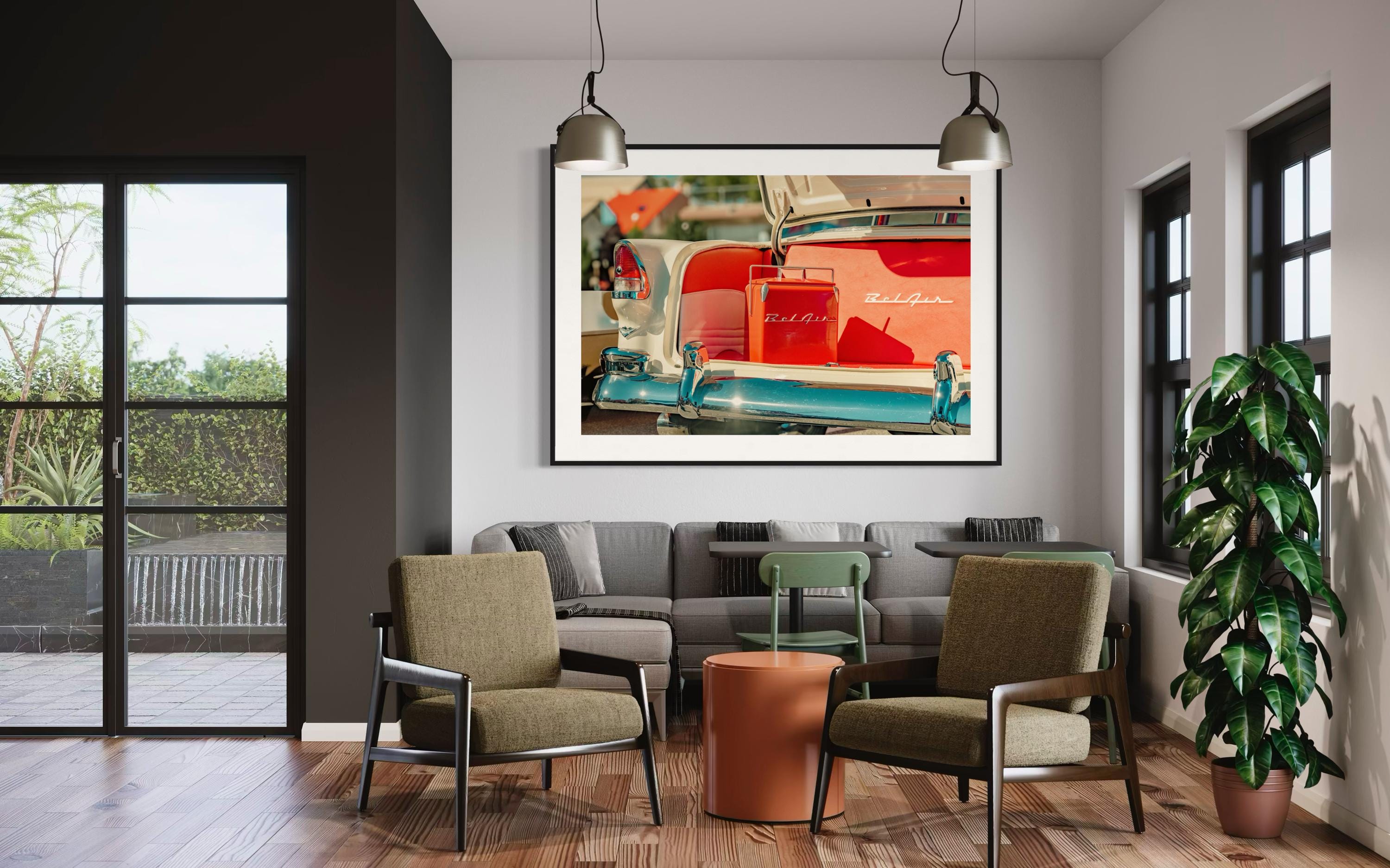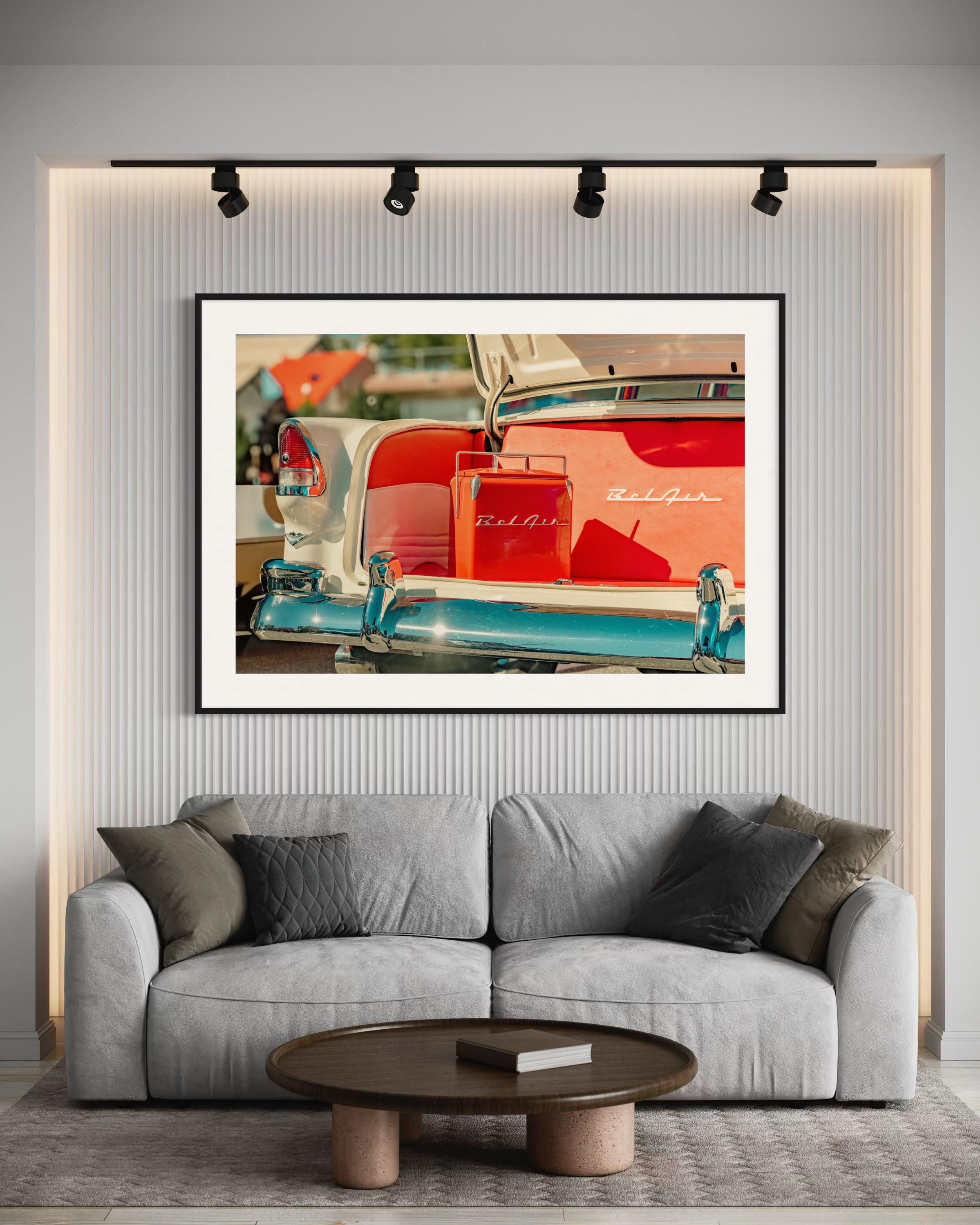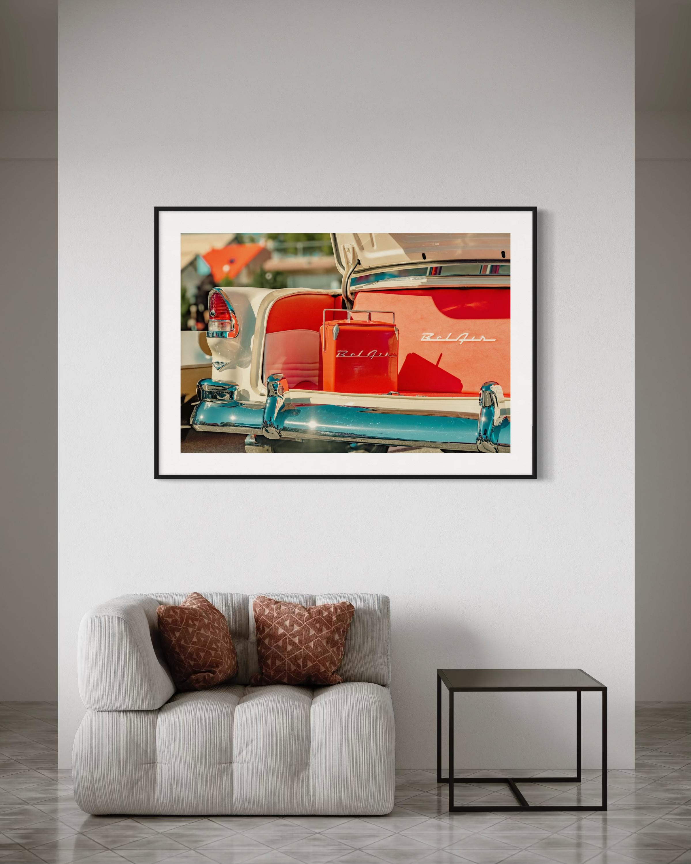 This artwork is a statement piece for living rooms, offices, or garages, adding a splash of color and sophistication to any space. Professionally printed on premium materials, this piece captures every detail of the Bel Air’s iconic trunk design, making it a must-have for collectors and decor aficionados.