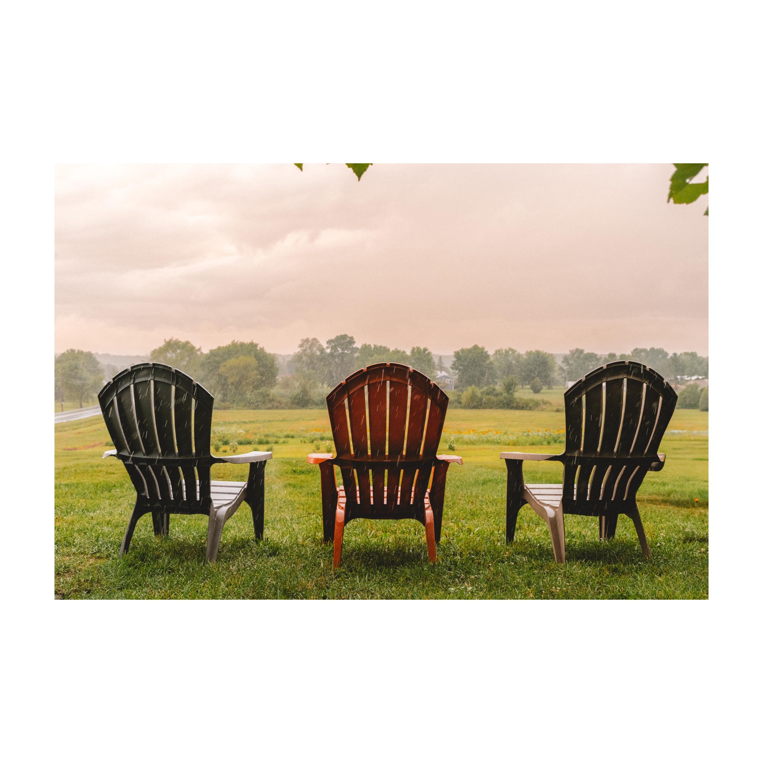 Captured at the serene Orange County Distillery in Warwick, Upstate New York, this photograph features three Adirondack chairs facing a lush countryside landscape under a soft rain shower. The muted palette of greens, browns, and misty skies creates a calming, nostalgic atmosphere perfect for adding rustic charm to your walls. Ideal for those seeking a peaceful connection to nature and cozy, farmhouse-inspired decor.