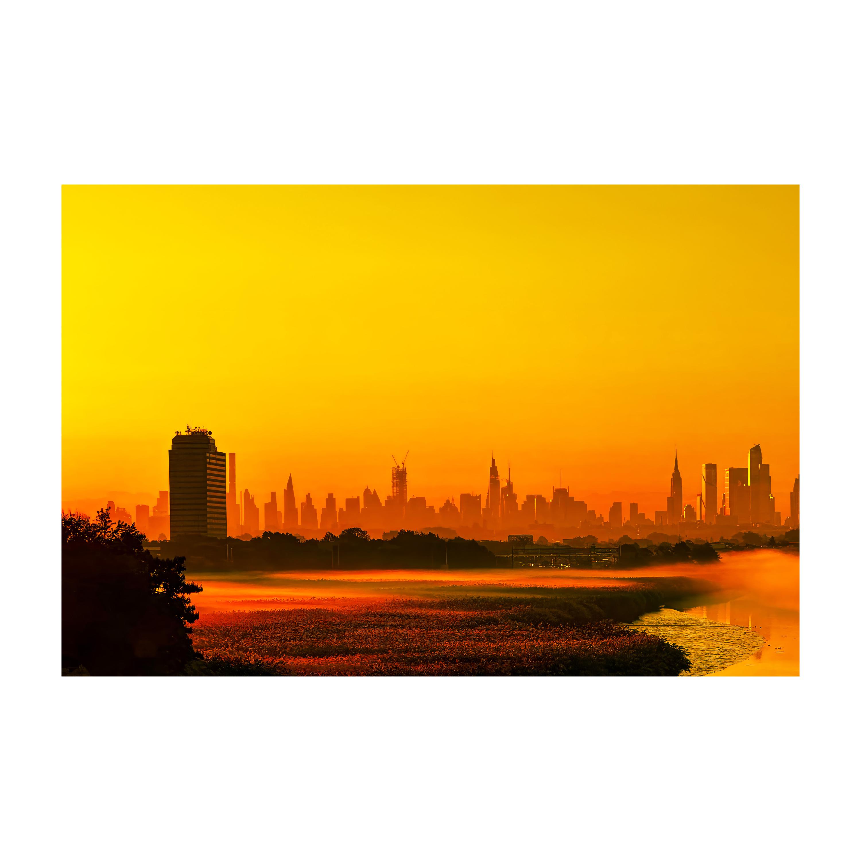 Experience the mesmerizing beauty of a cityscape silhouetted against a radiant golden-orange sky at sunrise. This artwork captures the ethereal essence of morning light as it kisses the skyline and bathes the surrounding wetlands in warm hues. The intricate balance of urban geometry and natural serenity offers a unique and timeless decor piece for any home or office. This photograph is perfect for modern, minimalist, or contemporary interiors and exudes elegance and warmth. Whether displayed in your living room, bedroom, or workspace, it adds a touch of sophistication and artistic charm.