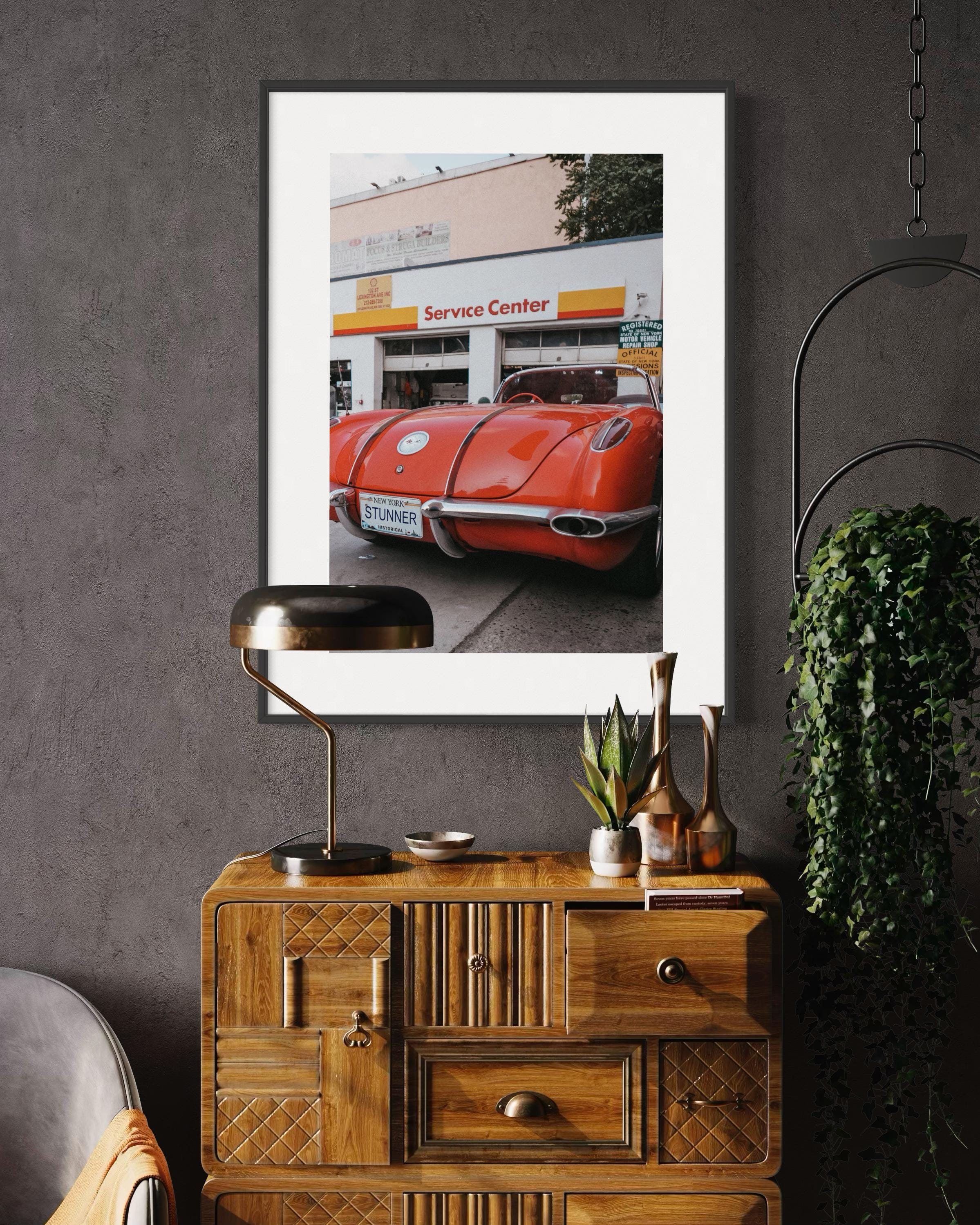Fine Art print - 1950s Corvette at the service station Wall art, Retro Red Convertible, Classic Car Decor for Office, Home dec or, or shop