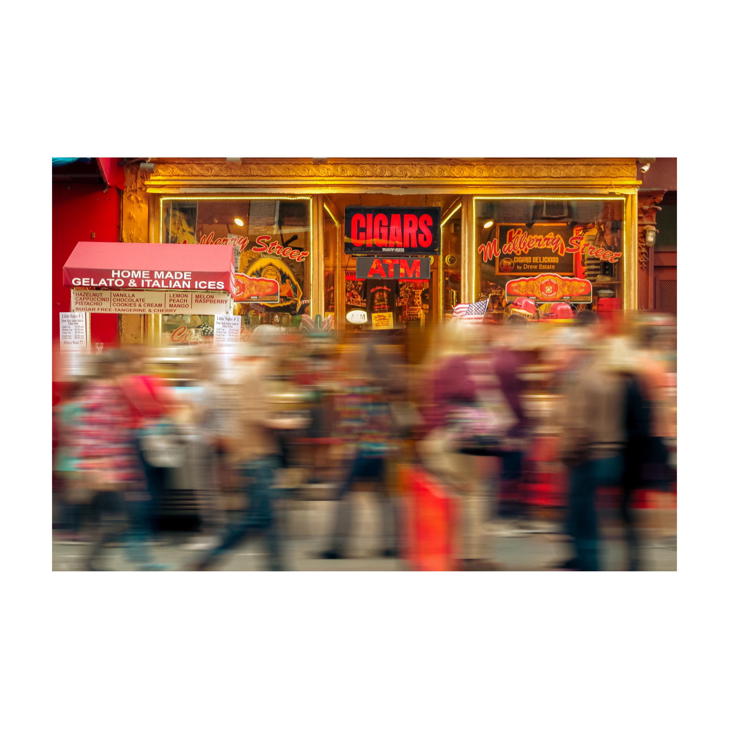 “Mulberry Street” – A fleeting slice of New York’s soul. Captured in the heart of Little Italy, this image freezes a split-second of urban rhythm: neon cigars, gelato menus, and a crowd in motion, blurred just enough to feel like time passing you by.