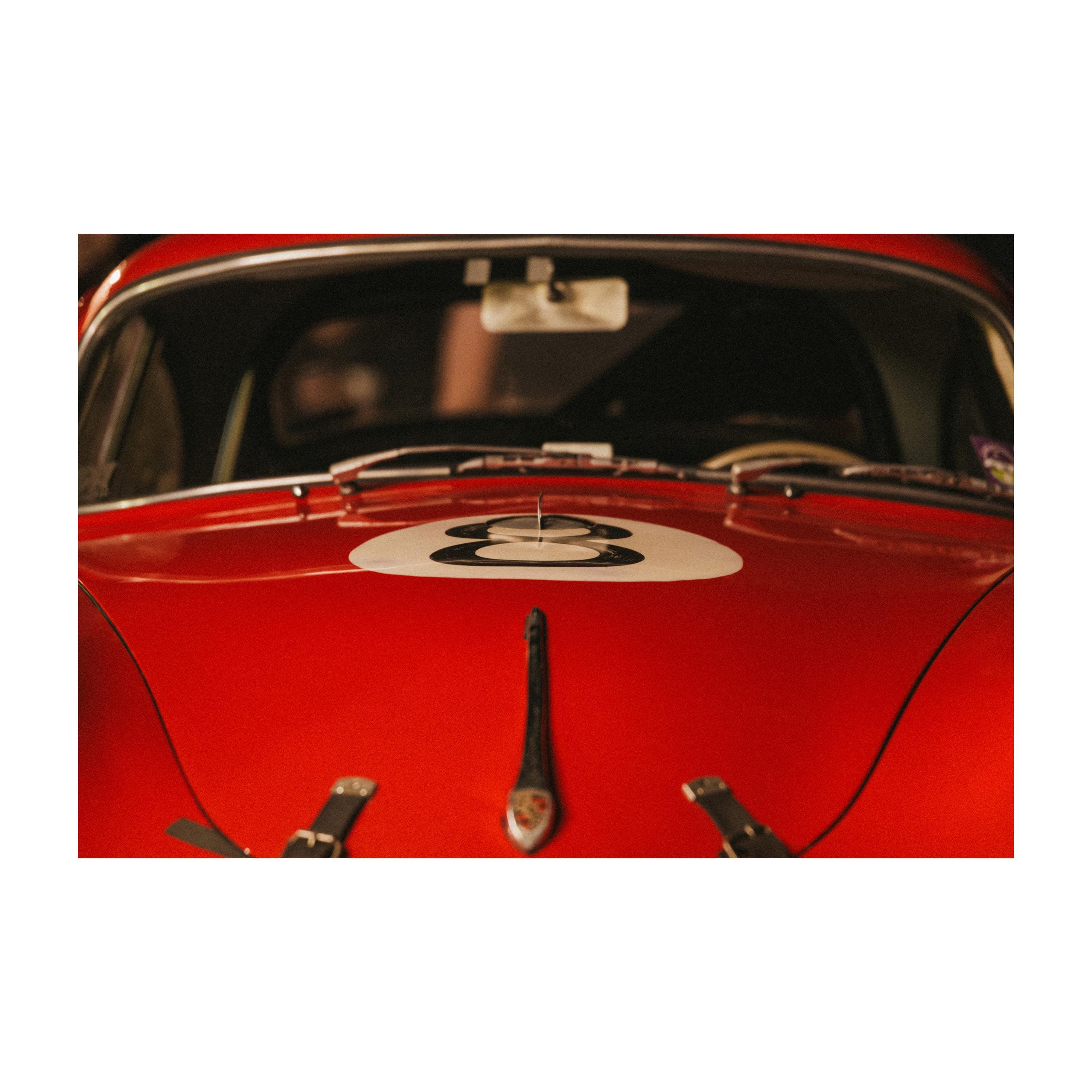 Porsche 356 print, vintage car photography, classic car wall art, 8-ball hood decal art, racing car decor, Porsche racing livery, automotive fine art, car enthusiast gift, Gil Stunner photography, vintage racing print, Porsche lover gift, archival quality print, Porsche 356 wall art, classic car hood photo, vintage Porsche print, red racing car poster, iconic Porsche decor, Porsche 356 number 8, classic racing aesthetic, automotive wall art, gift for Porsche lovers, retro car print, vintage sports car art, bold red car photography, Porsche crest artwork, car enthusiast decor, luxury automotive design print.