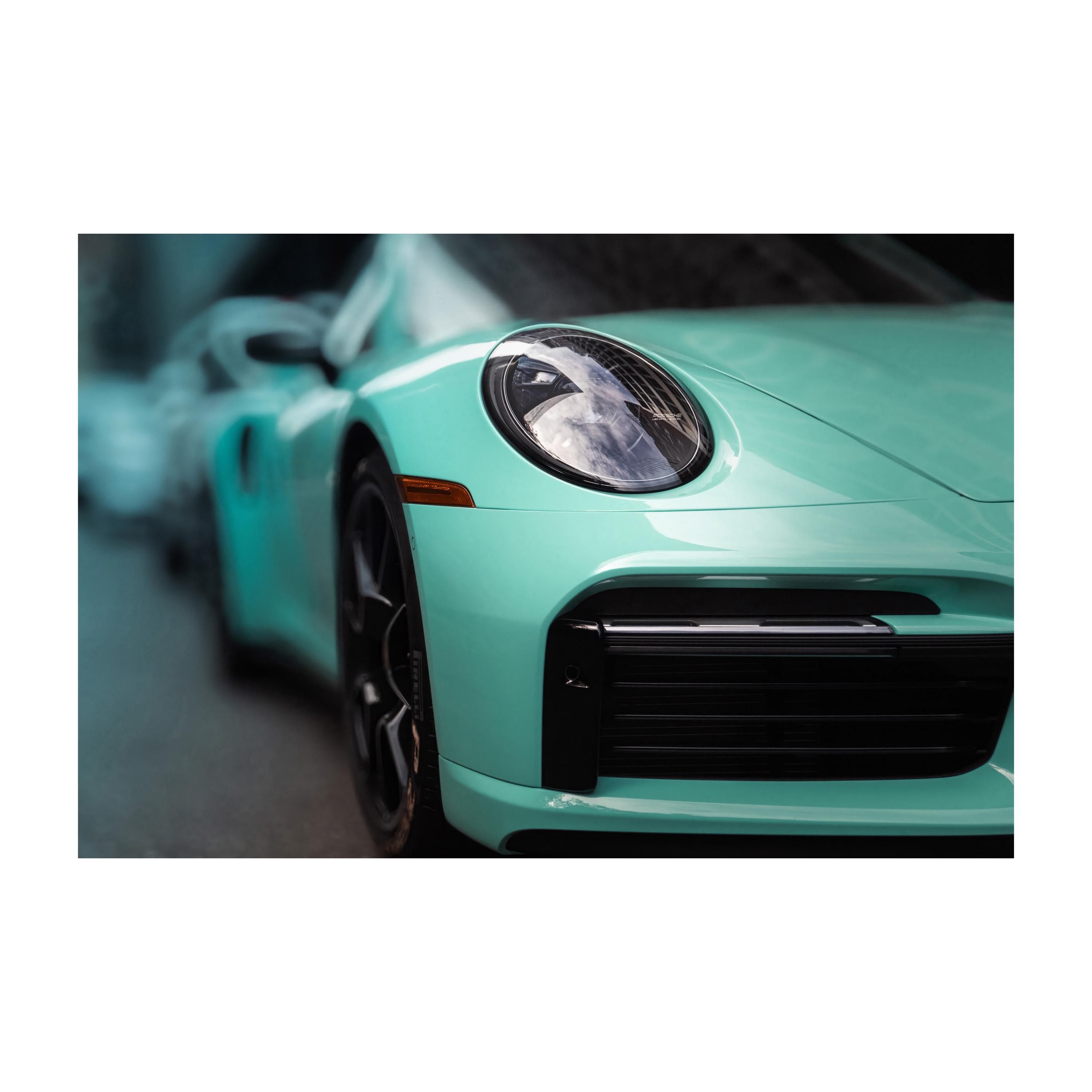 Porsche 911 Turbo S print, luxury car wall art, mint green Porsche poster, sports car photography, modern automotive decor, luxury car enthusiasts gift, sleek car wall art, Porsche close-up photo, high-performance car artwork, iconic vehicle poster, luxury decor for car lovers, Turbo S headlight art, mint green car photography, Porsche legacy wall print, contemporary auto art, collector’s car gift print.
