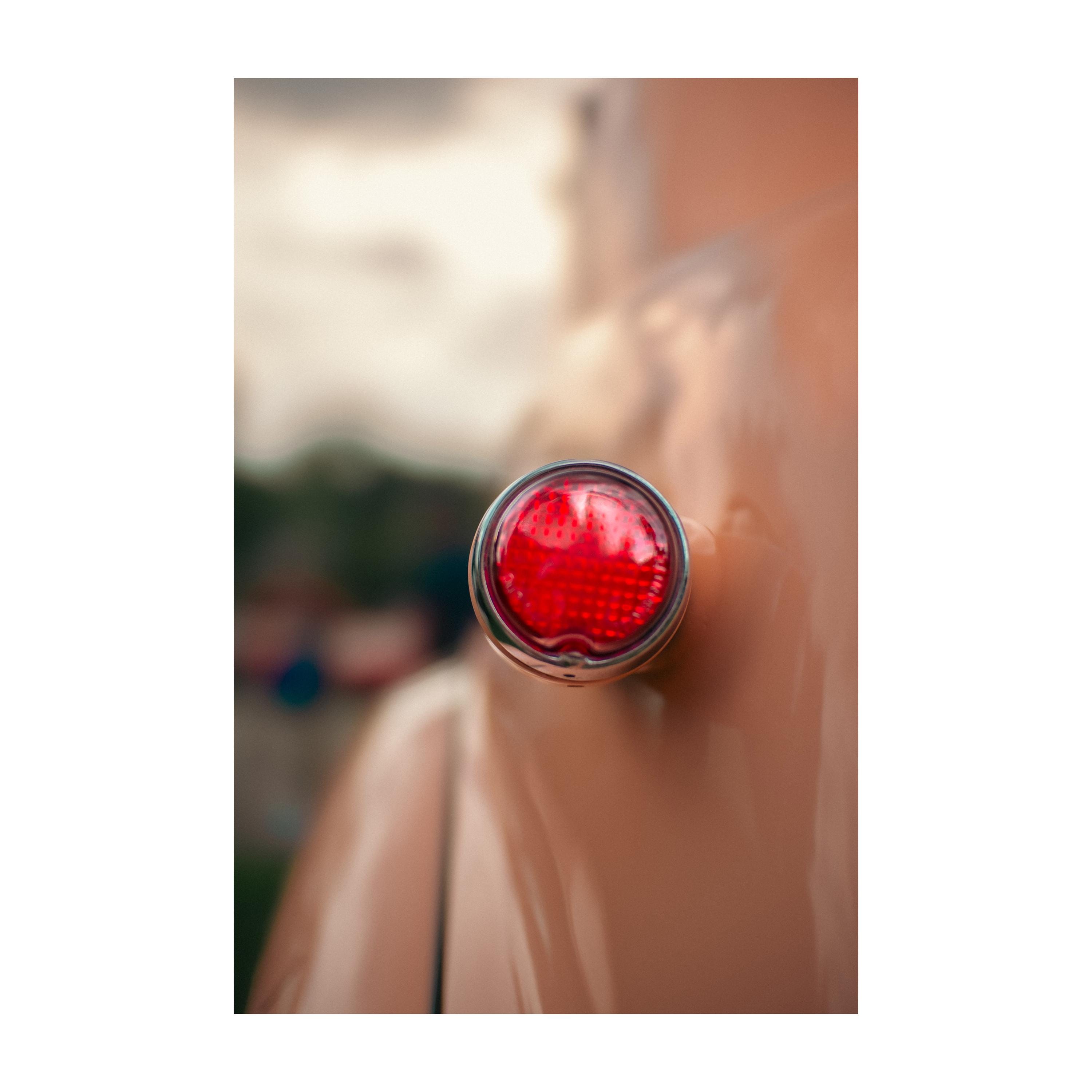 Minimalism with muscle, blended with pop culture charm. This cinematic close-up captures the unmistakable tail light of a 1950s Ford F100 pickup, bringing that classic car decor into your space. The peach orange and salmon color decor on the panel curves like a sculpture under soft ambient light, while the chrome-surrounded red light draws you in with its bold presence. Perfect for adding a touch of automotive decor, it stands out as a unique piece—whether you're searching for car lover gifts, seeking pink decor ideas, or simply appreciate beautiful details from a design legend.