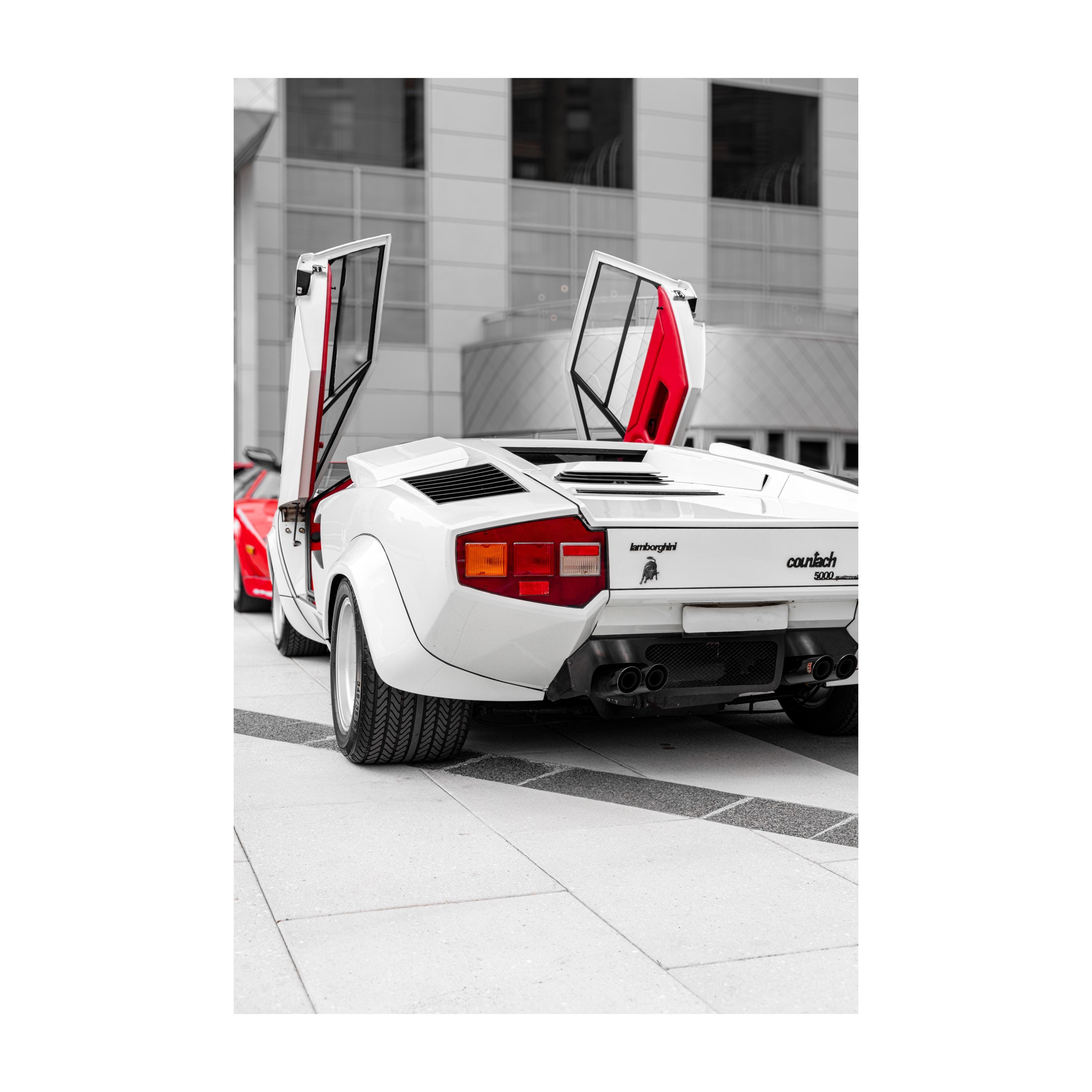 This white Lamborghini Countach 5000 Quattrovalvole flings its scissor doors sky-high while a rival red Countach waits in the wings. Shot in crisp detail by internationally published photographer Gil Stunner, the scene fuses brutalist architecture with pure supercar theatre—perfect for collectors who want art that roars.