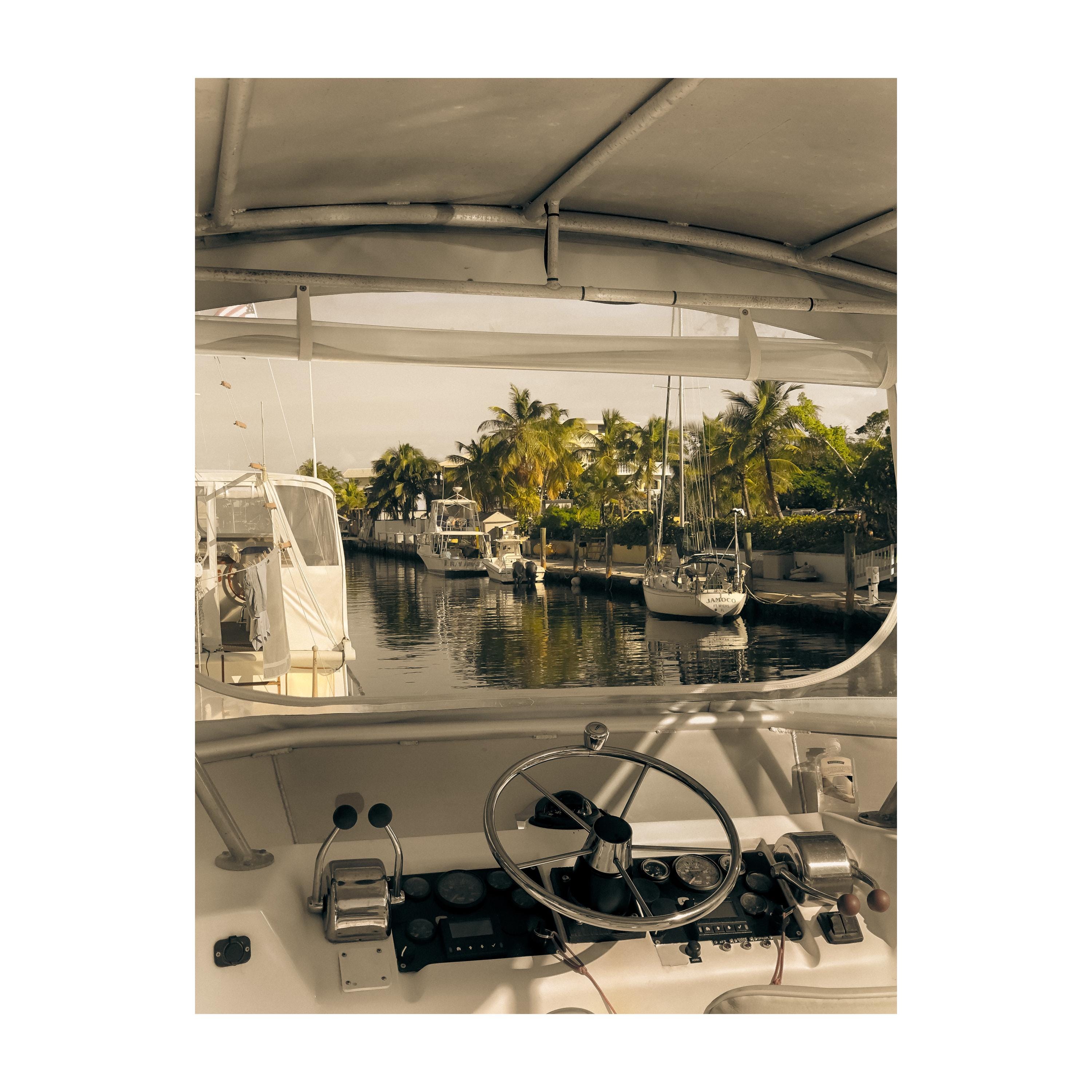 This sepia coastal marina fine art photograph captures the hush of a palm-lined harbor from the boat’s helm, inviting slow tides and sun-warmed daydreams. The vintage-toned finish and glinting instruments bring a refined nautical mood that makes any room feel calm, collected, and a touch adventurous.