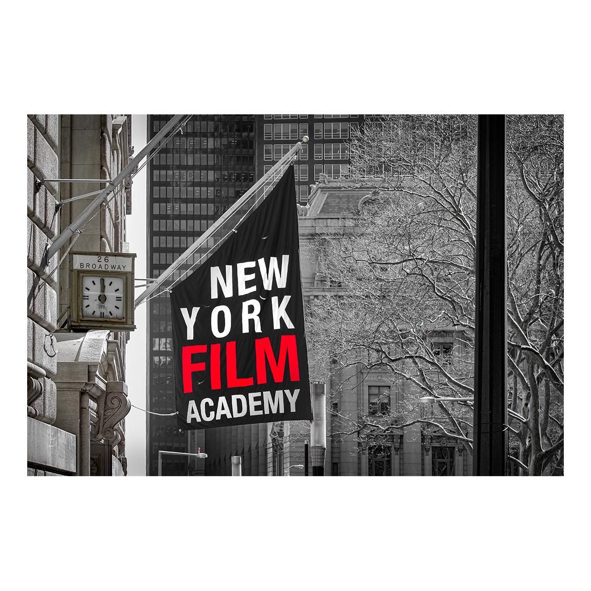 New York Film Academy flag NYC street photograph—a bold, modern city print where crisp black and white architecture frames a striking red accent. The Broadway clock, winter tree lines, and towering façades create a premium, editorial vibe that energizes offices, studios, and contemporary homes while celebrating Manhattan’s creative spirit.