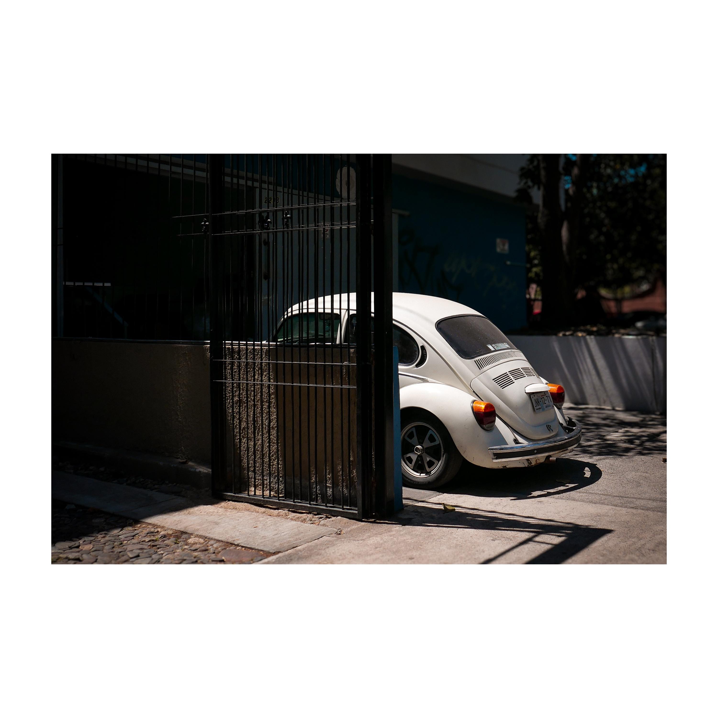 A sun-splashed classic Beetle tucked behind an iron gate—graphic shadows, creamy highlights, and timeless curves. This cinematic street scene blends minimal geometry with vintage auto charm, perfect for a garage lounge, modern loft, or mid-century inspired room.