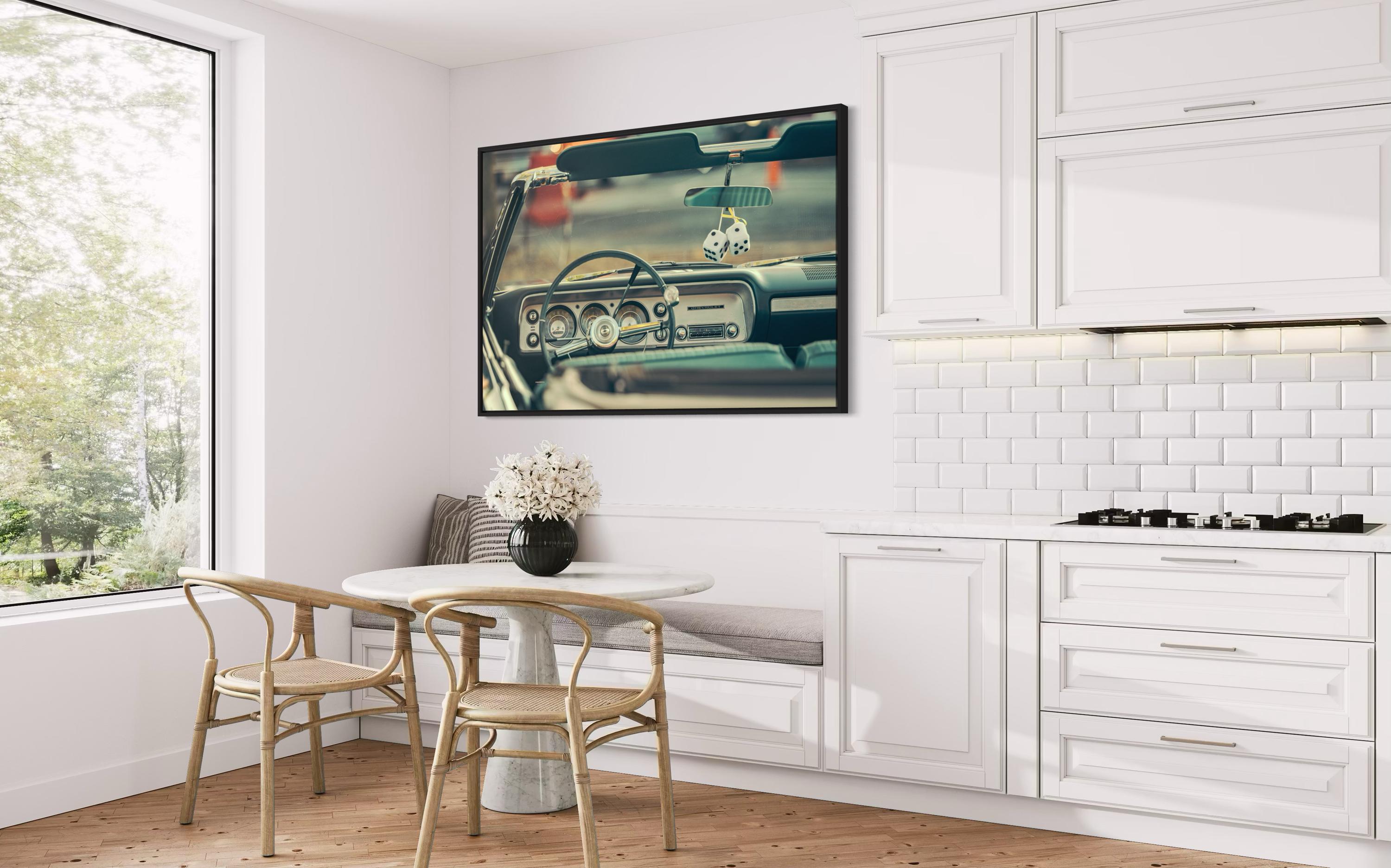 Slip behind the wheel of a 1963–1964 Chevrolet Impala convertible—chrome horn ring, deep-set round gauges, and a pair of iconic fuzzy dice swinging on the mirror. “Fuzzy Dice, Chevy Vibes” is a nostalgic, garage-ready fine art photograph that celebrates mid-century American cruising culture. Printed as an open edition giclée with archival inks for gallery color and heirloom longevity, it’s perfect for classic-car lovers, retro dens, offices, studios, and man caves.