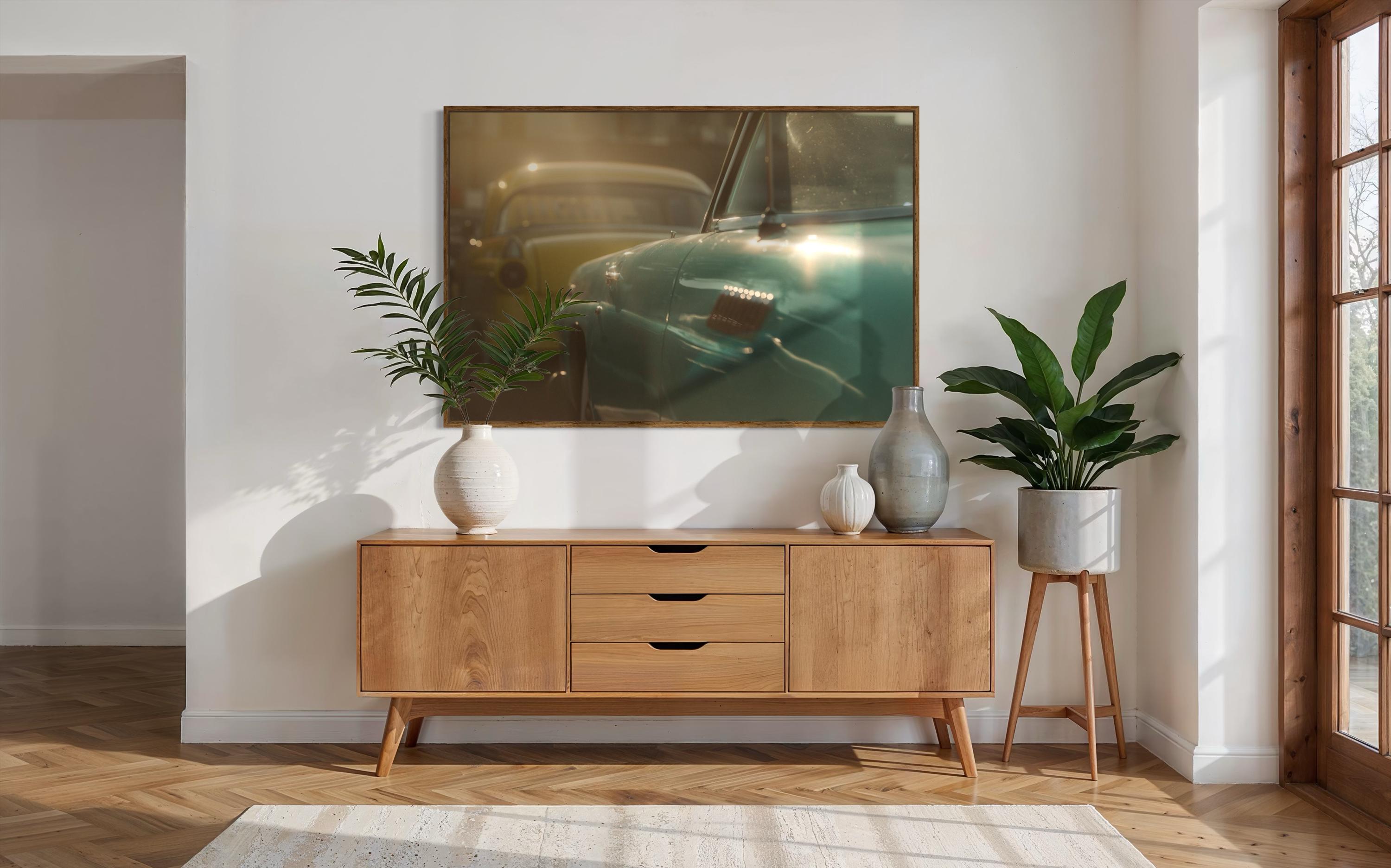 Bathe your walls in warm cruise-night glow. “Golden Hour Fairlanes” captures a teal mid-1950s Ford Fairlane (likely 1956) with another period Ford softly out of focus—two-tone paint, chrome, and pure ’50s sunshine. This open-edition fine art photograph is printed as an archival giclée so collectors and car lovers get rich tones, crisp detail, and longevity fit for a showroom or den.