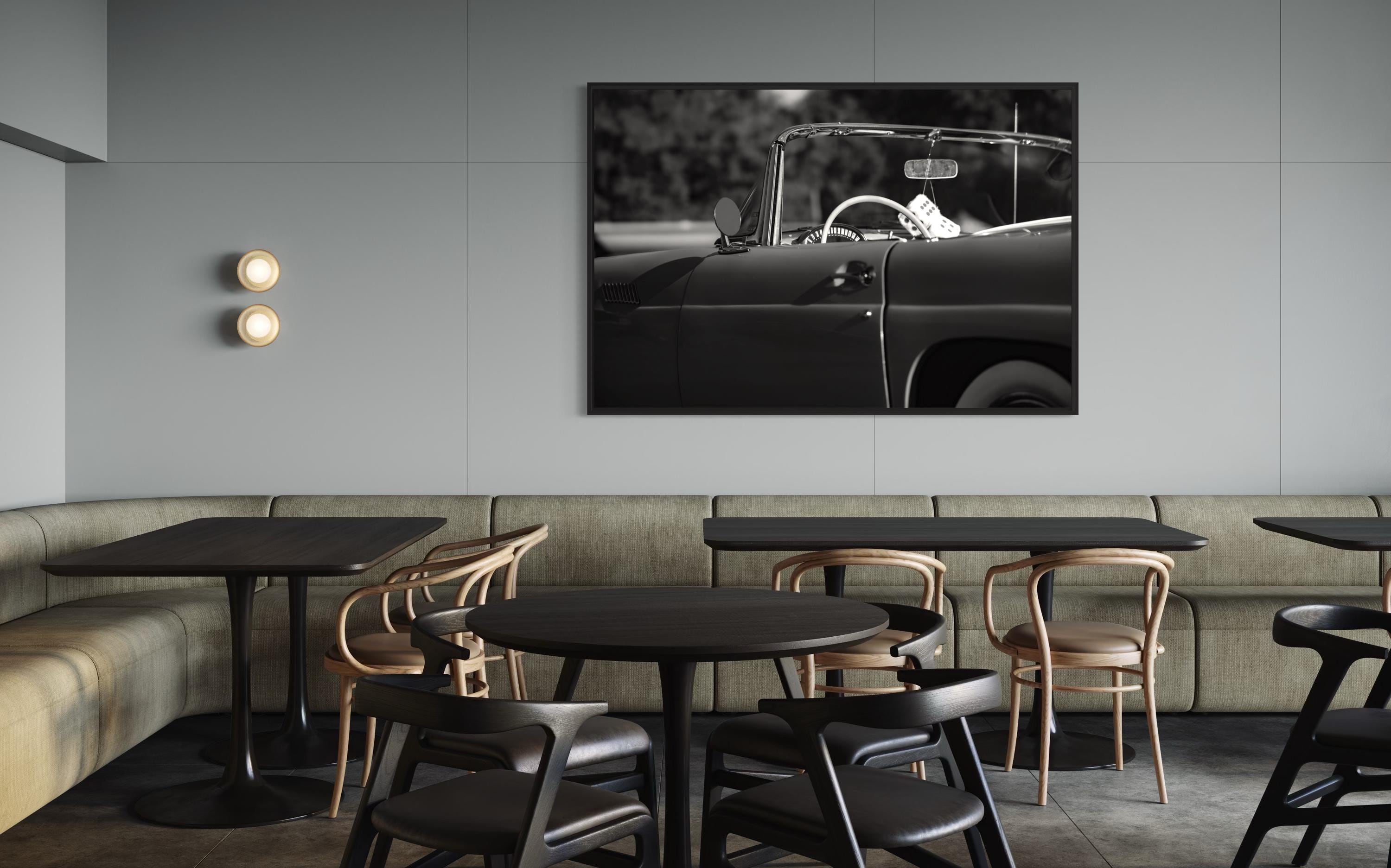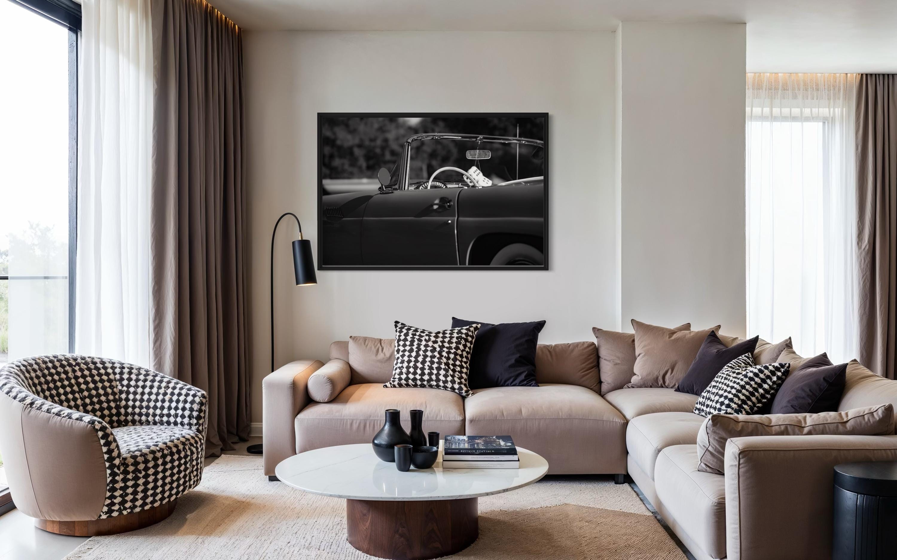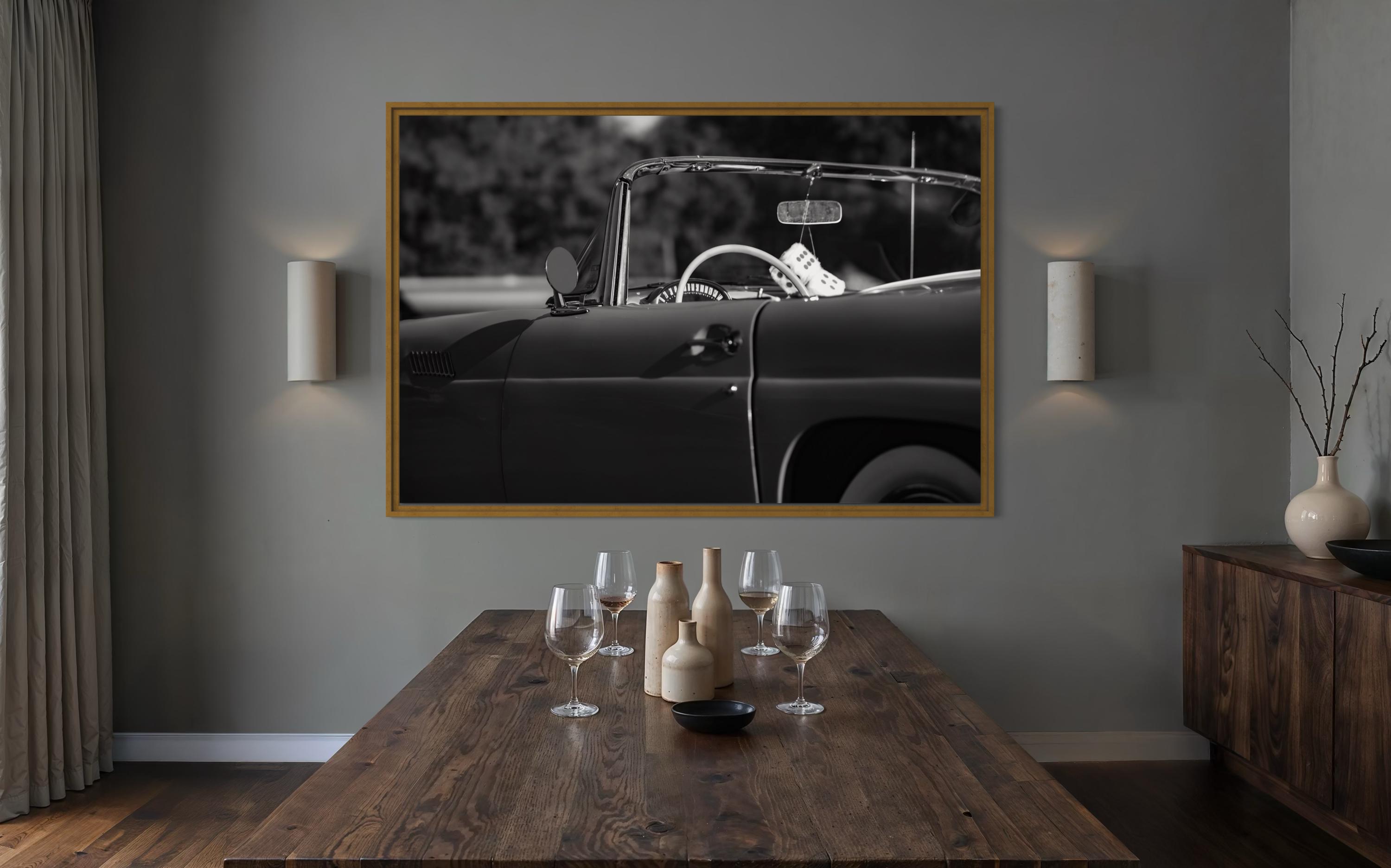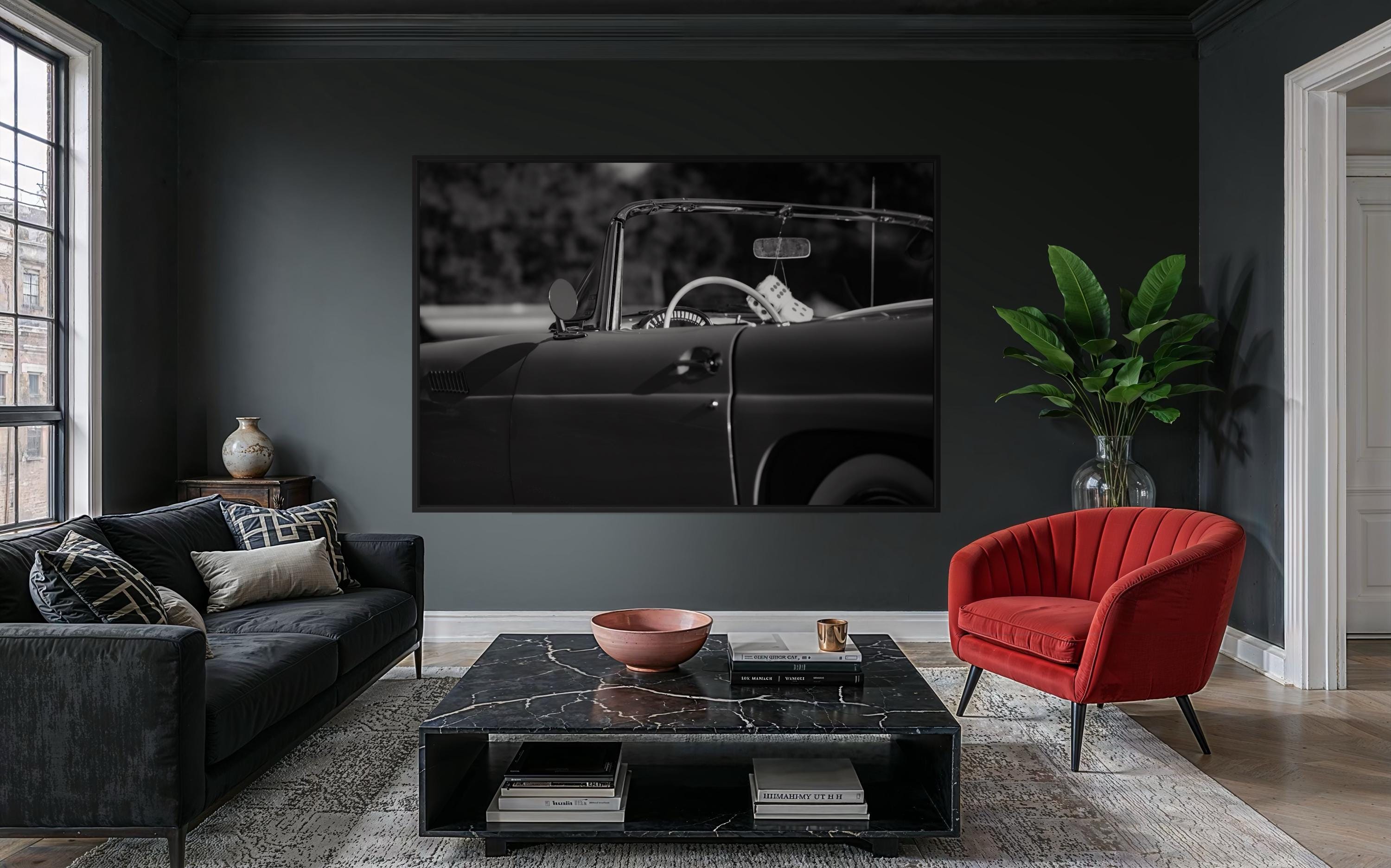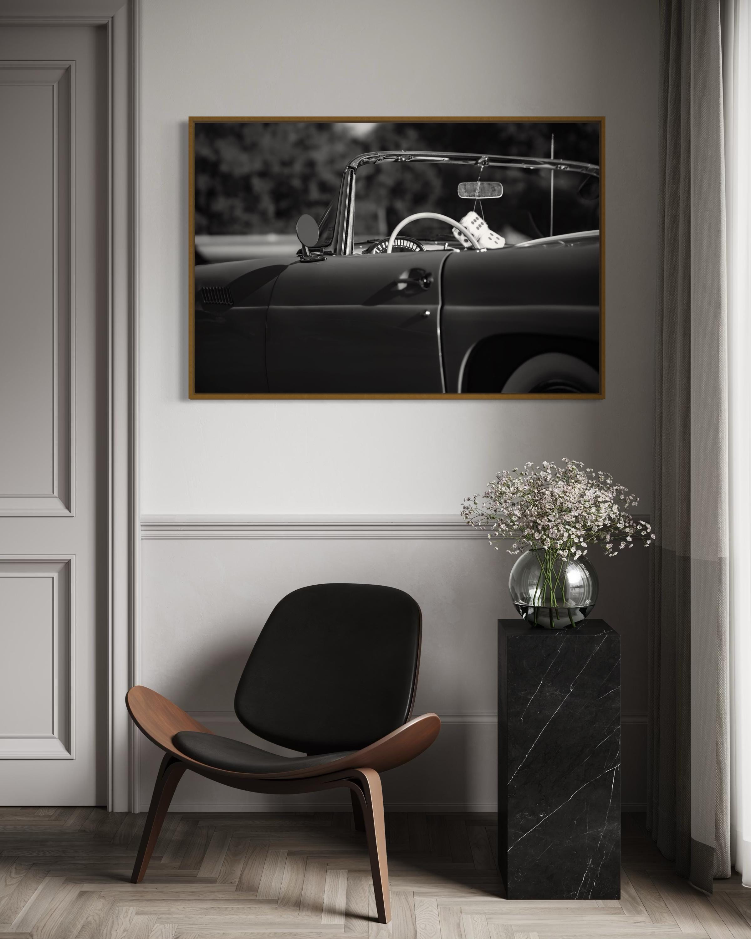 Cruise back to the golden age of motoring. “Dice & Bird” frames a first-gen Ford Thunderbird cockpit in rich black-and-white—the chrome windshield surround, thin-rim wheel, sweeping semicircle speedometer, and a pair of lucky fuzzy dice set the tone. This classic-car photograph adds timeless midcentury style to living rooms, offices, garages, and man caves, and pairs beautifully with modern or retro interiors.