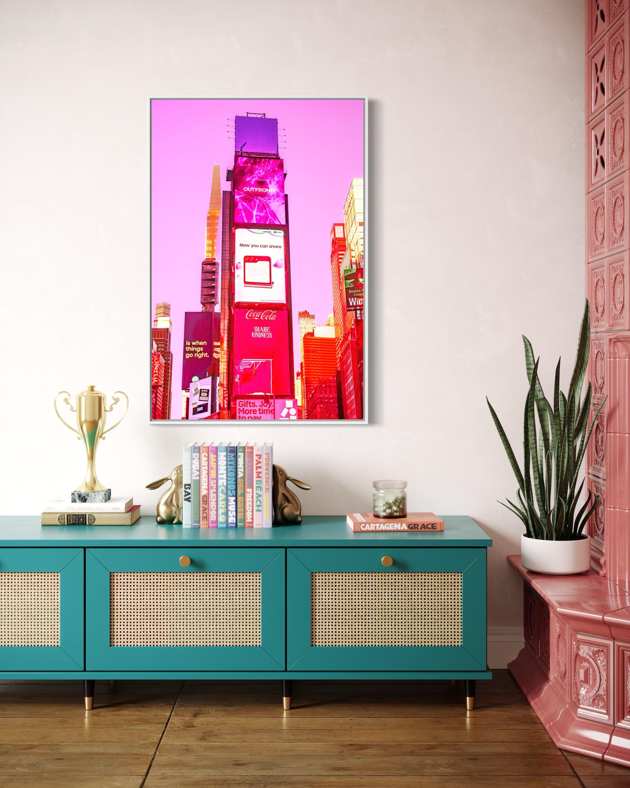 Turn up the volume on your walls. “Times Square Neon Pop” captures Manhattan’s most famous crossroads in electrifying pinks and reds—graphic billboards, gleaming towers, and that unmistakable NYC energy. Printed as a fine-art giclée for crisp detail and rich color, this vertical statement piece is perfect for living rooms, offices, studios, or modern dorm decor.