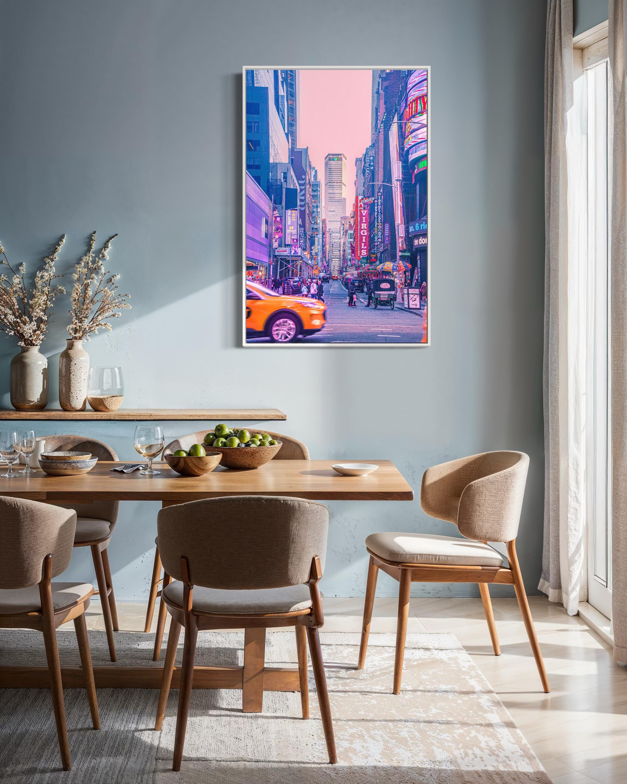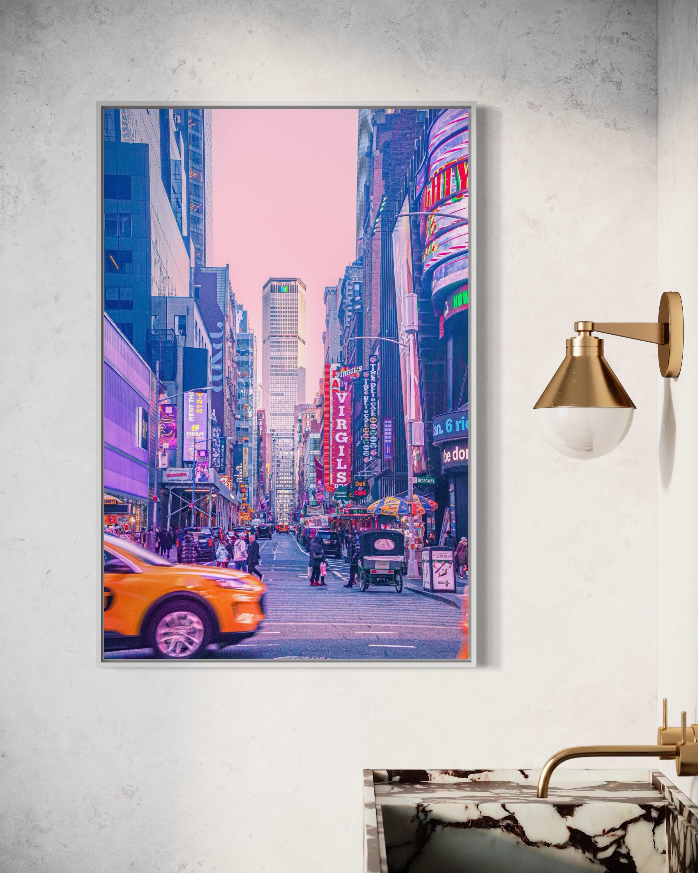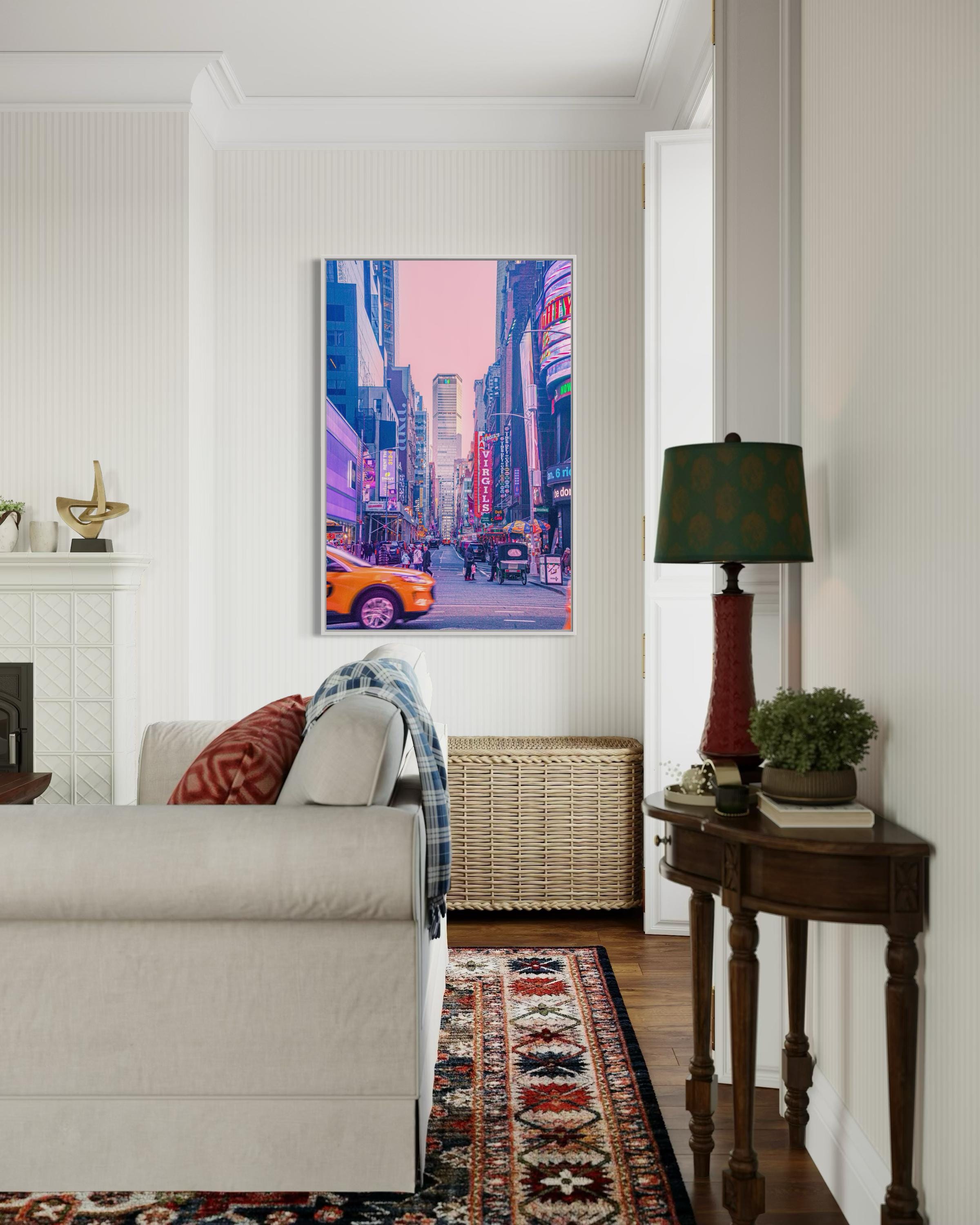 Bring Manhattan’s buzz home. “Times Square Pink City” is a bold, color-washed take on NYC—pink sky, glowing signage, a classic yellow cab streaking along Broadway, and the high-rise canyon that defines Times Square. Printed as a fine-art giclée for crisp detail and rich color, this vertical statement piece energizes living rooms, studios, offices and modern dorms.