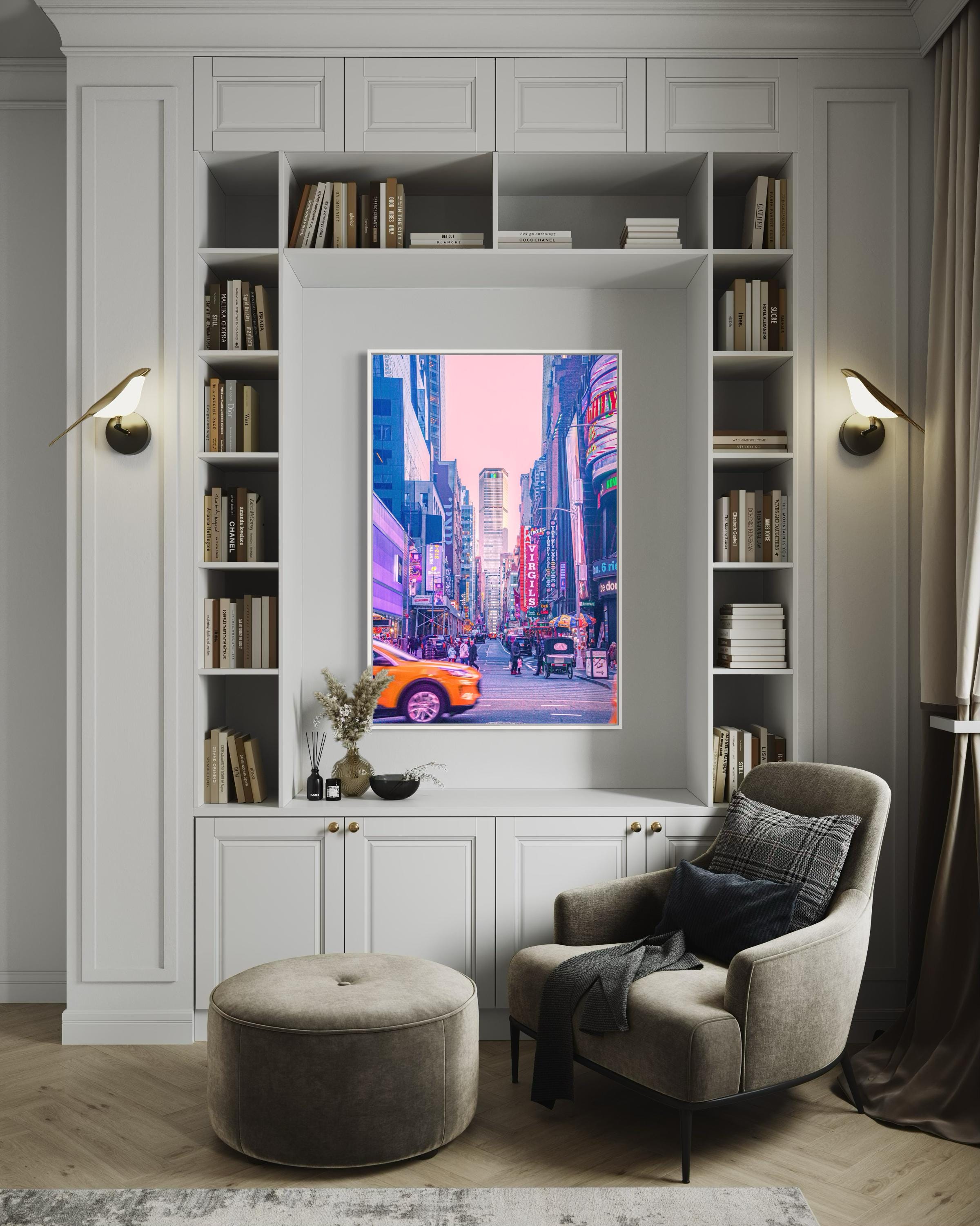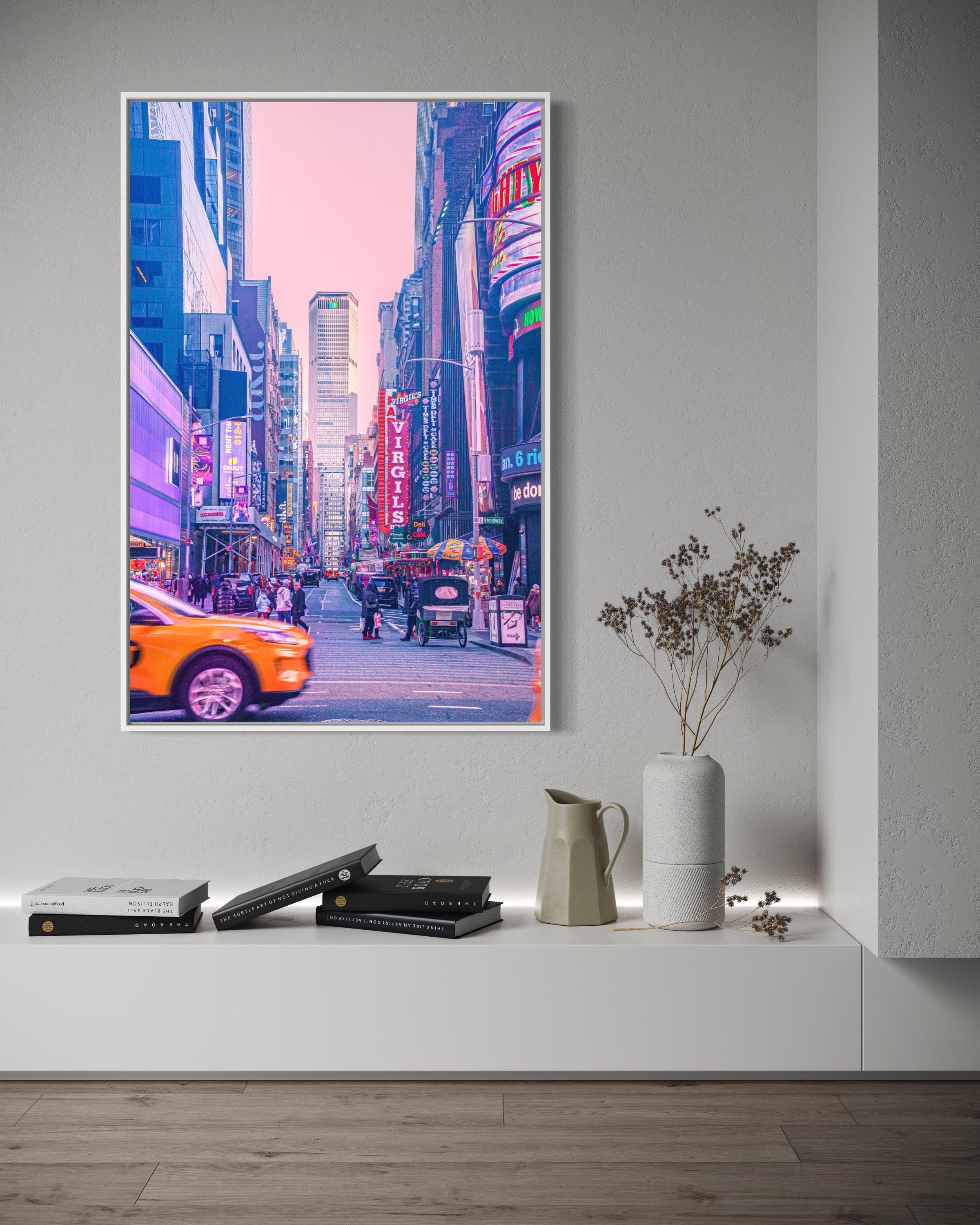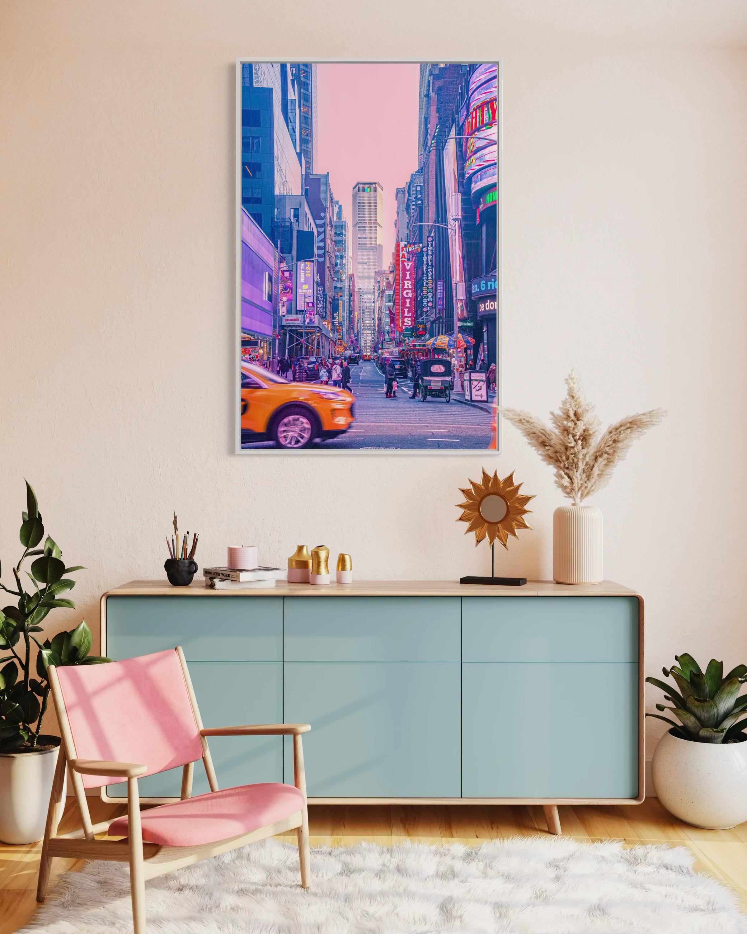 Bring Manhattan’s buzz home. “Times Square Pink City” is a bold, color-washed take on NYC—pink sky, glowing signage, a classic yellow cab streaking along Broadway, and the high-rise canyon that defines Times Square. Printed as a fine-art giclée for crisp detail and rich color, this vertical statement piece energizes living rooms, studios, offices and modern dorms.