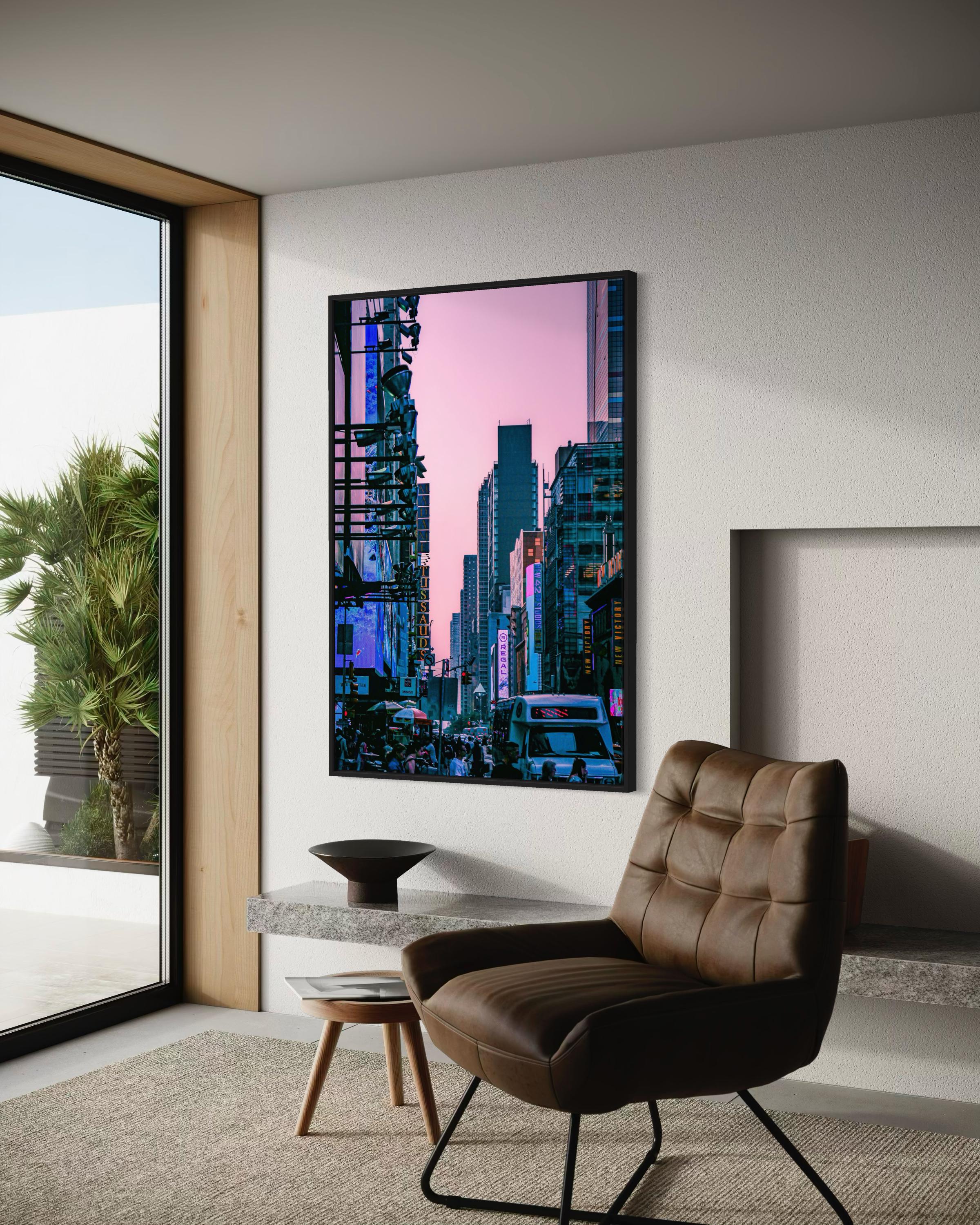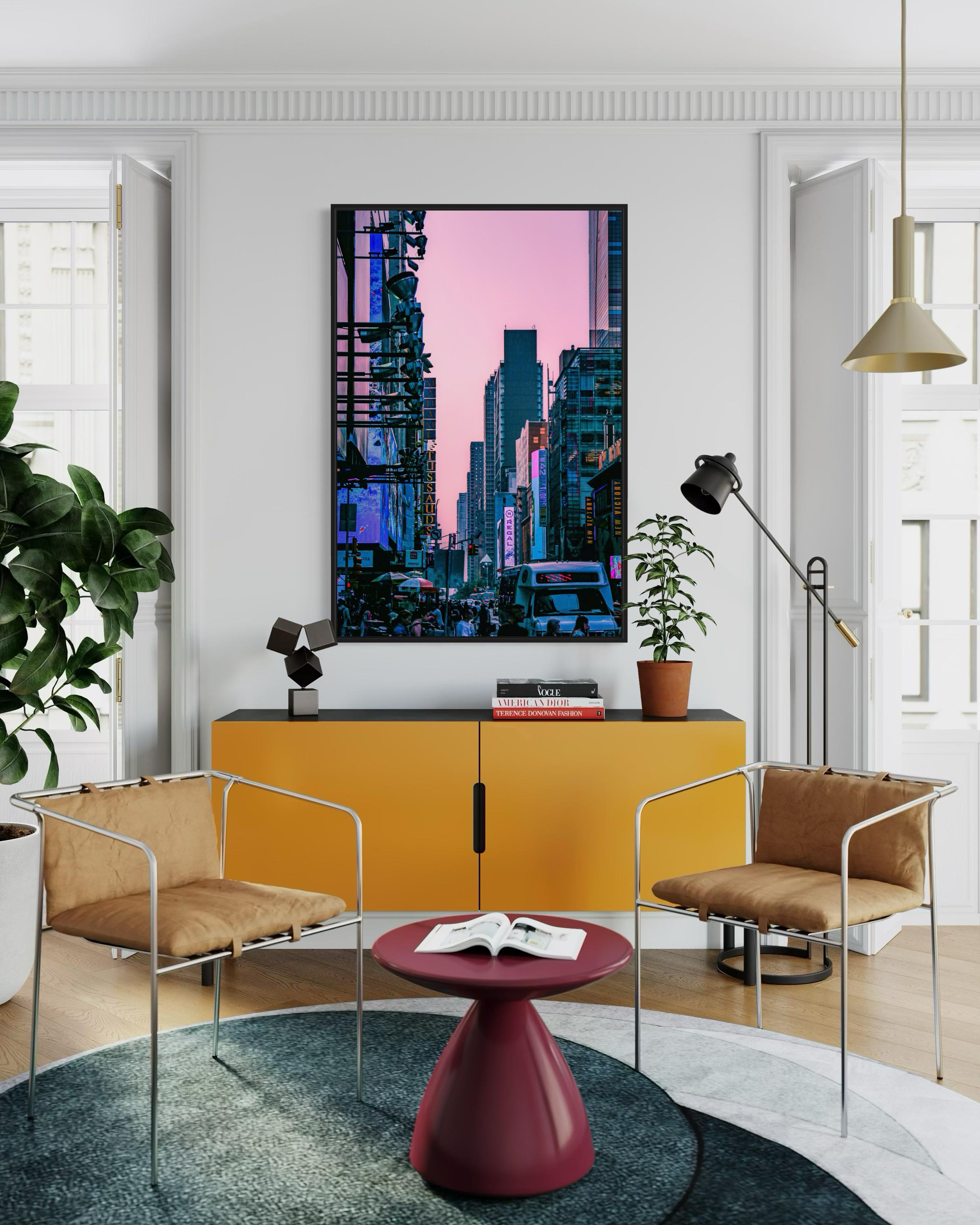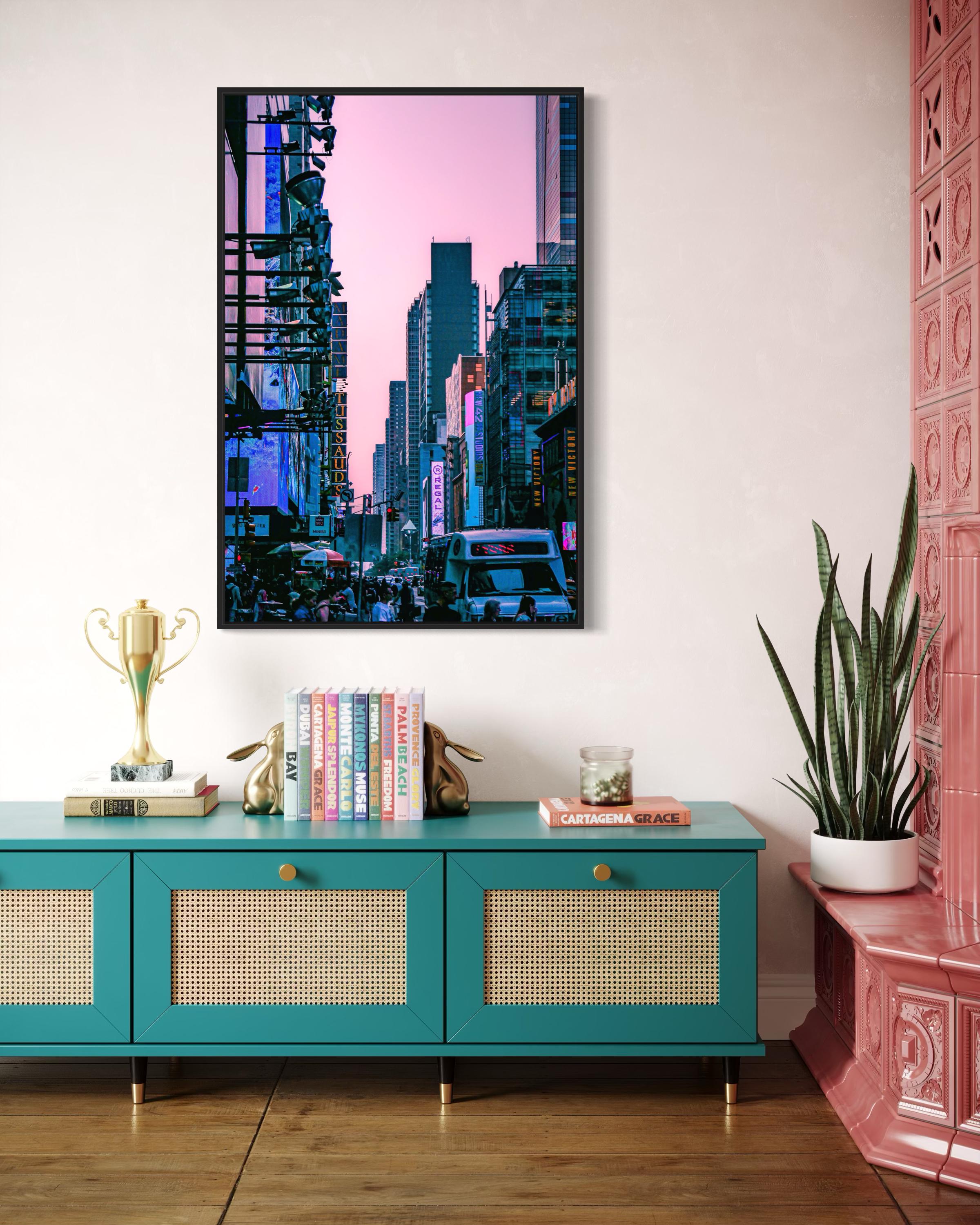 Evening settles over Times Square as a pastel sky glows behind high-rise canyons, marquees, and the bustle of Midtown. This film-inspired color grade turns a classic New York moment into vibrant, modern wall art—perfect for travel lovers, contemporary spaces, and gallery walls.