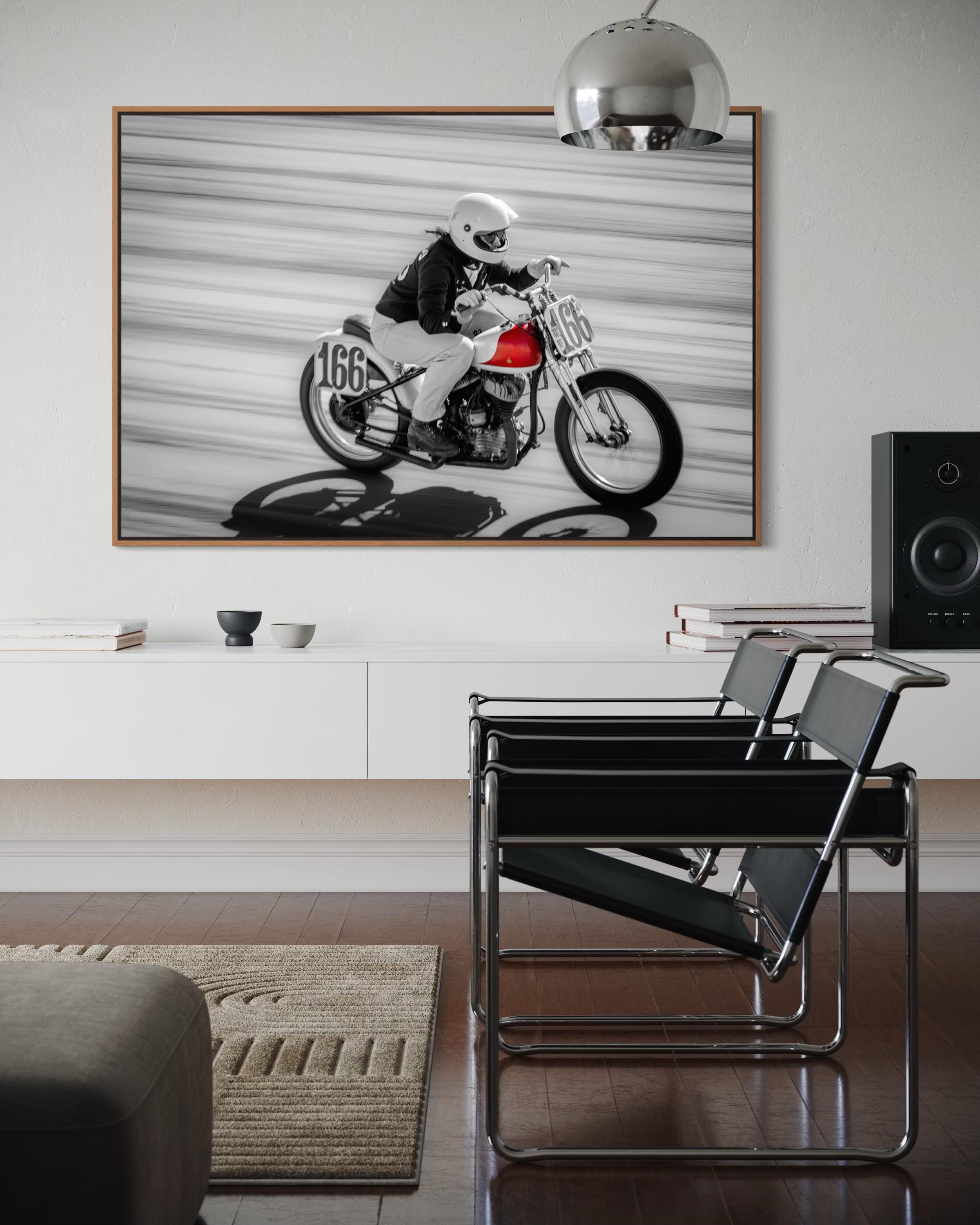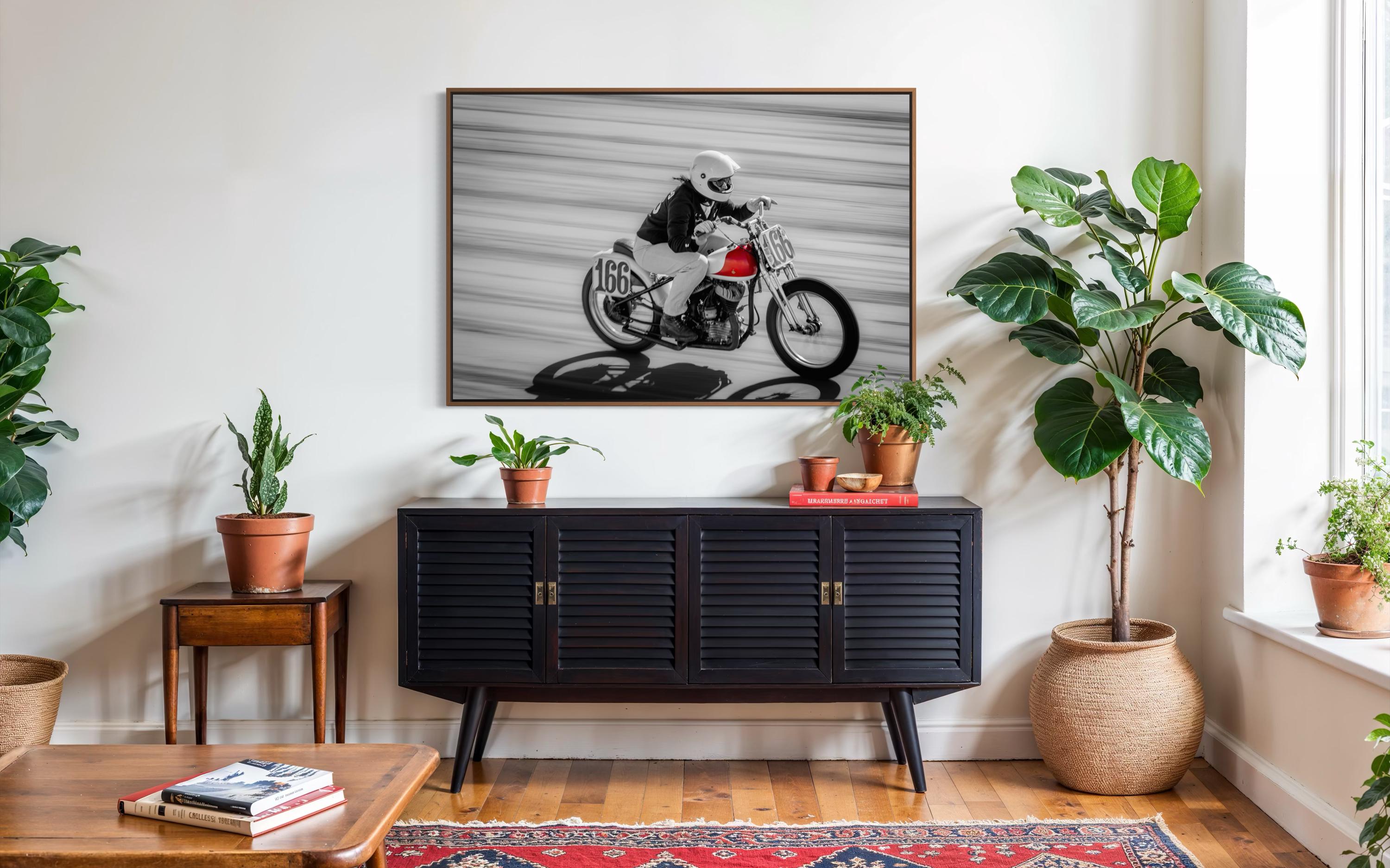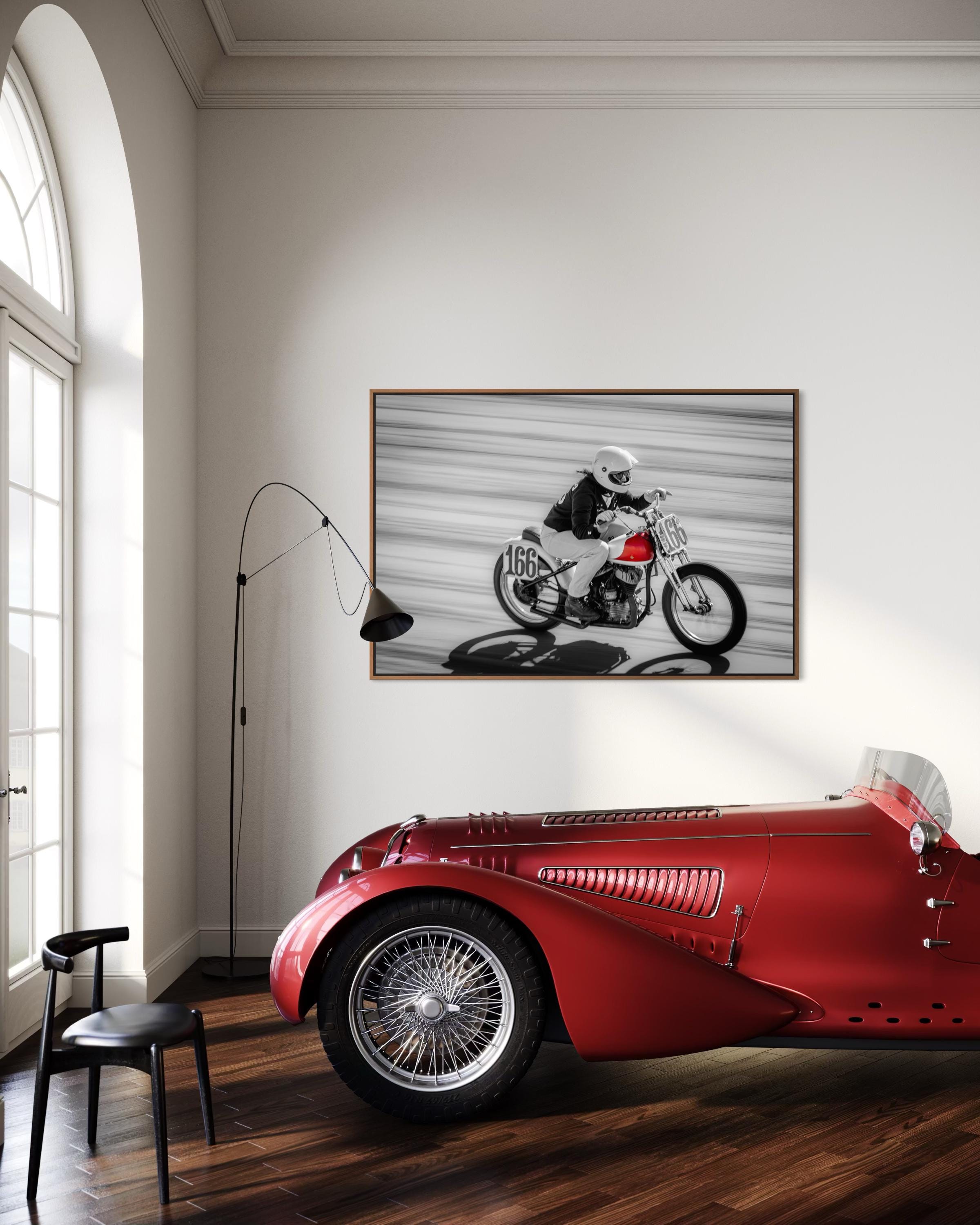 Bold, fast, and fiercely expressive — this Red Tank Motorcycle Print captures a dynamic female racer in full stride at The Race of Gentlemen (TROG). The selective color of the red fuel tank pops against the black-and-white motion blur, making this piece an instant focal point of power, elegance, and vintage speed.