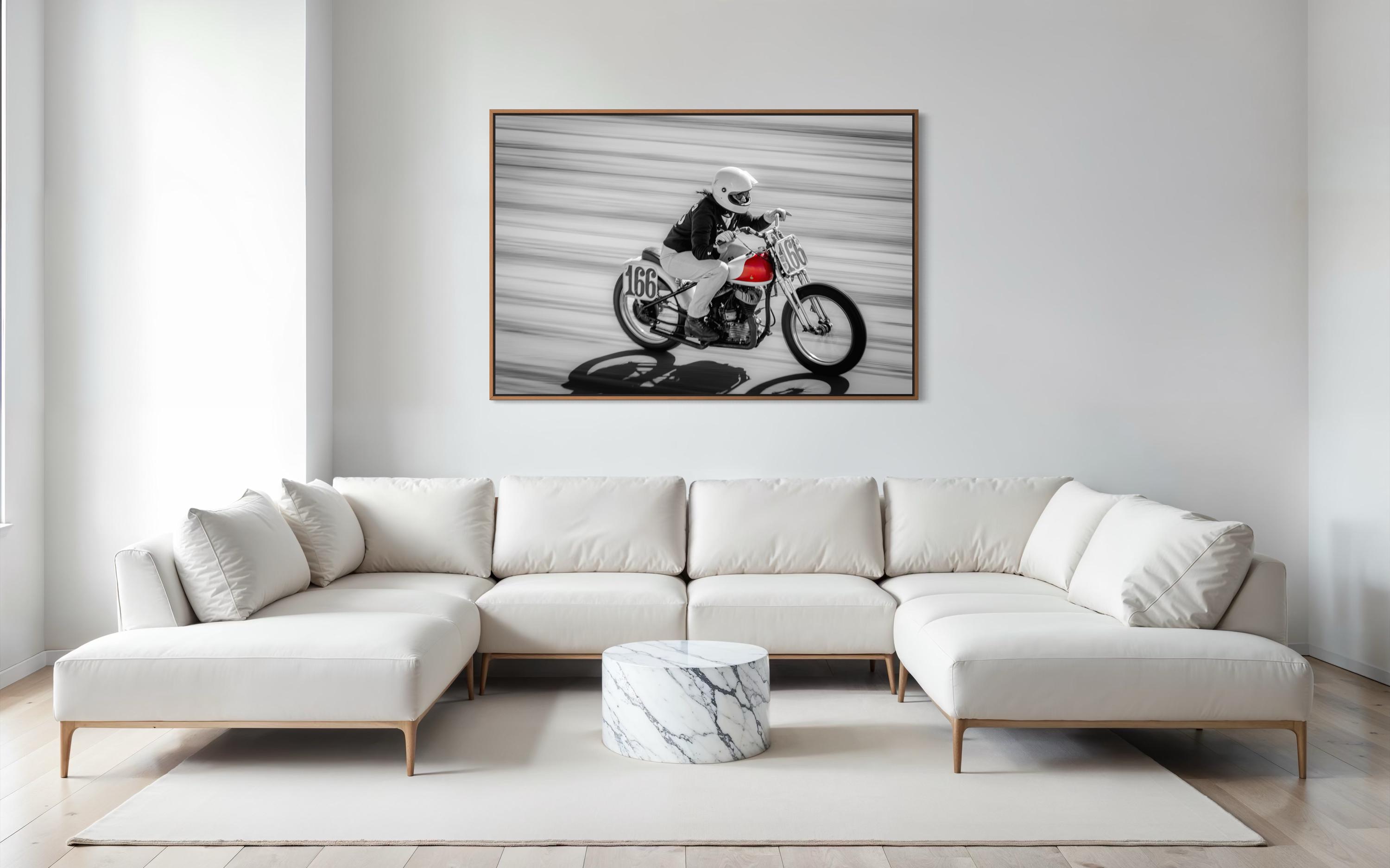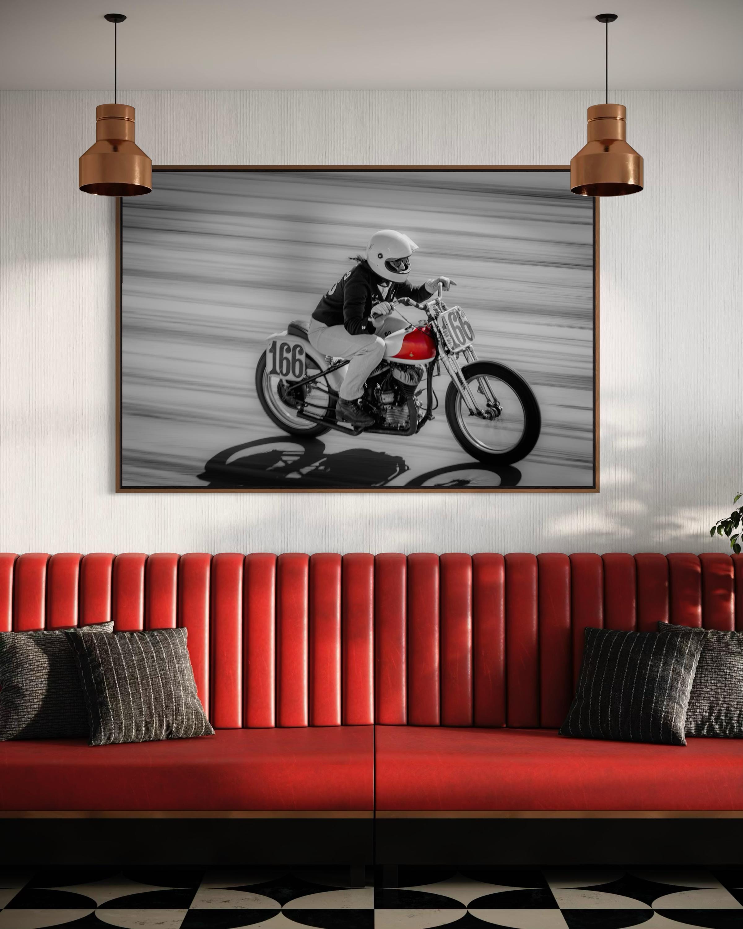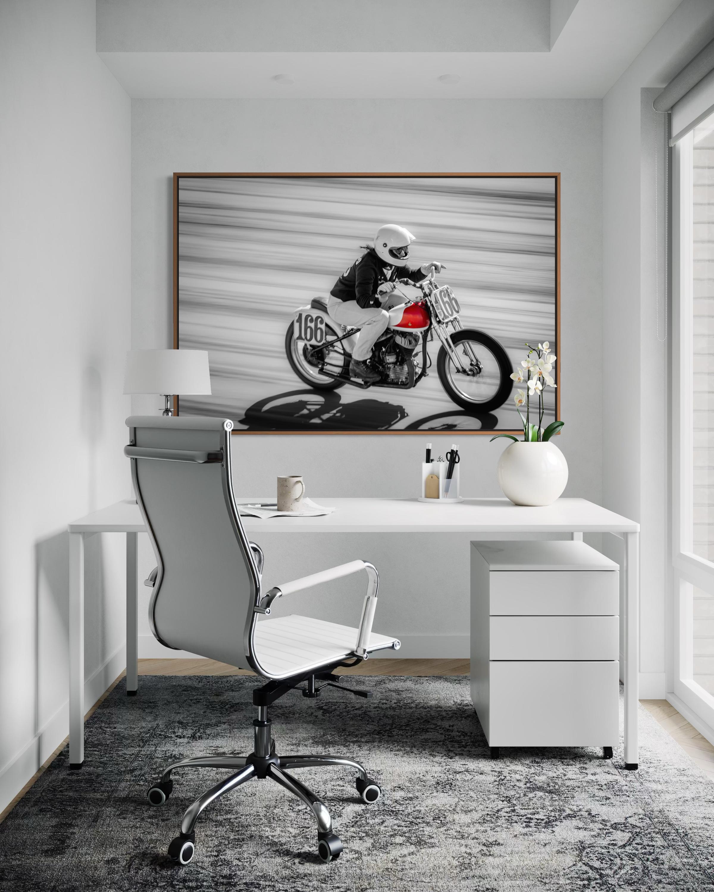 Bold, fast, and fiercely expressive — this Red Tank Motorcycle Print captures a dynamic female racer in full stride at The Race of Gentlemen (TROG). The selective color of the red fuel tank pops against the black-and-white motion blur, making this piece an instant focal point of power, elegance, and vintage speed.