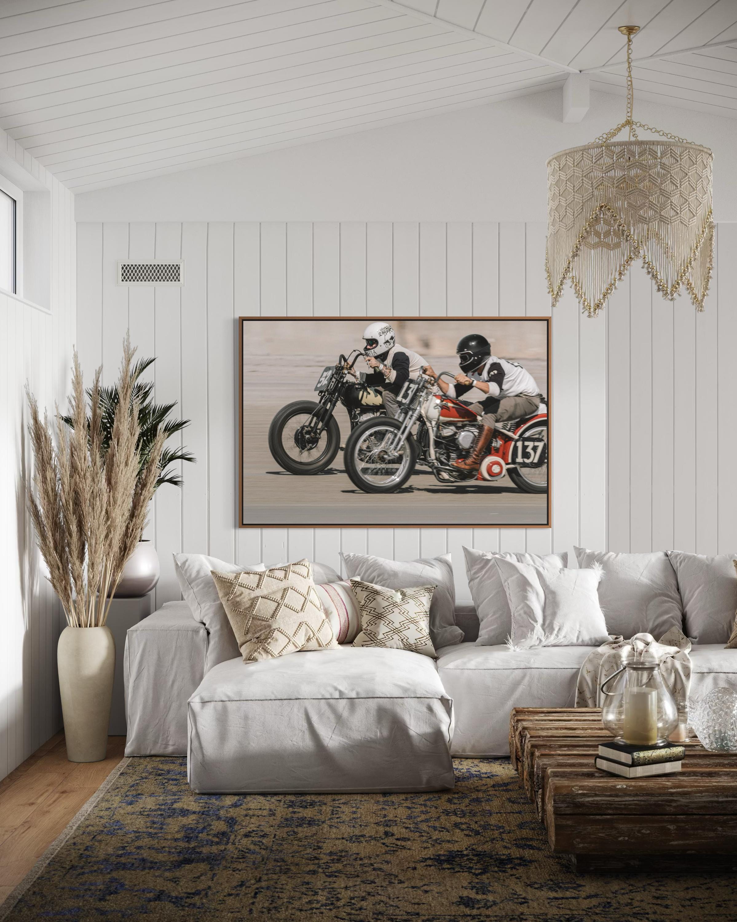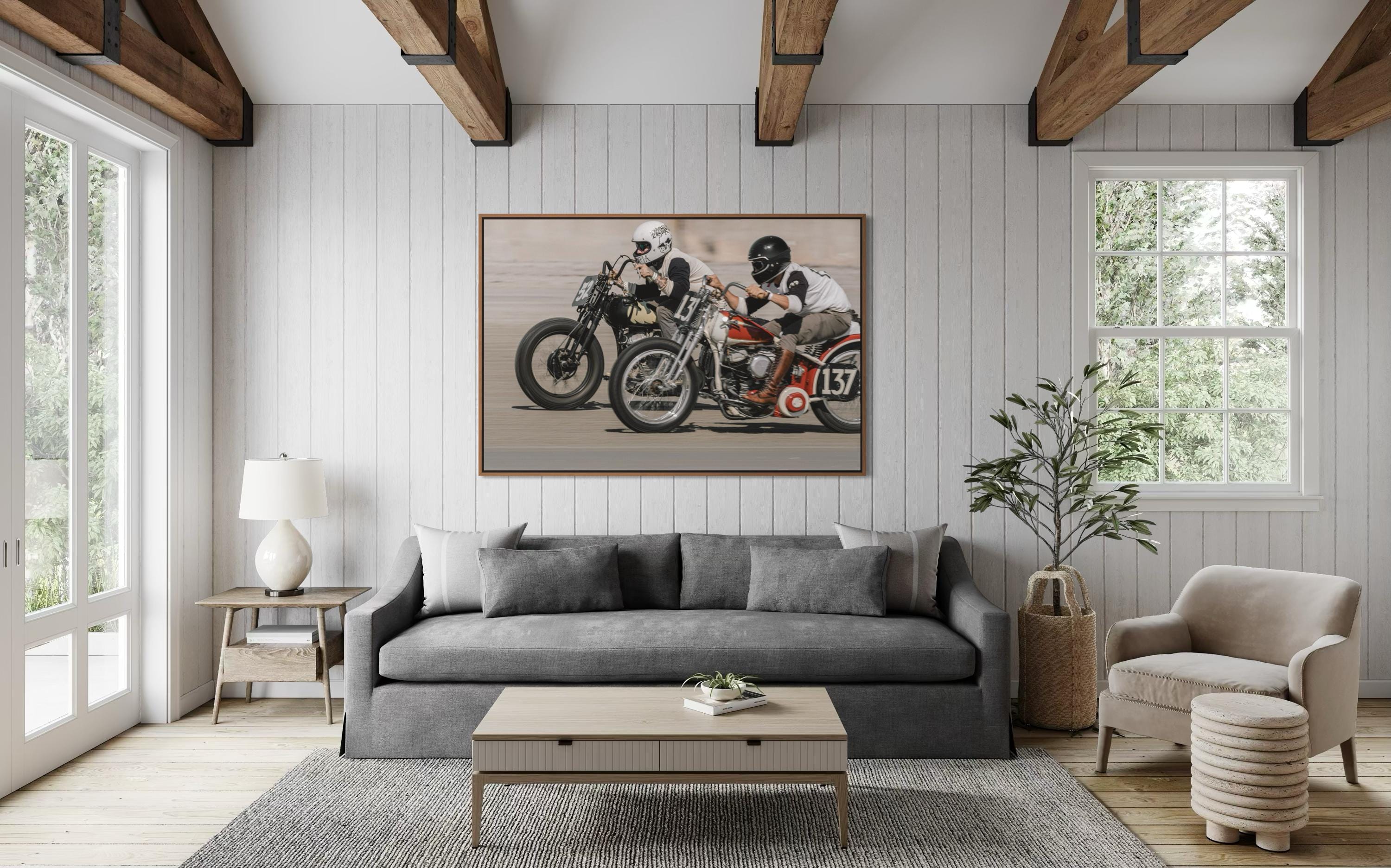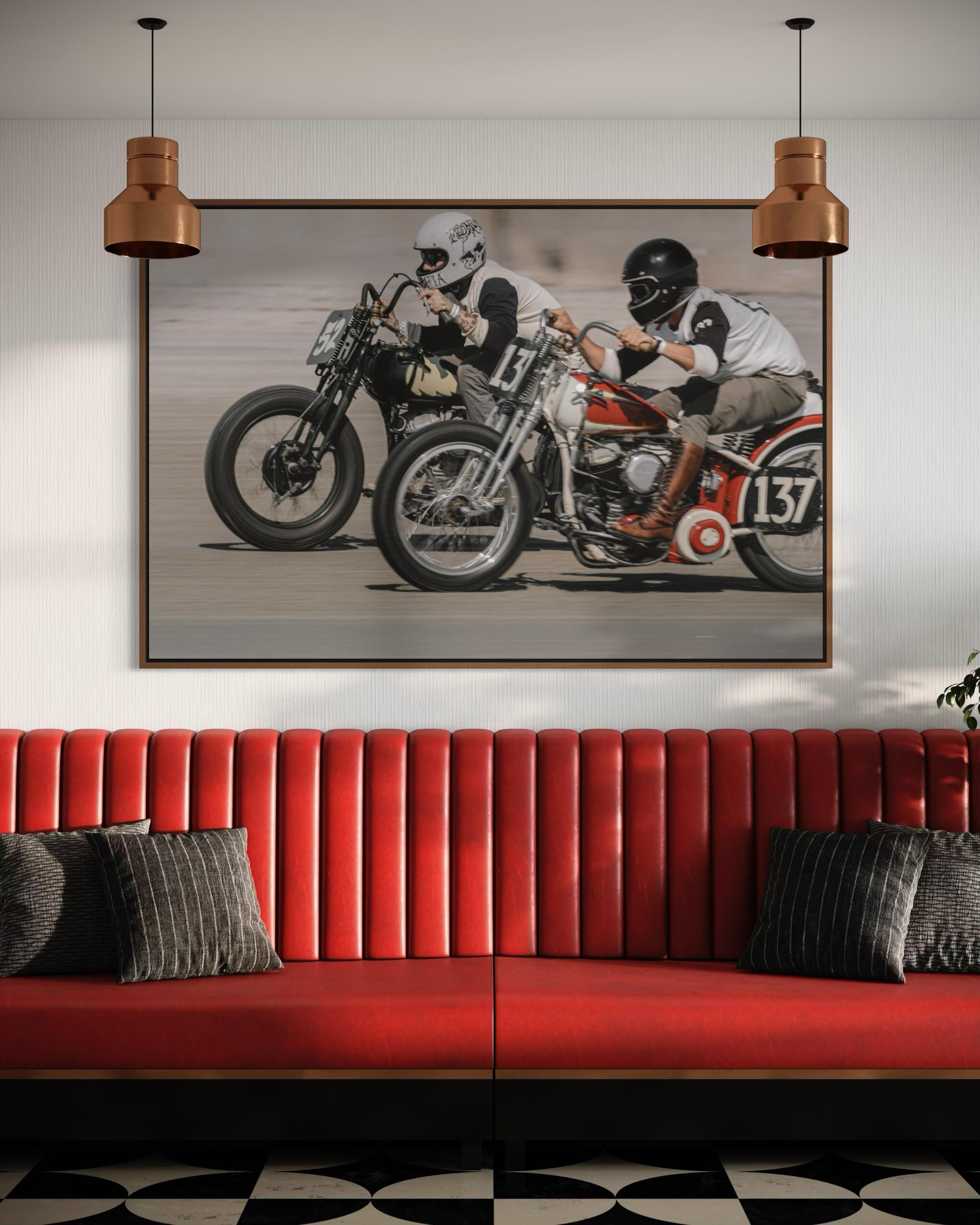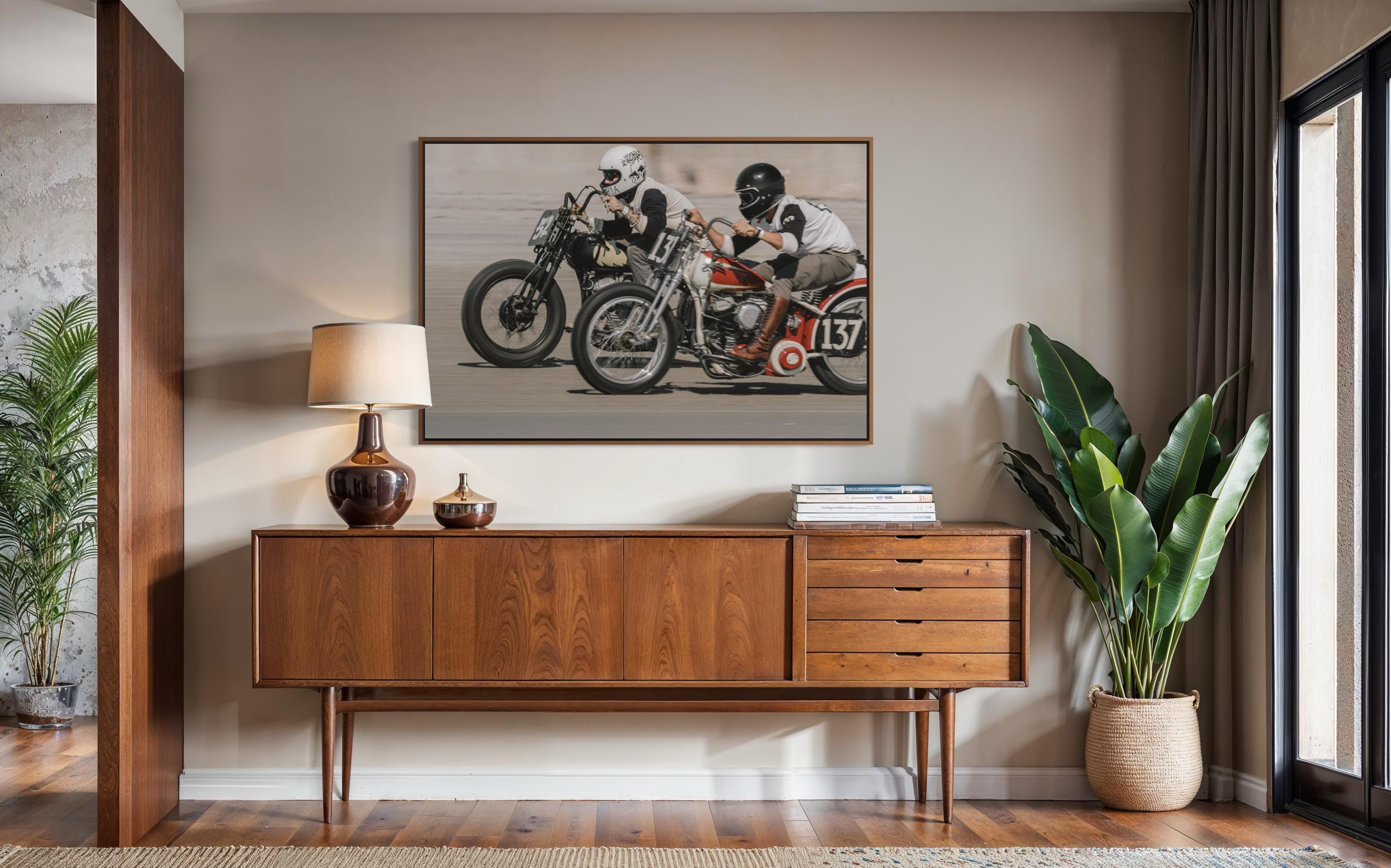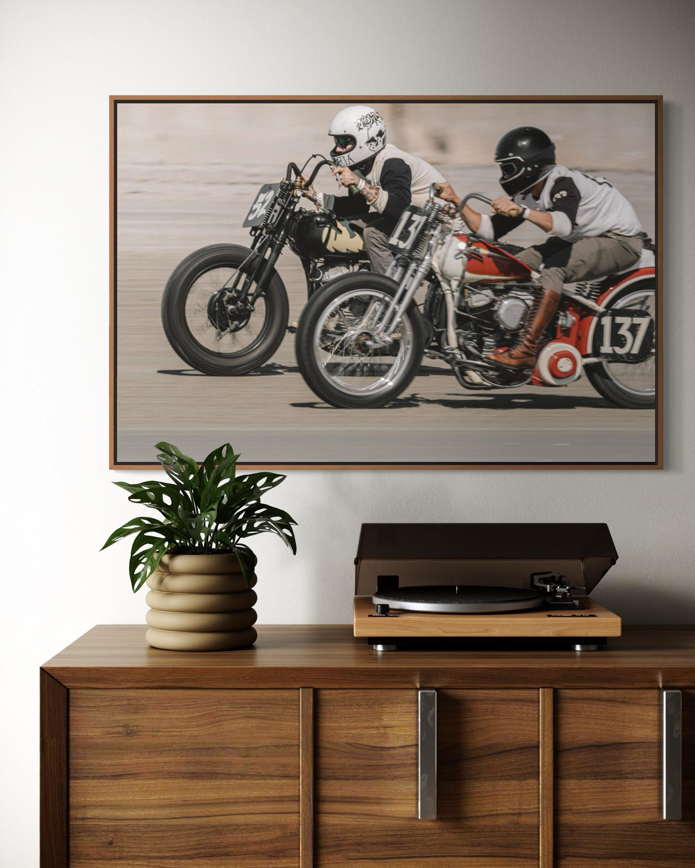 Speed. Style. Rivalry. This Side by Side Motorcycle Racing Print captures two vintage racers pushing their machines to the edge during The Race of Gentlemen (TROG). With crisp detail, motion blur, and authentic 20th-century style, this piece tells a story of adrenaline and raw mechanics on the sands of Wildwood.