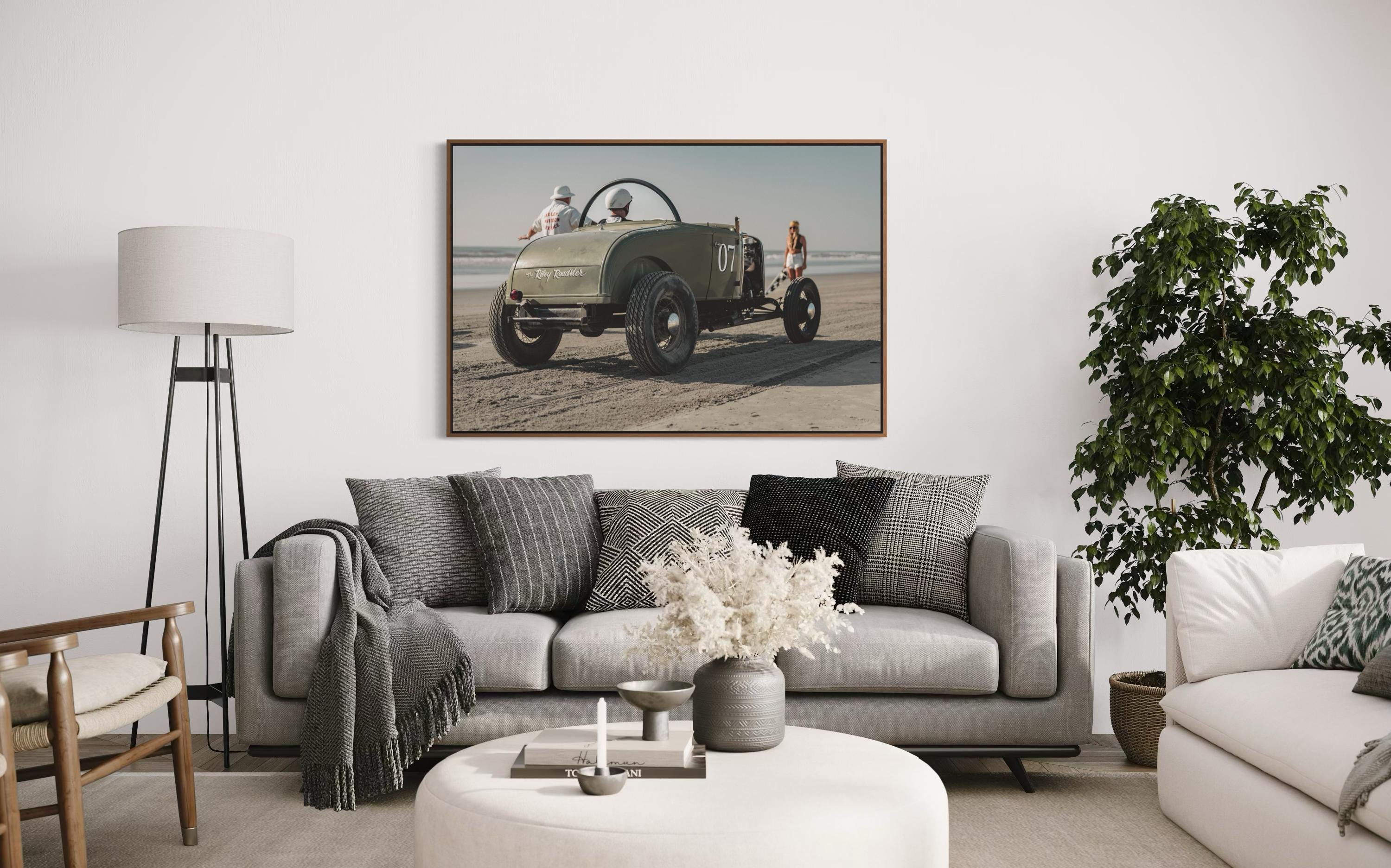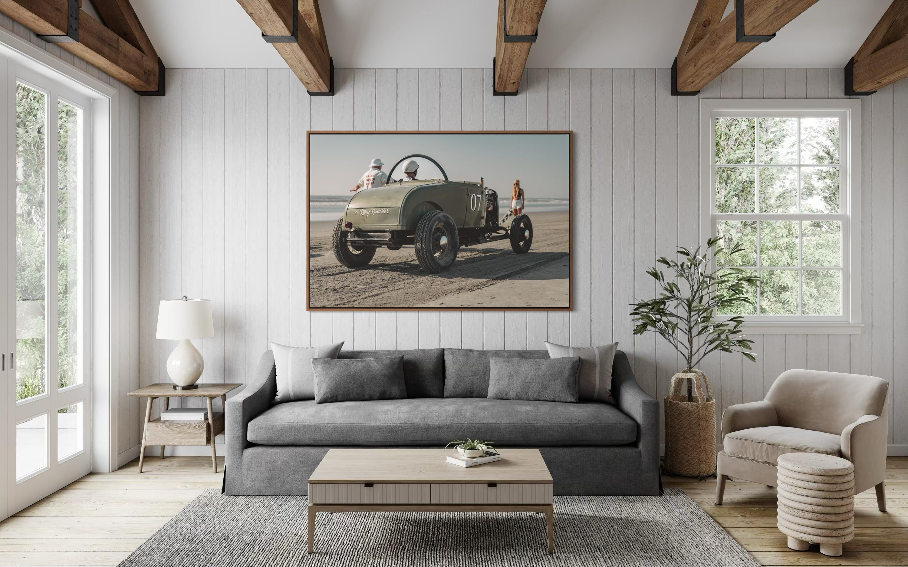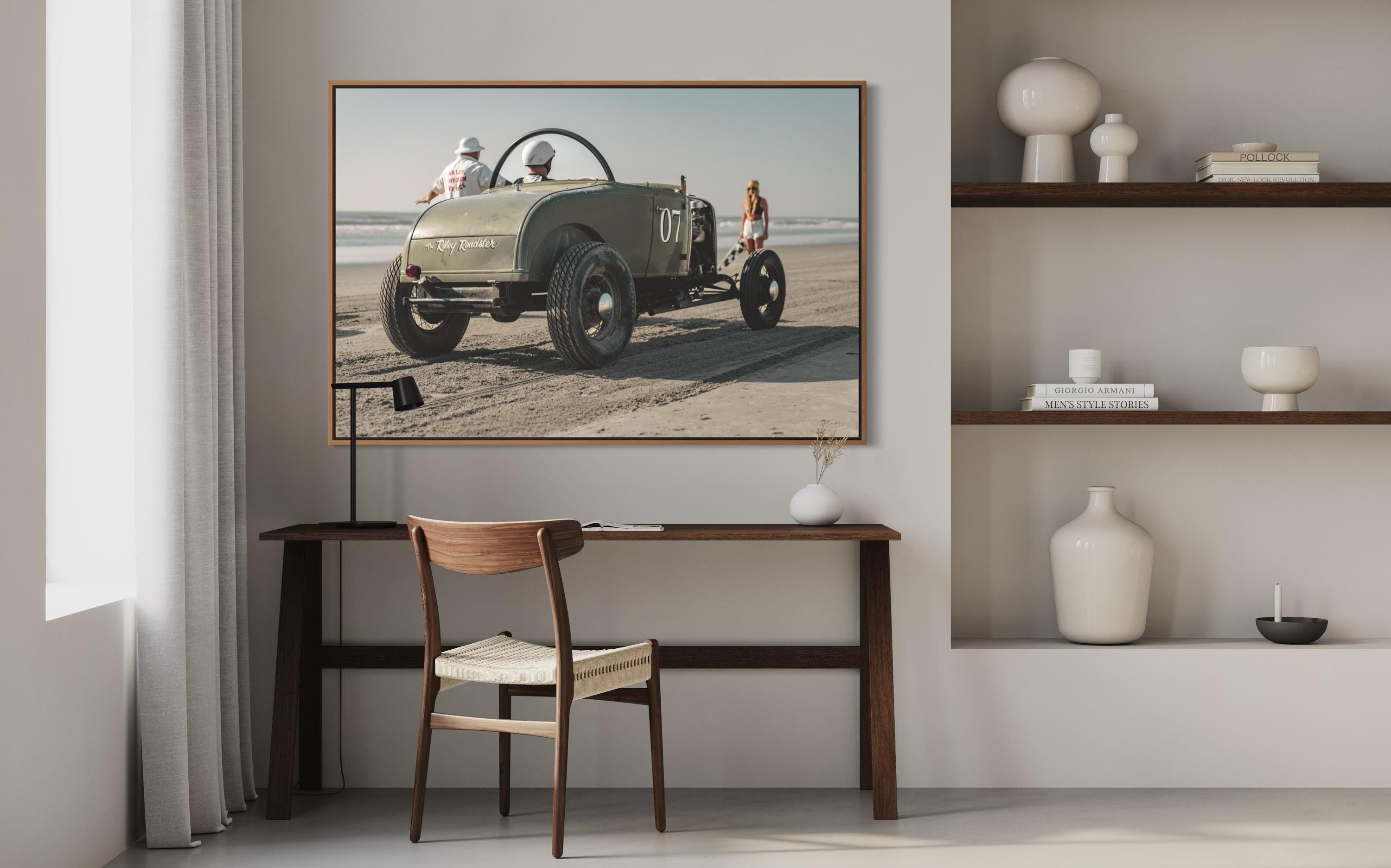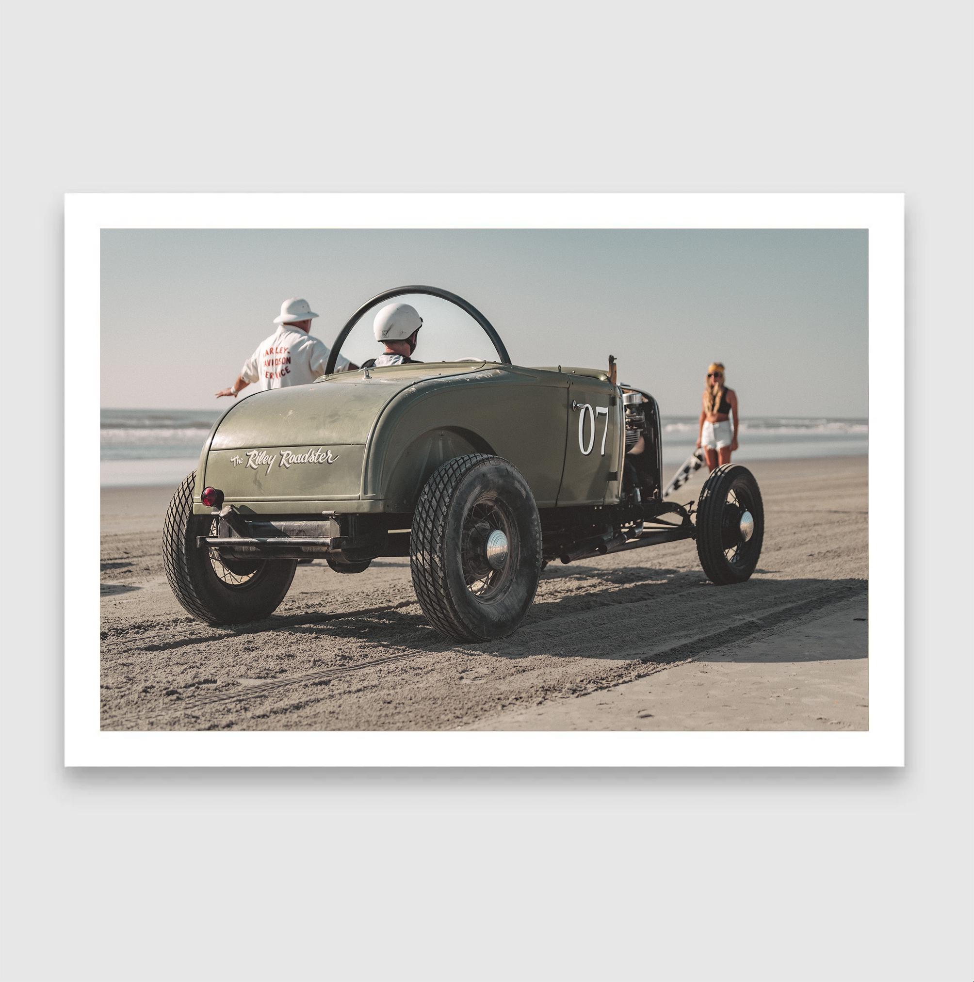 Bring the raw thrill of beach racing into your home with this stunning fine art print featuring the iconic “Riley Roadster” No. 07 at The Race of Gentlemen (TROG). Captured in warm natural tones, this image showcases the retro essence of early American hot rod culture, complete with vintage racers, helmets, and beach-side excitement.