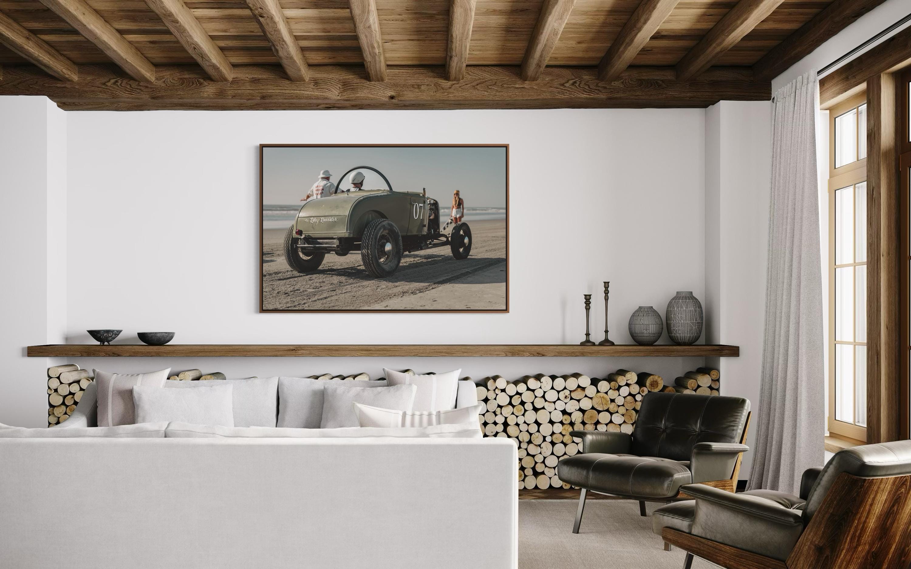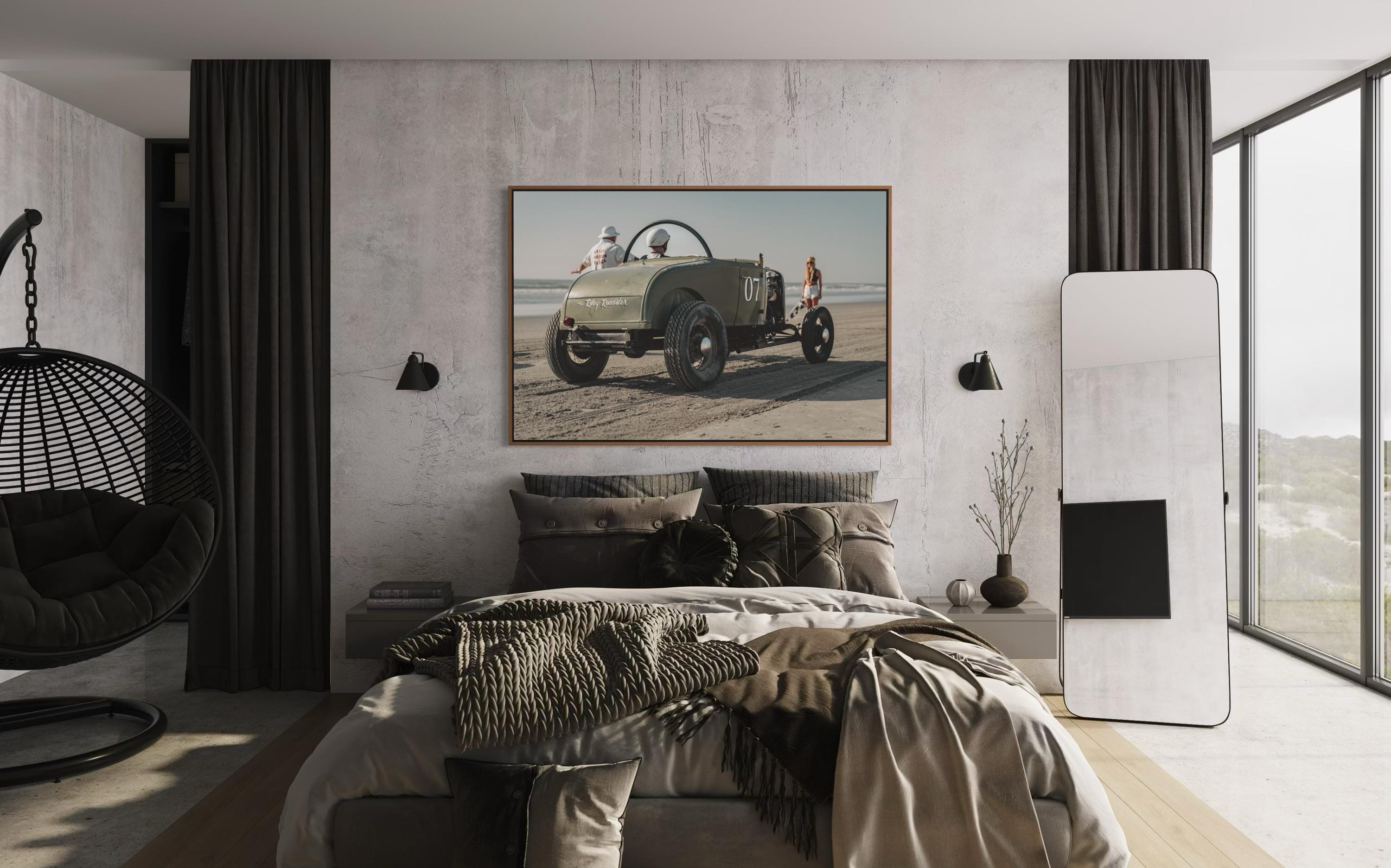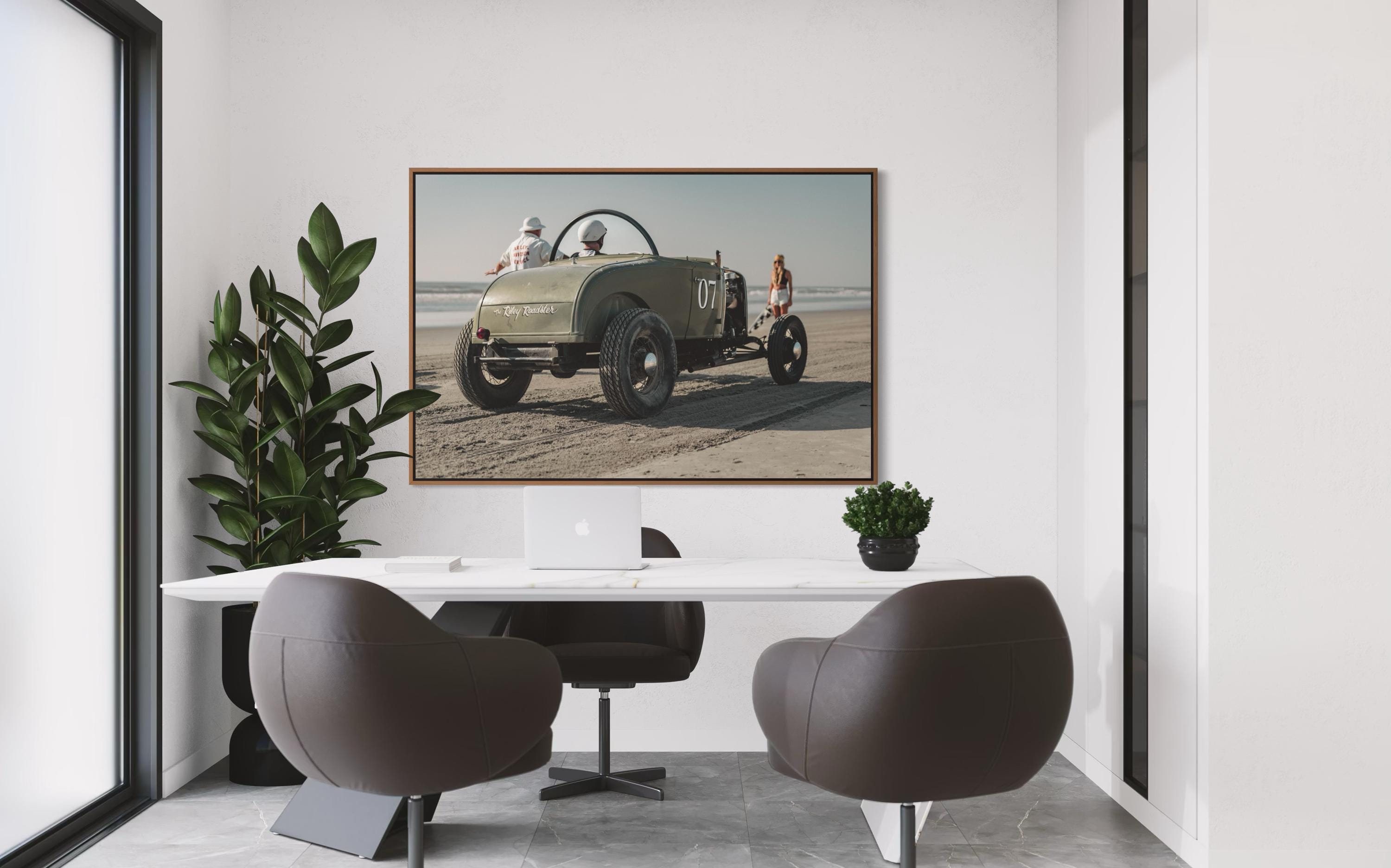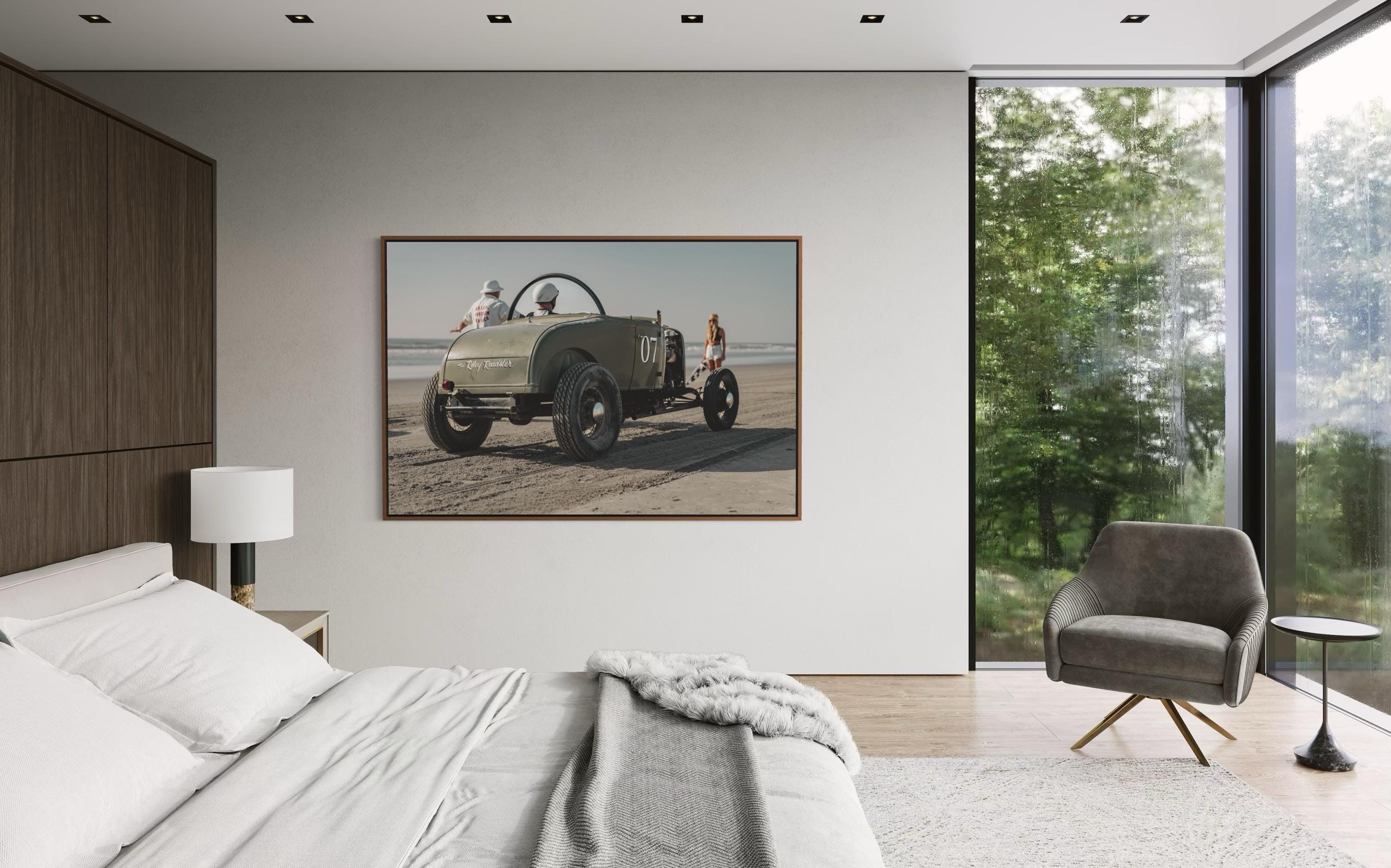 Bring the raw thrill of beach racing into your home with this stunning fine art print featuring the iconic “Riley Roadster” No. 07 at The Race of Gentlemen (TROG). Captured in warm natural tones, this image showcases the retro essence of early American hot rod culture, complete with vintage racers, helmets, and beach-side excitement.