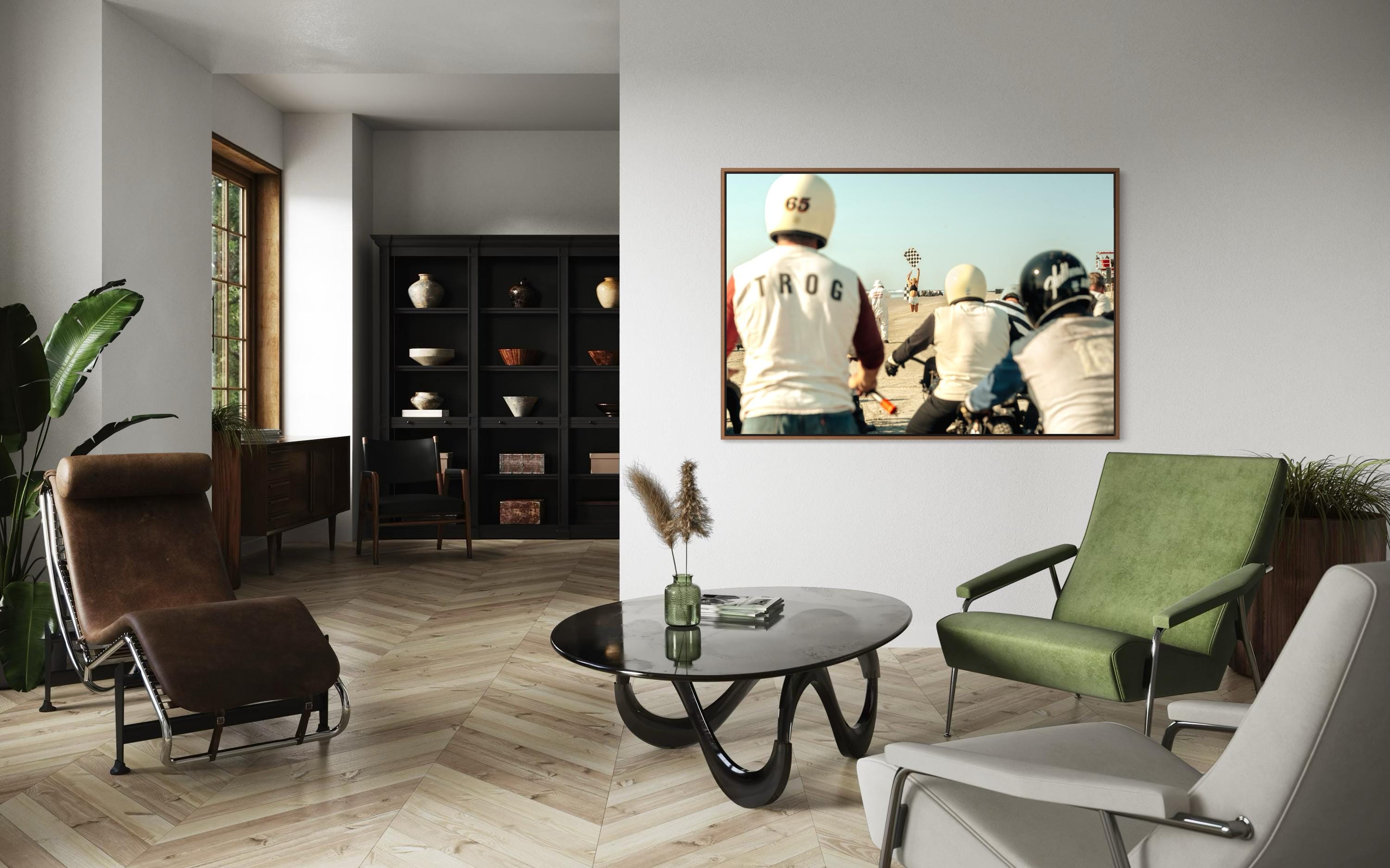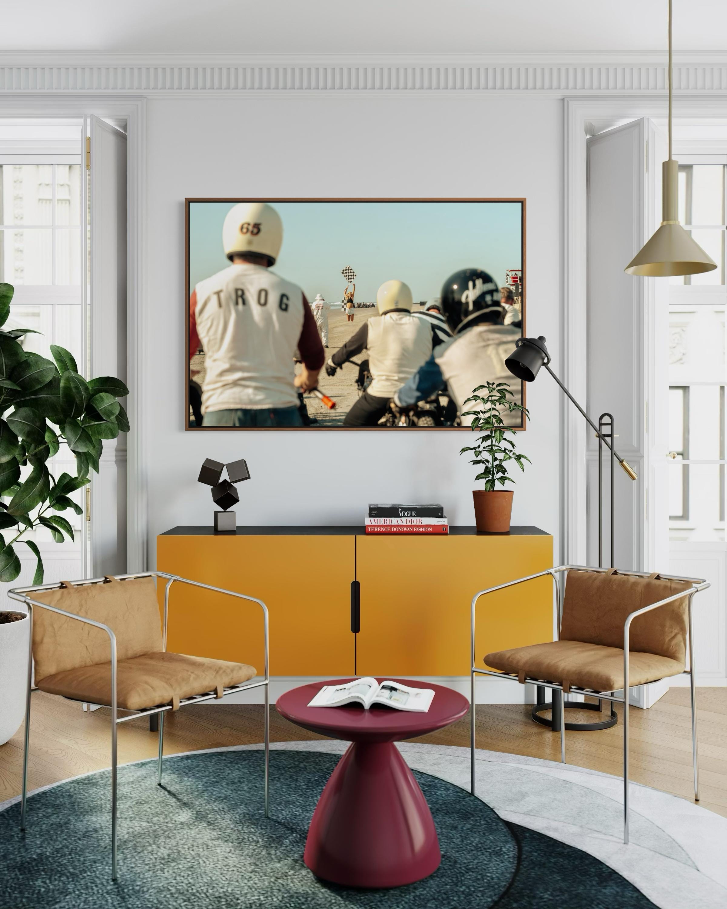 Perfect for lovers of motorcycles, vintage Americana, or coastal nostalgia, this photo makes a bold statement in man caves, garages, offices, or living rooms. A must-have piece for fans of retro motorsports and classic biker culture.