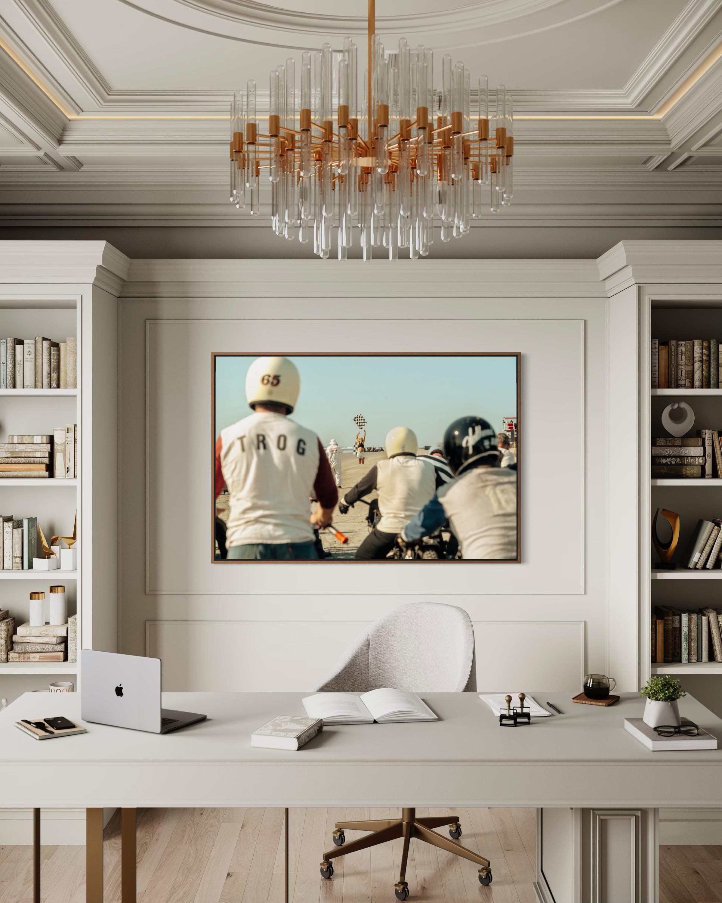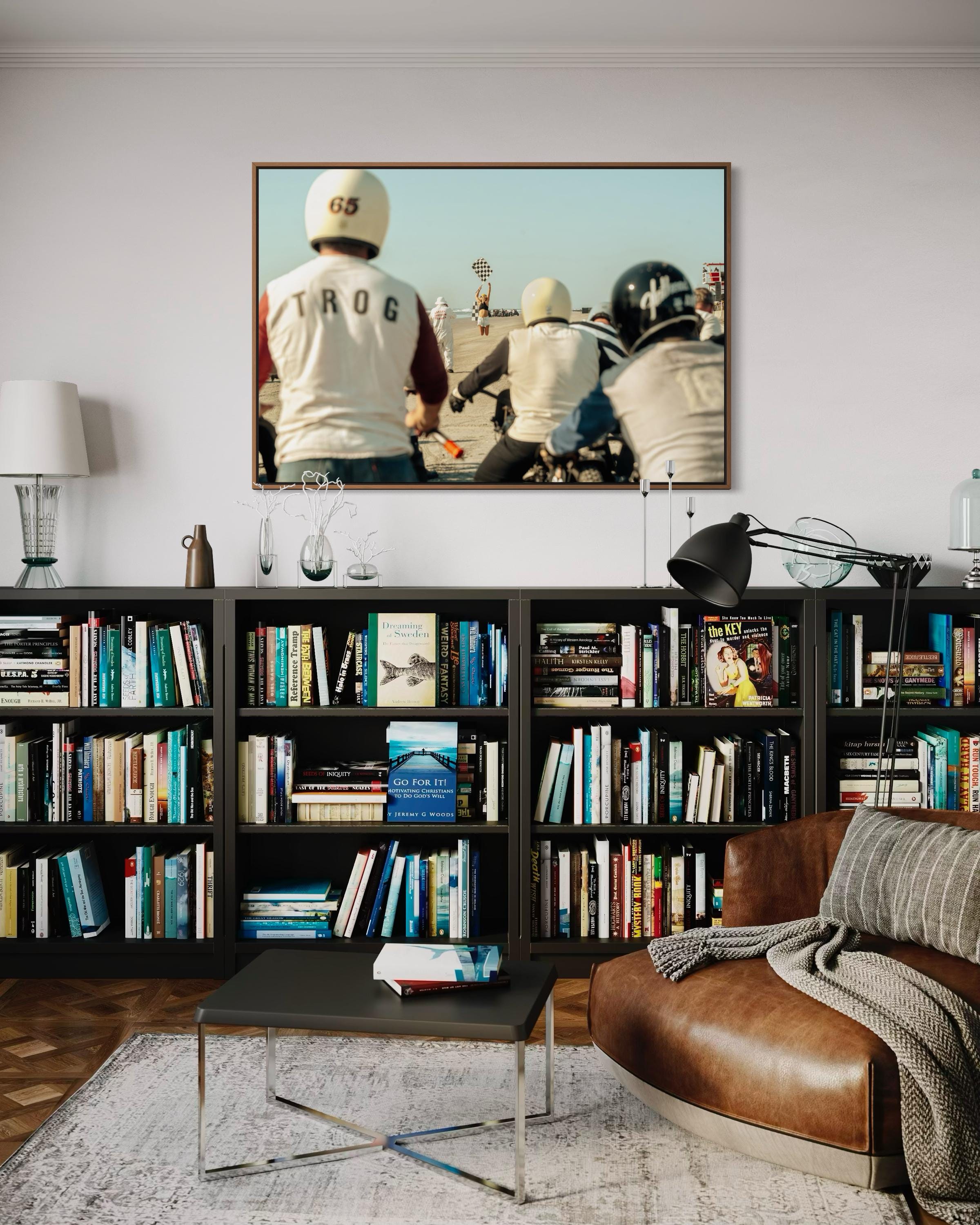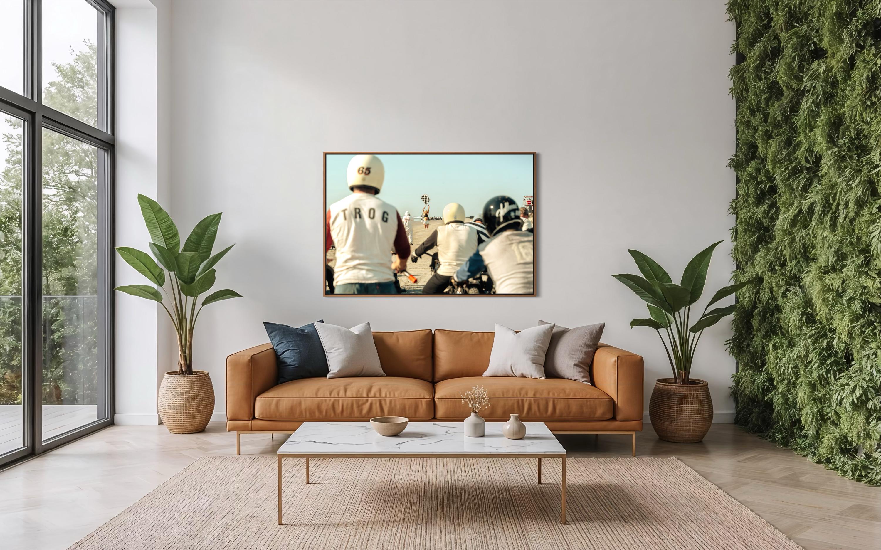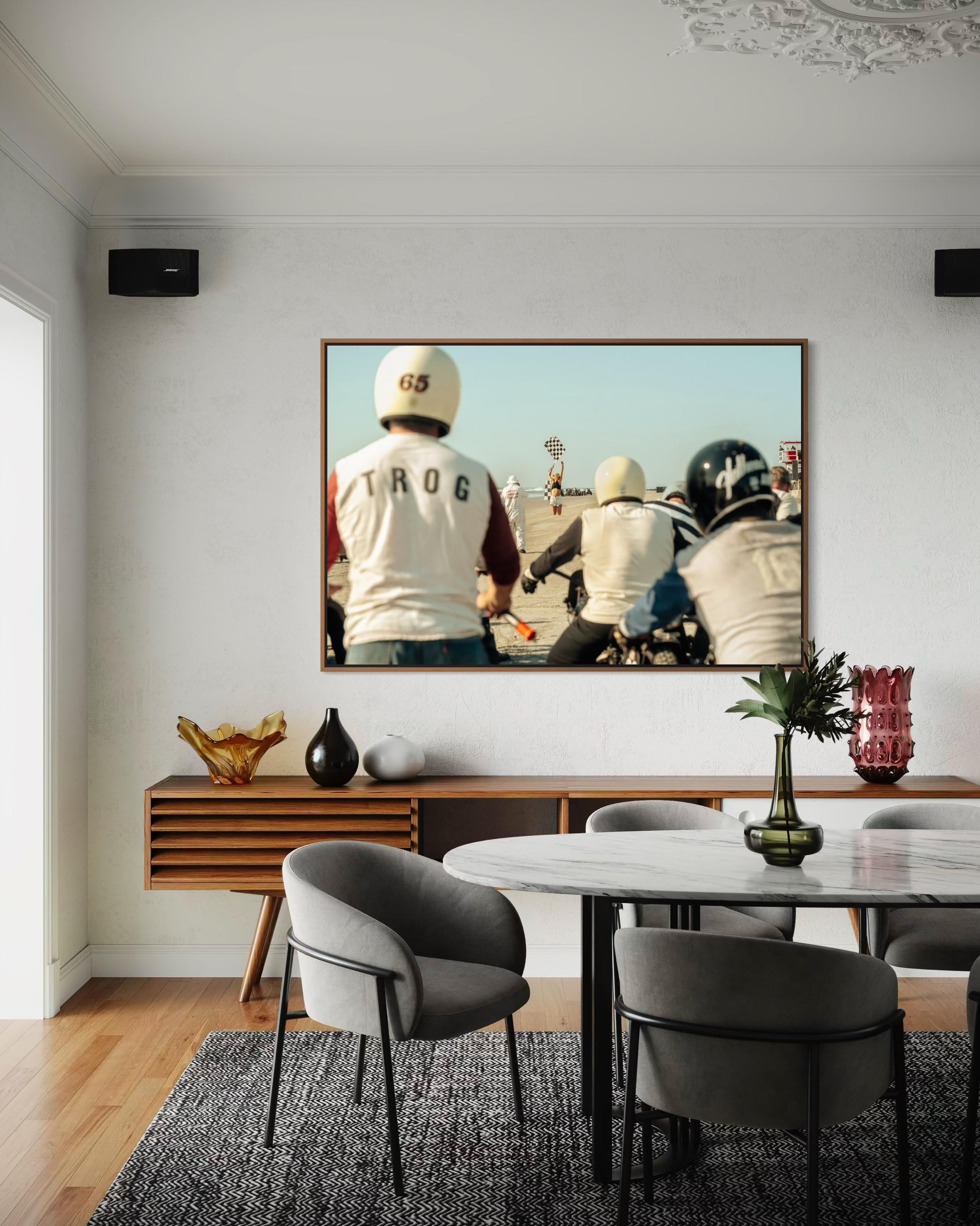ring the thrill of vintage racing into your space with this stunning wall art print featuring motorcycle racers at The Race of Gentlemen (TROG). Captured at the iconic Wildwood, NJ beach, this image shows riders in vintage gear, poised at the starting line as the flag girl raises the checkered flag — a moment frozen in time, full of anticipation and raw energy.