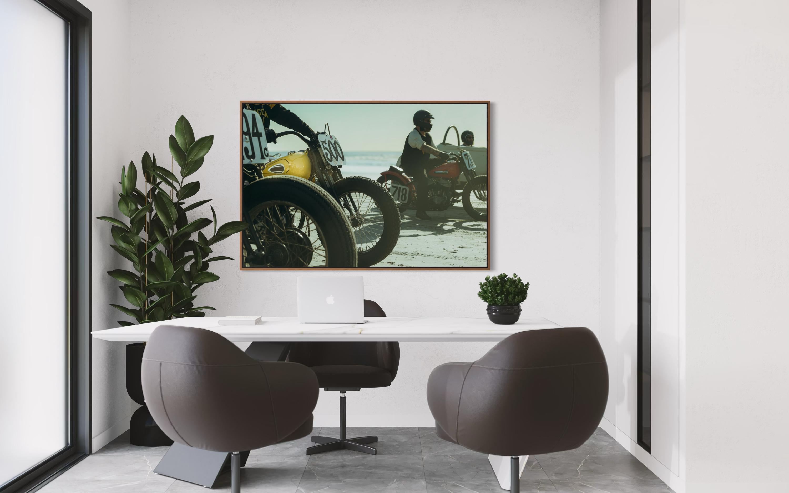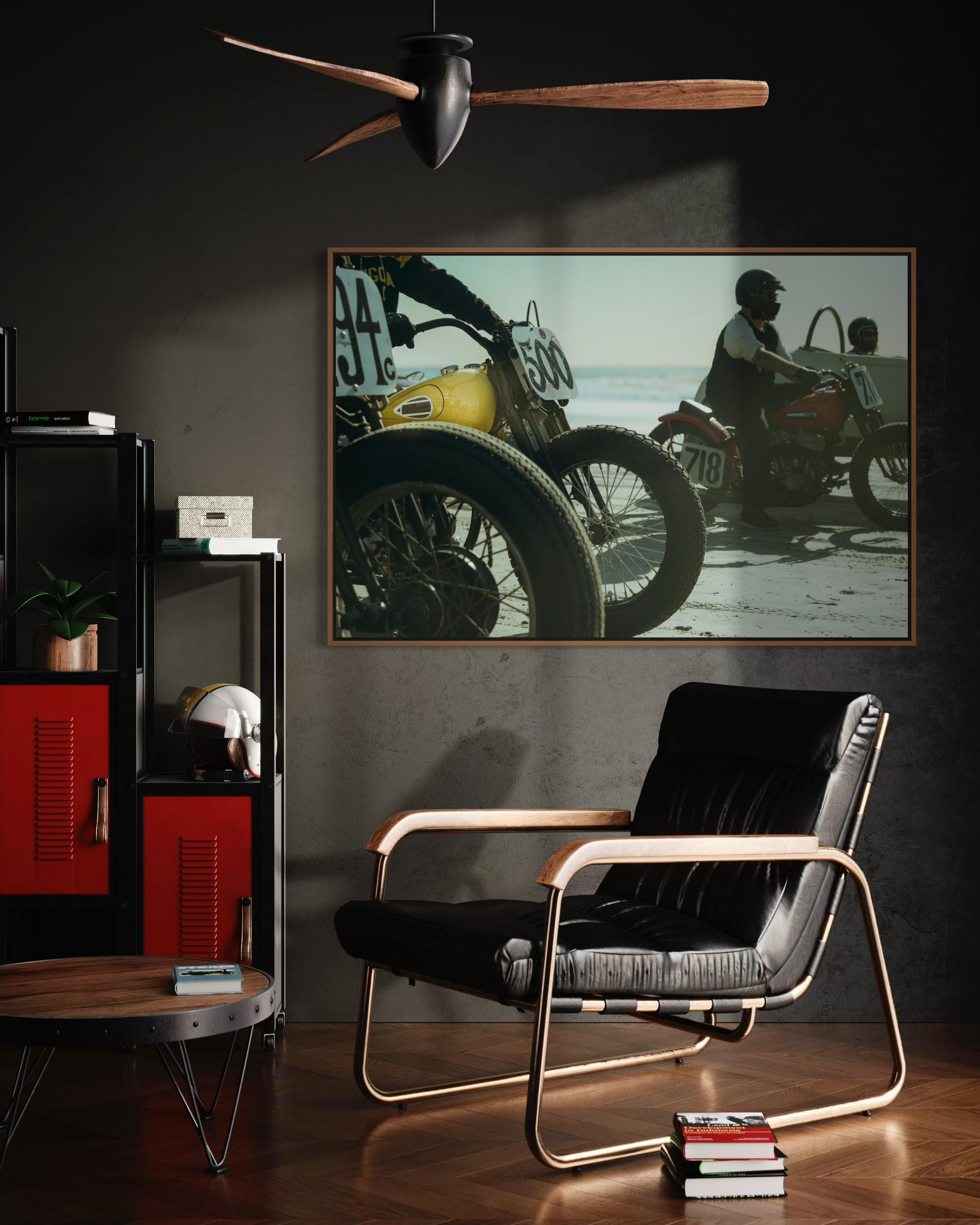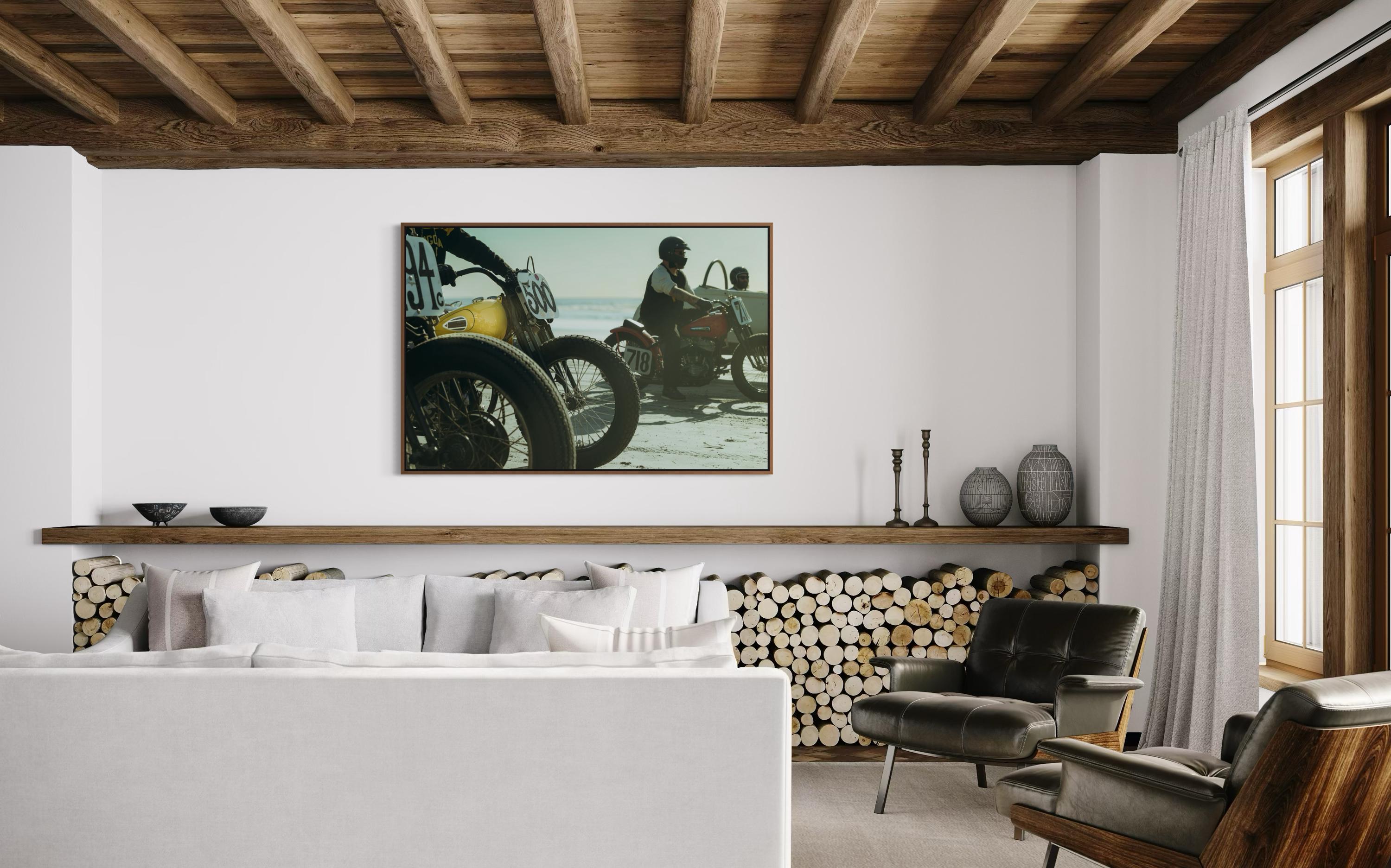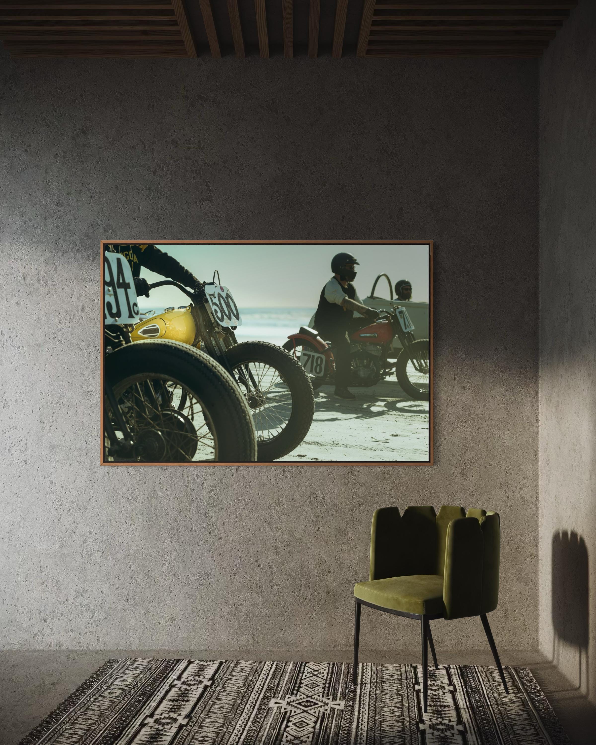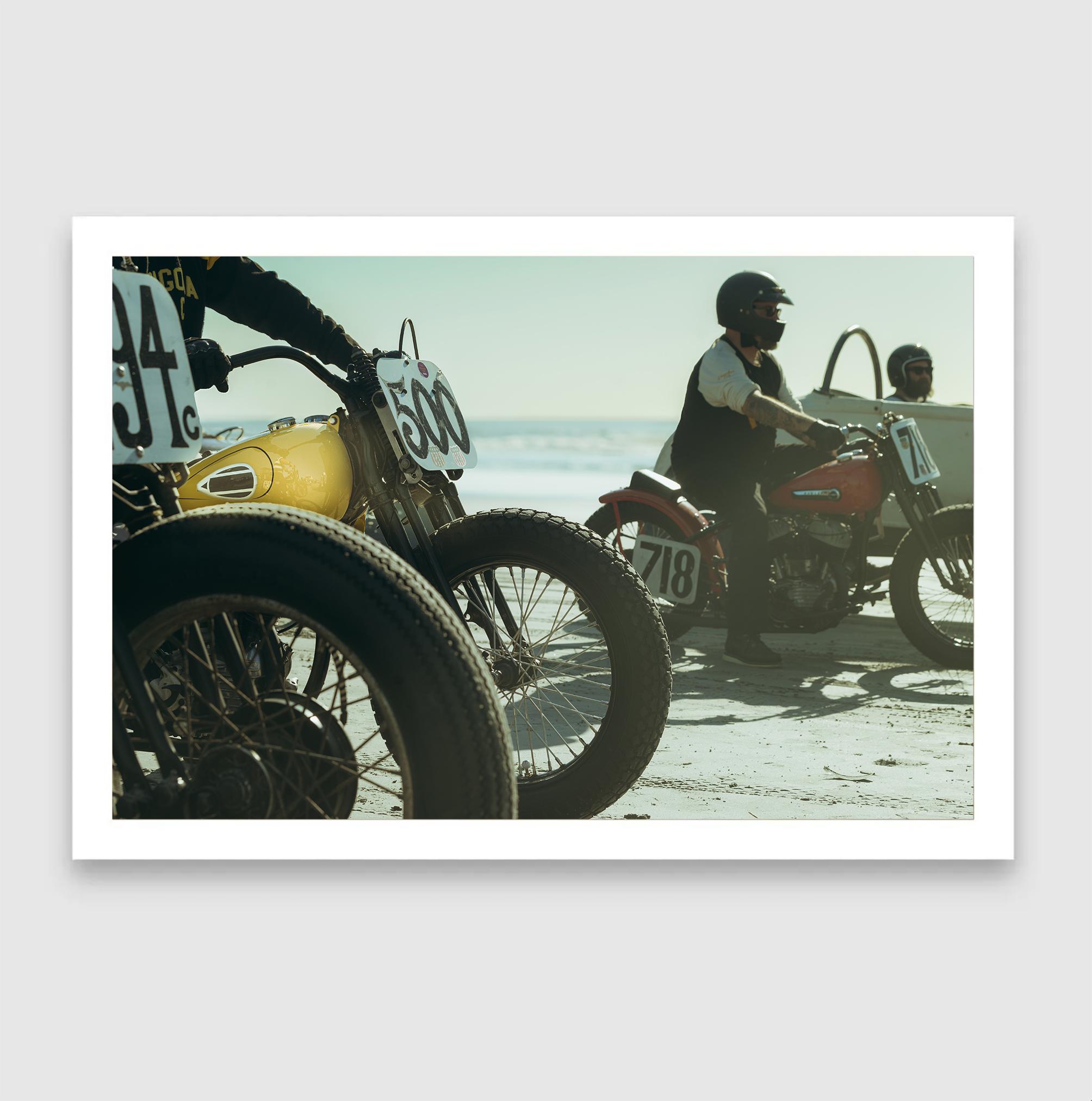 Capture the anticipation before the roar — this print freezes a timeless moment at the start line of The Race of Gentlemen (TROG). Vintage motorcycles with custom number plates and bold colors line up against the ocean backdrop, embodying the raw energy and mechanical beauty of bygone racing days.