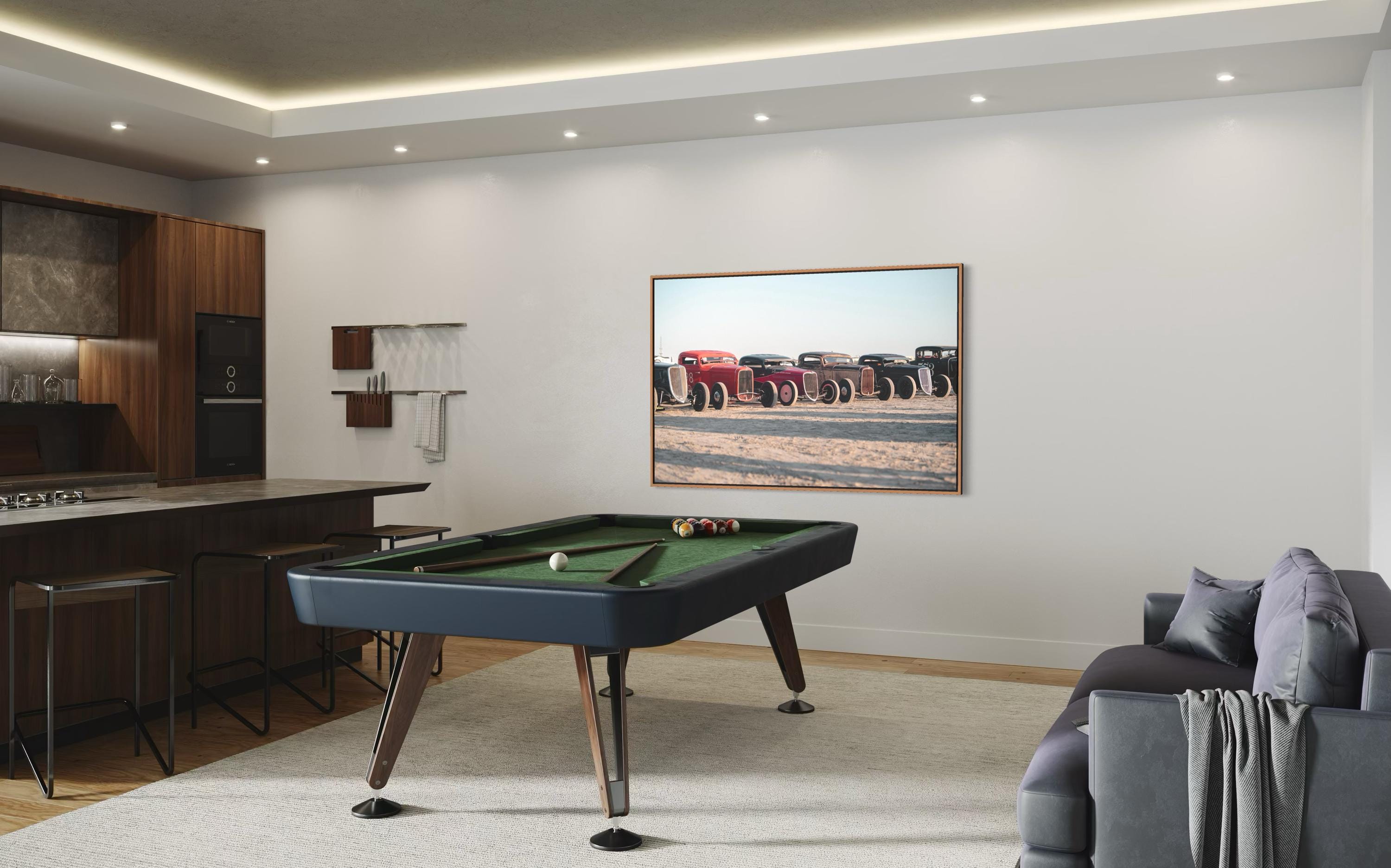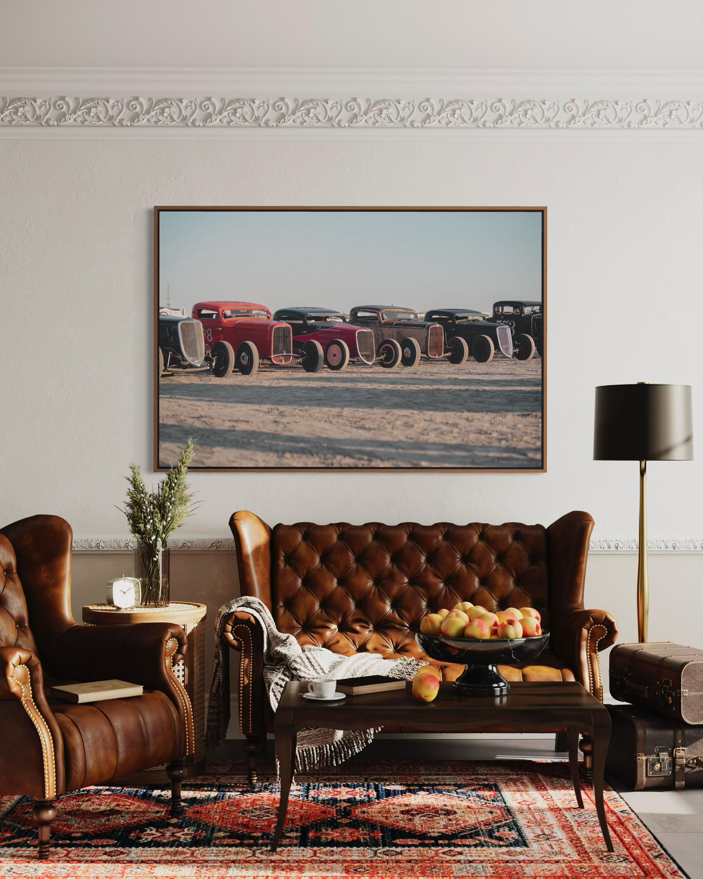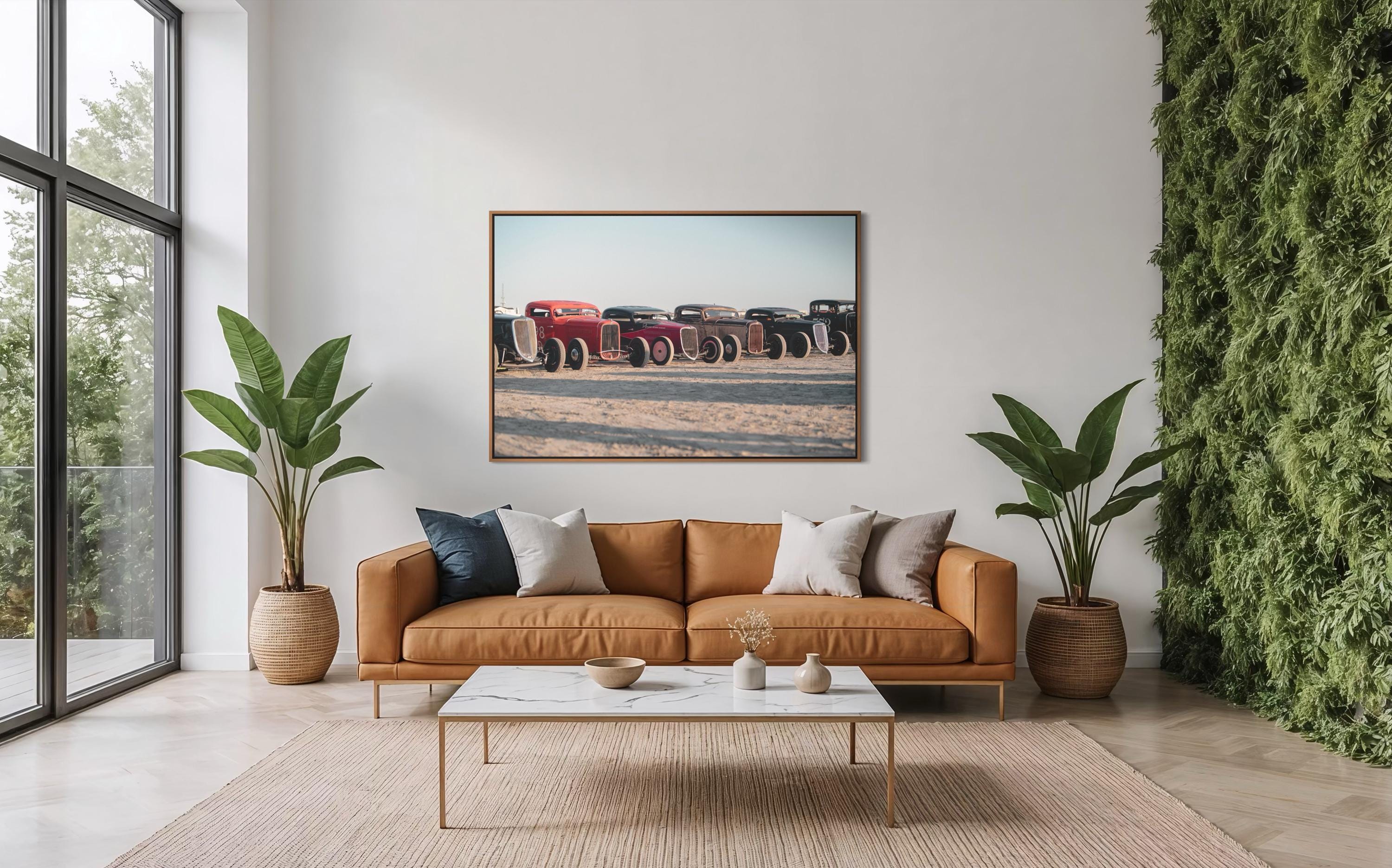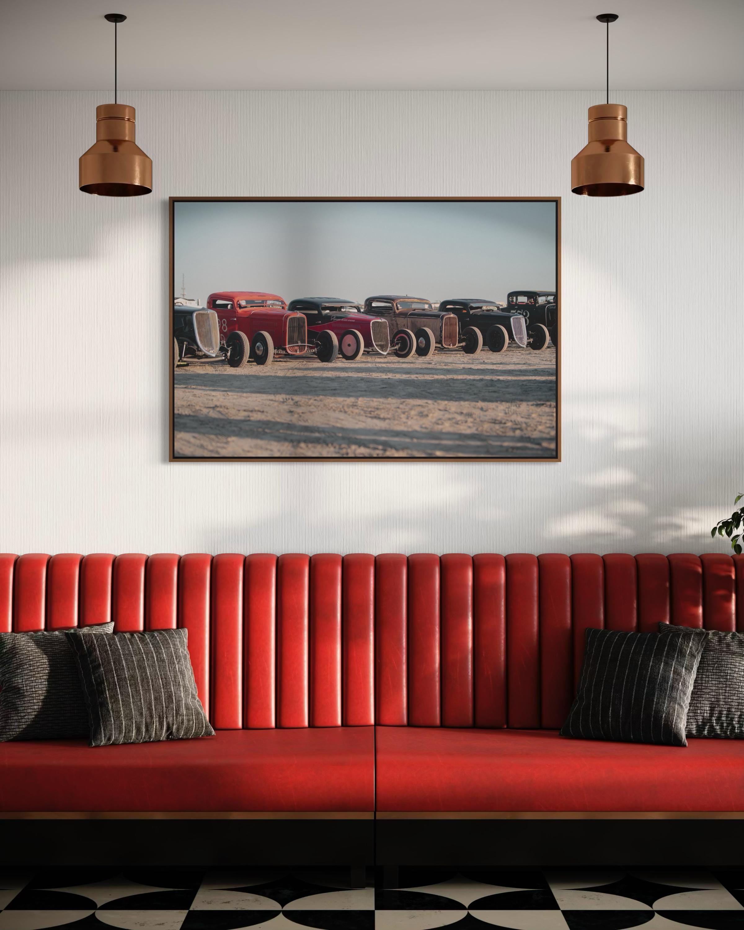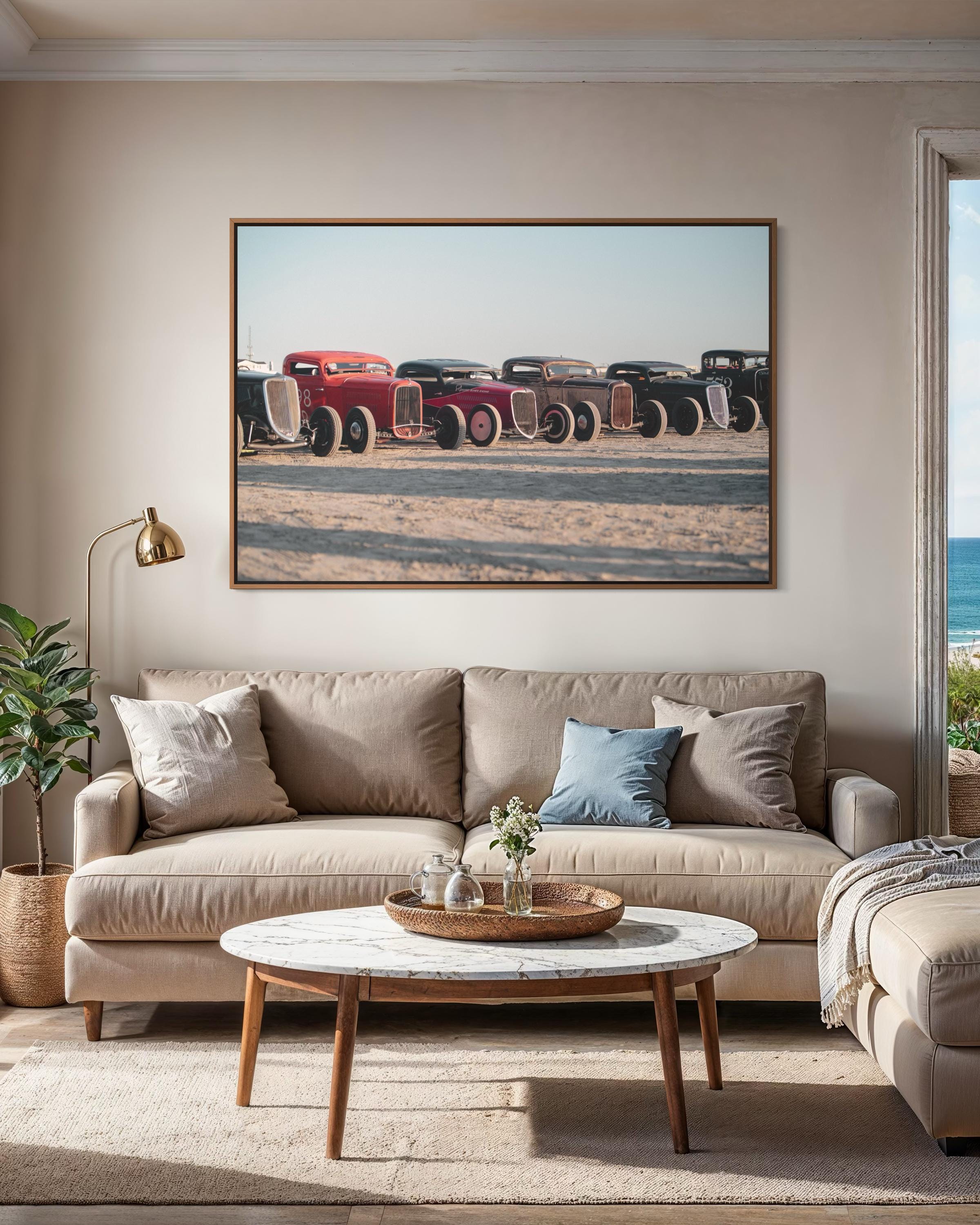 Bring bold energy and vintage charm to your space with this striking photo print from The Race of Gentlemen (TROG). Capturing a lineup of classic hot rods resting on the sands of Wildwood, this image celebrates speed, style, and pure Americana.