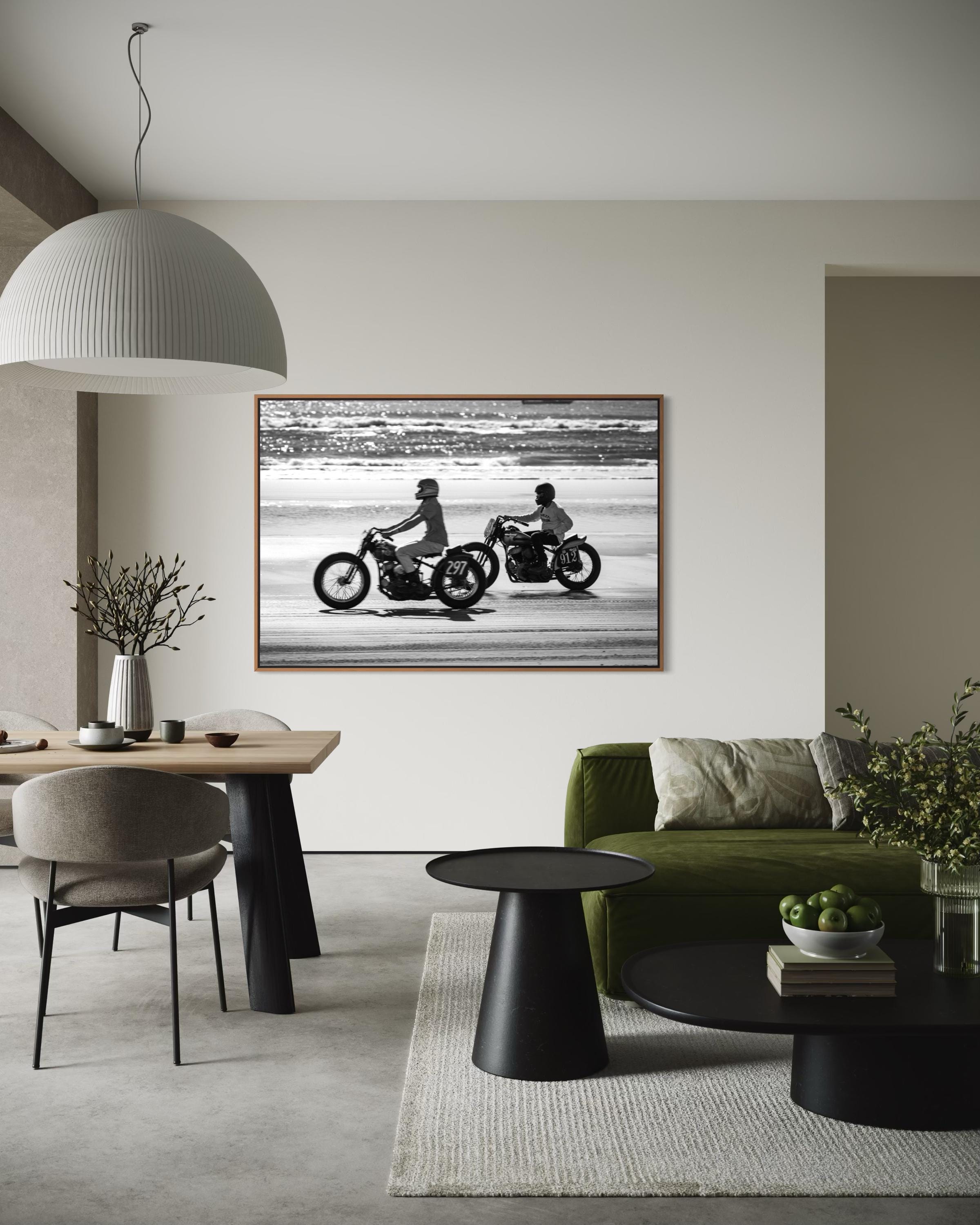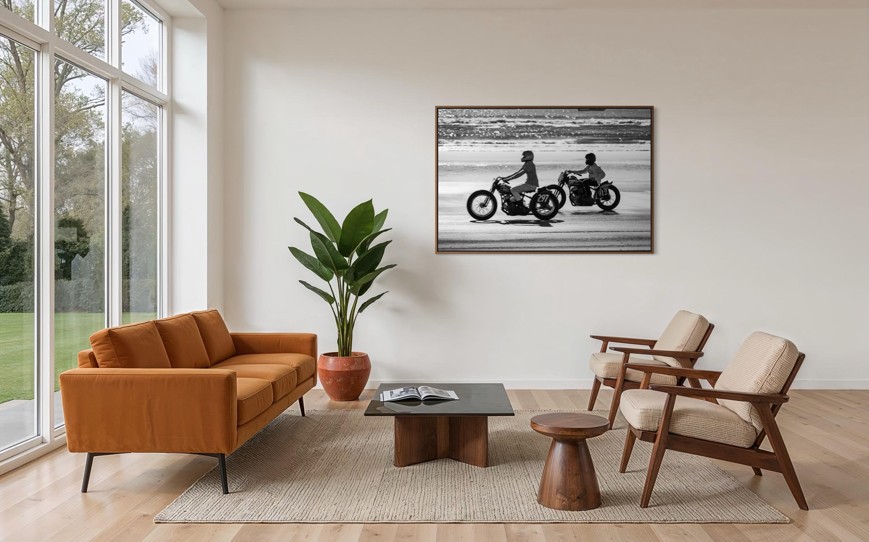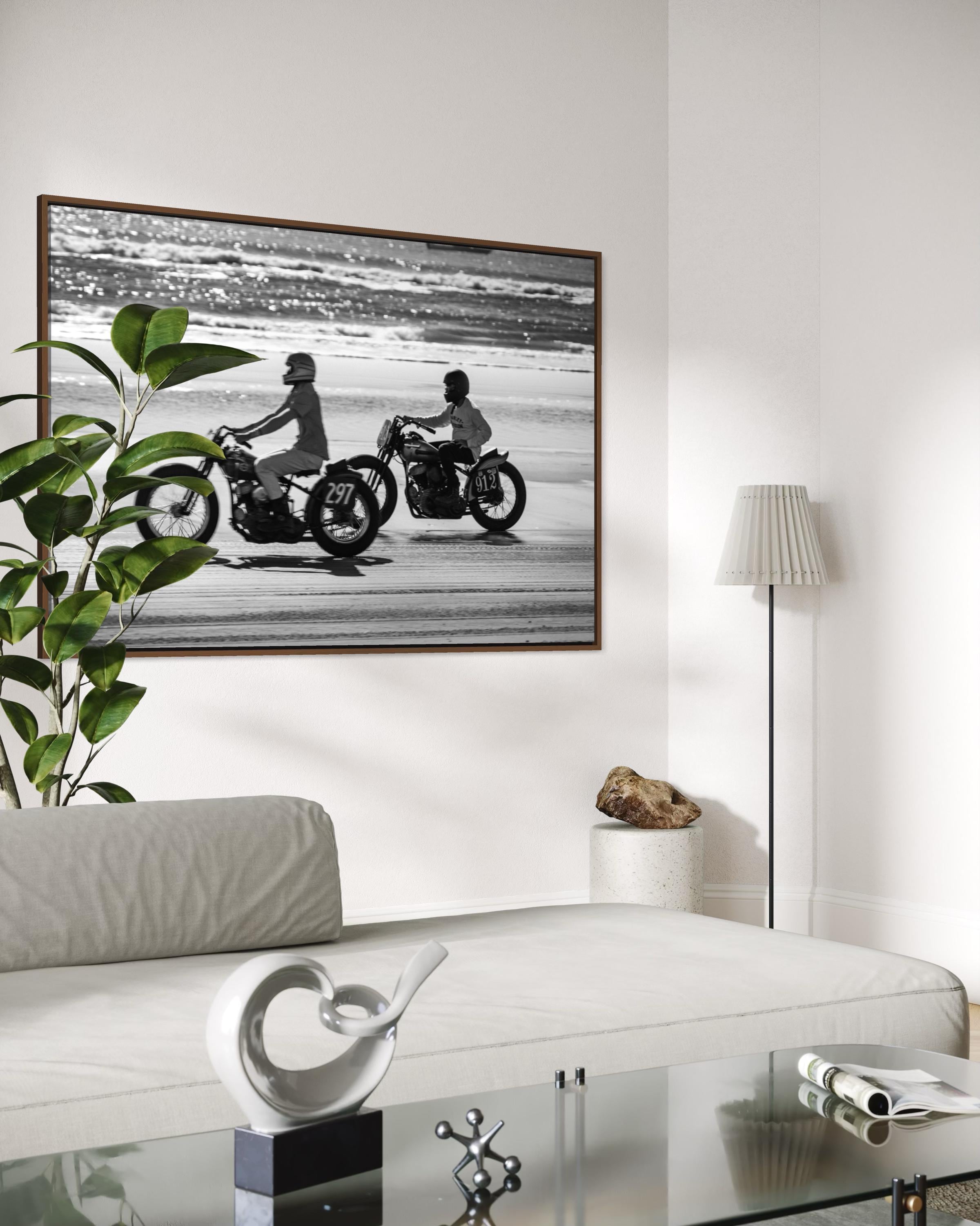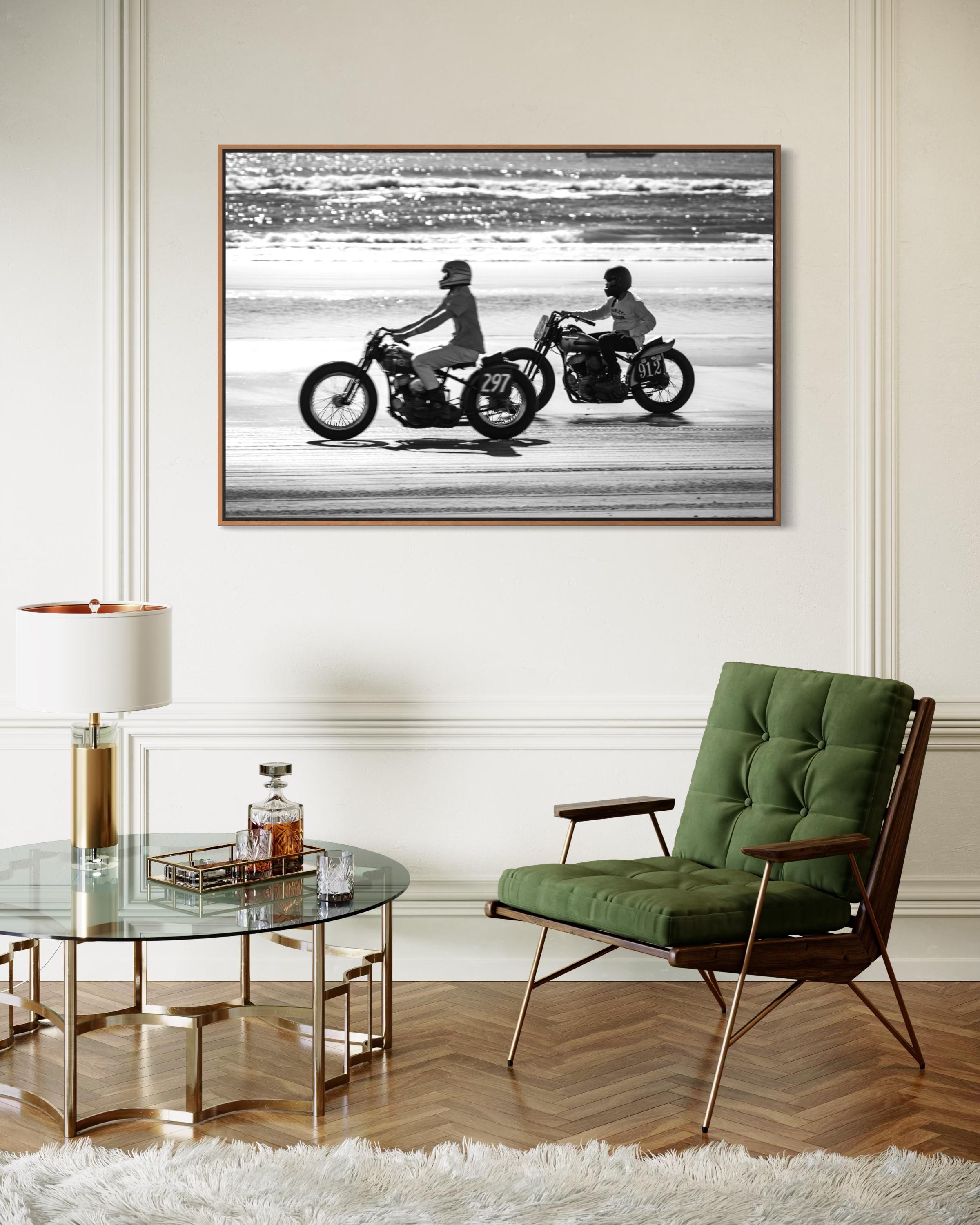 Capture a moment of pure vintage speed with this striking black & white photograph of two classic motorcycles racing on the sands of Wildwood, New Jersey during The Race of Gentlemen.
