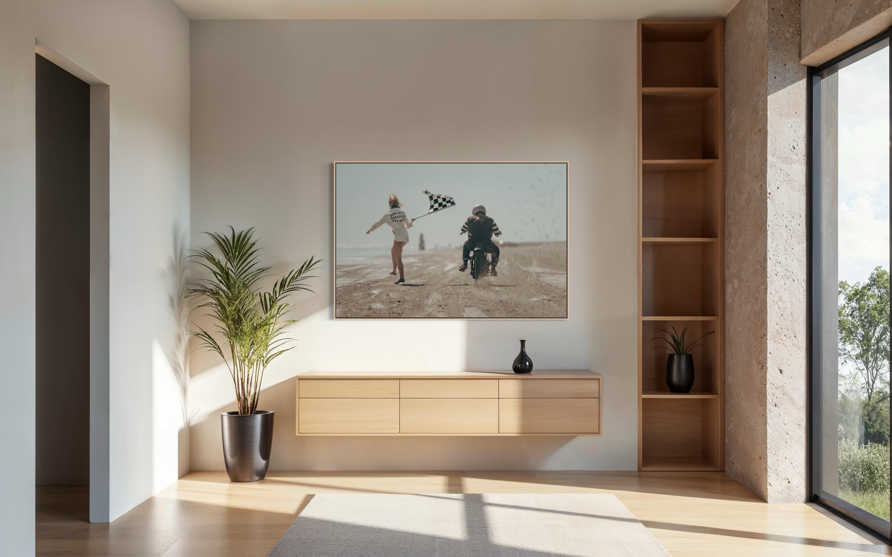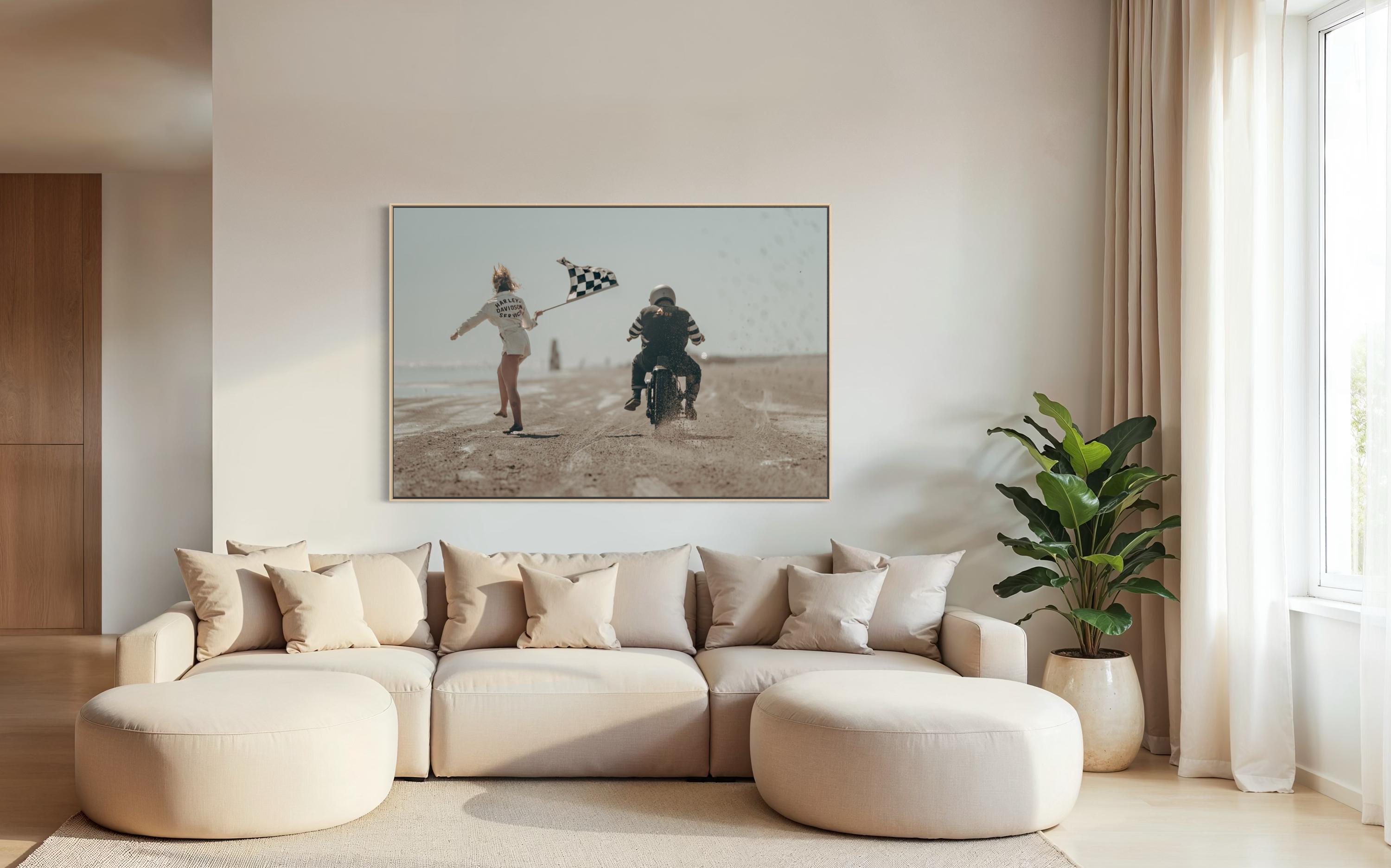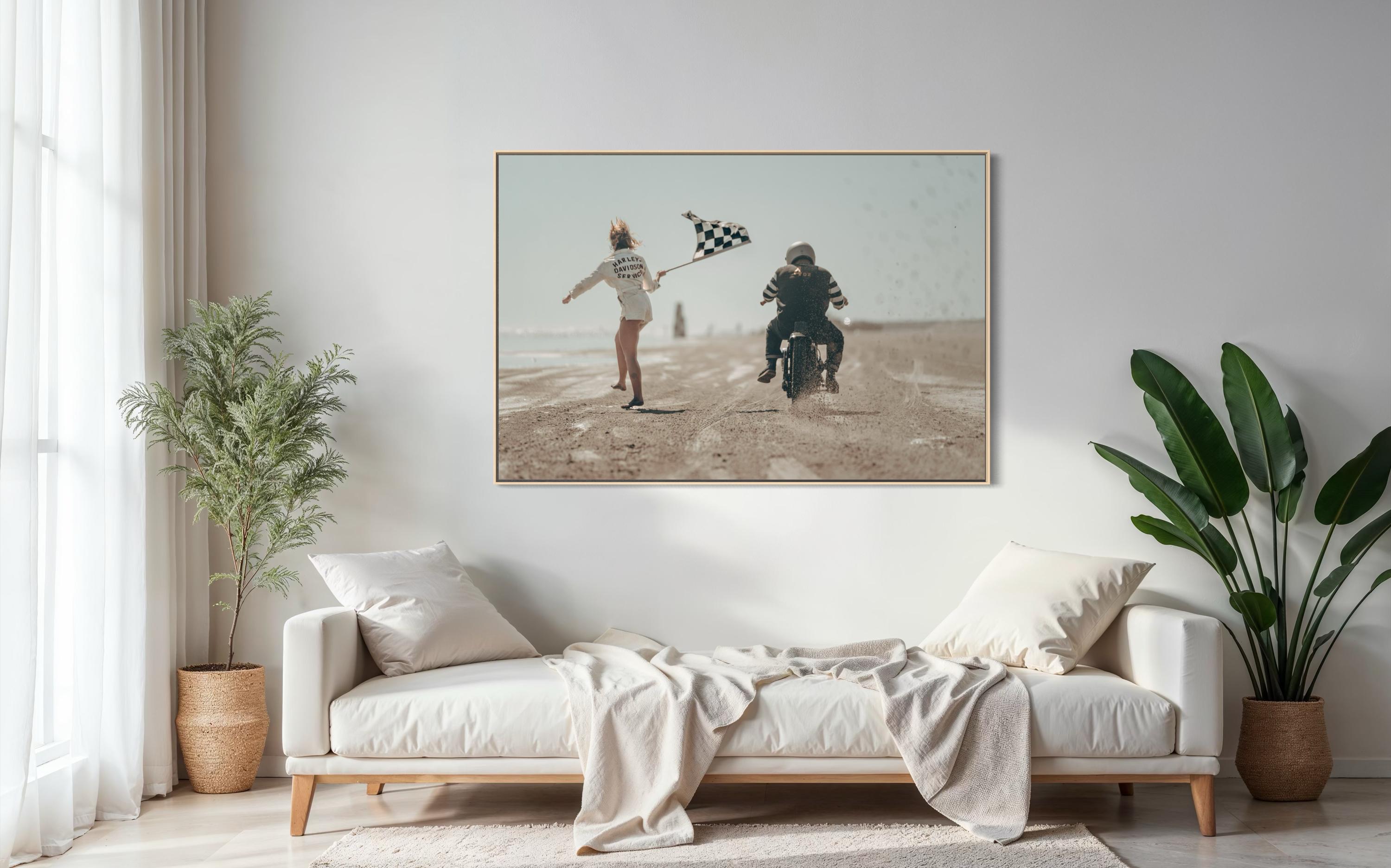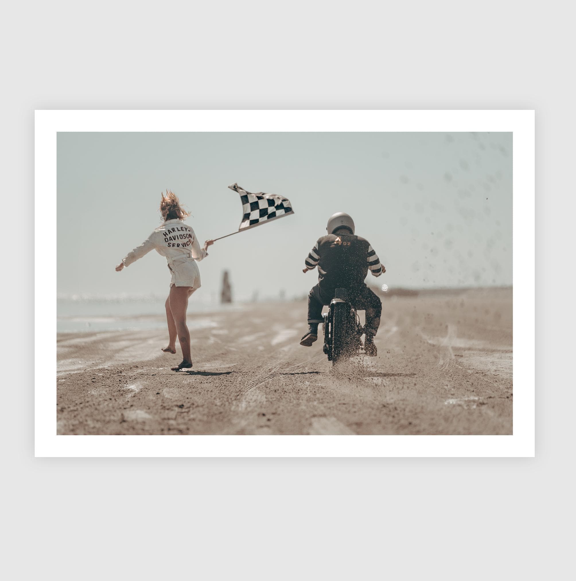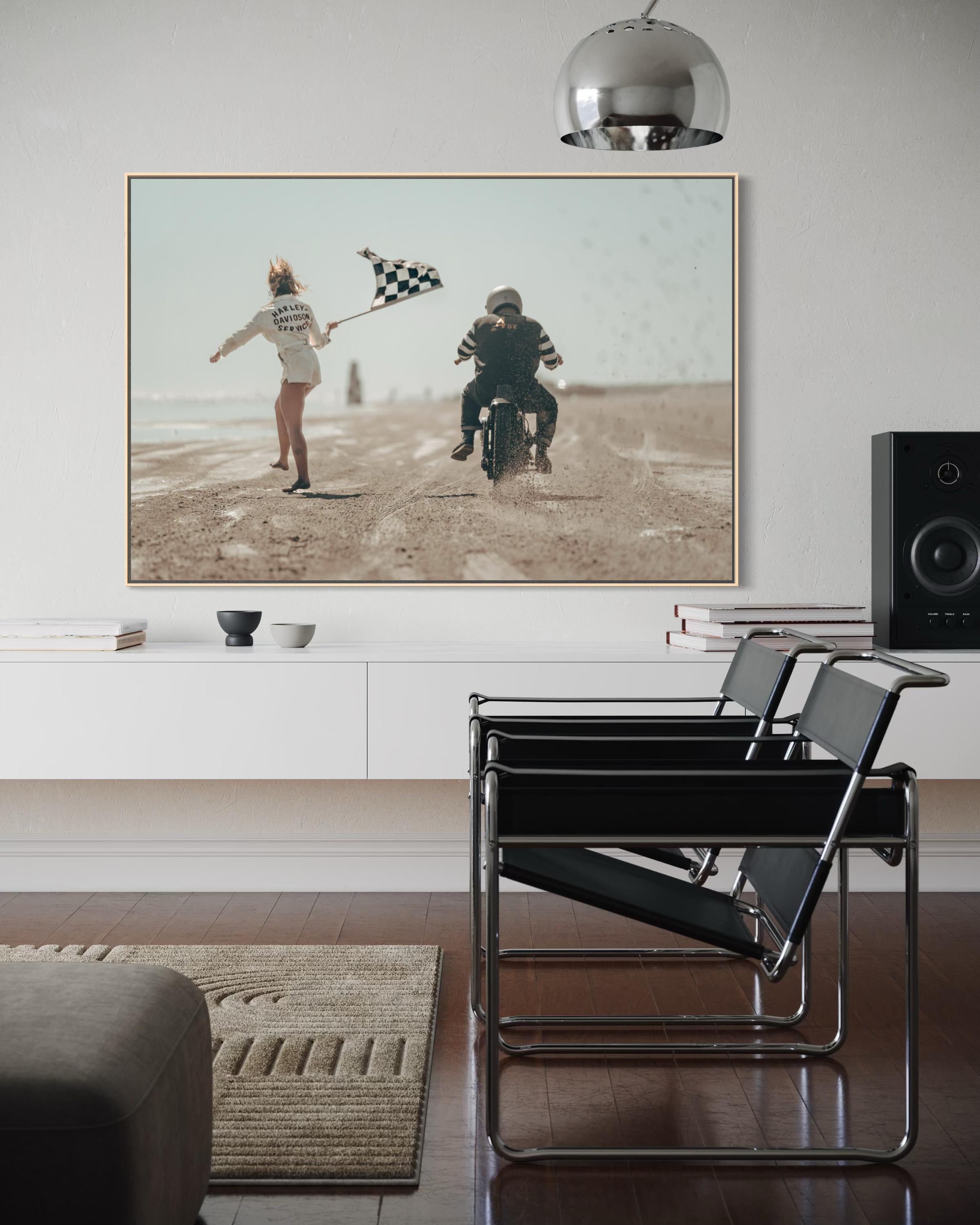 Fine Art Print - Harley Davidson Beach Race – Motorcycle Launch with Flag Girl at The Race of Gentlemen, Vintage Racing Wall Art