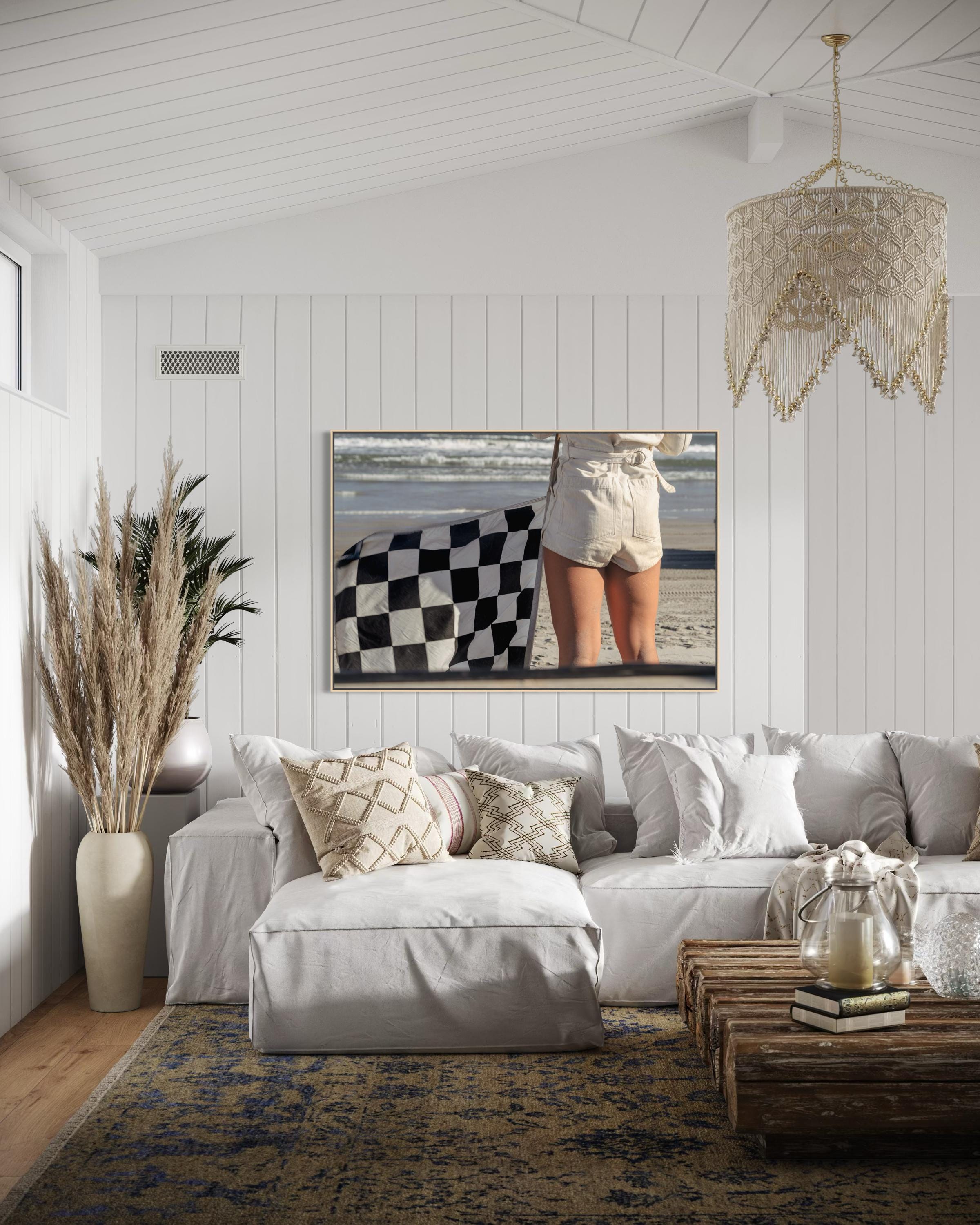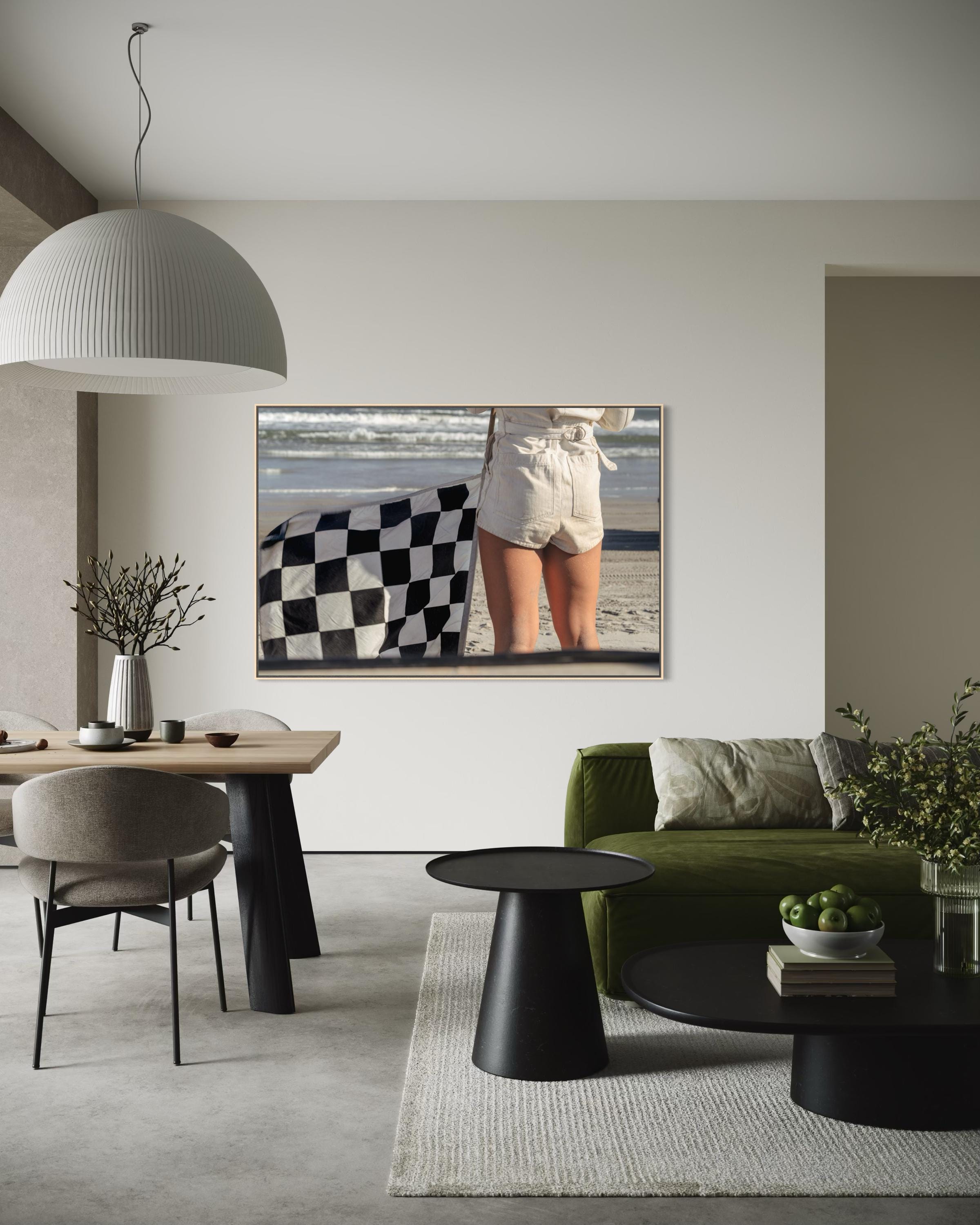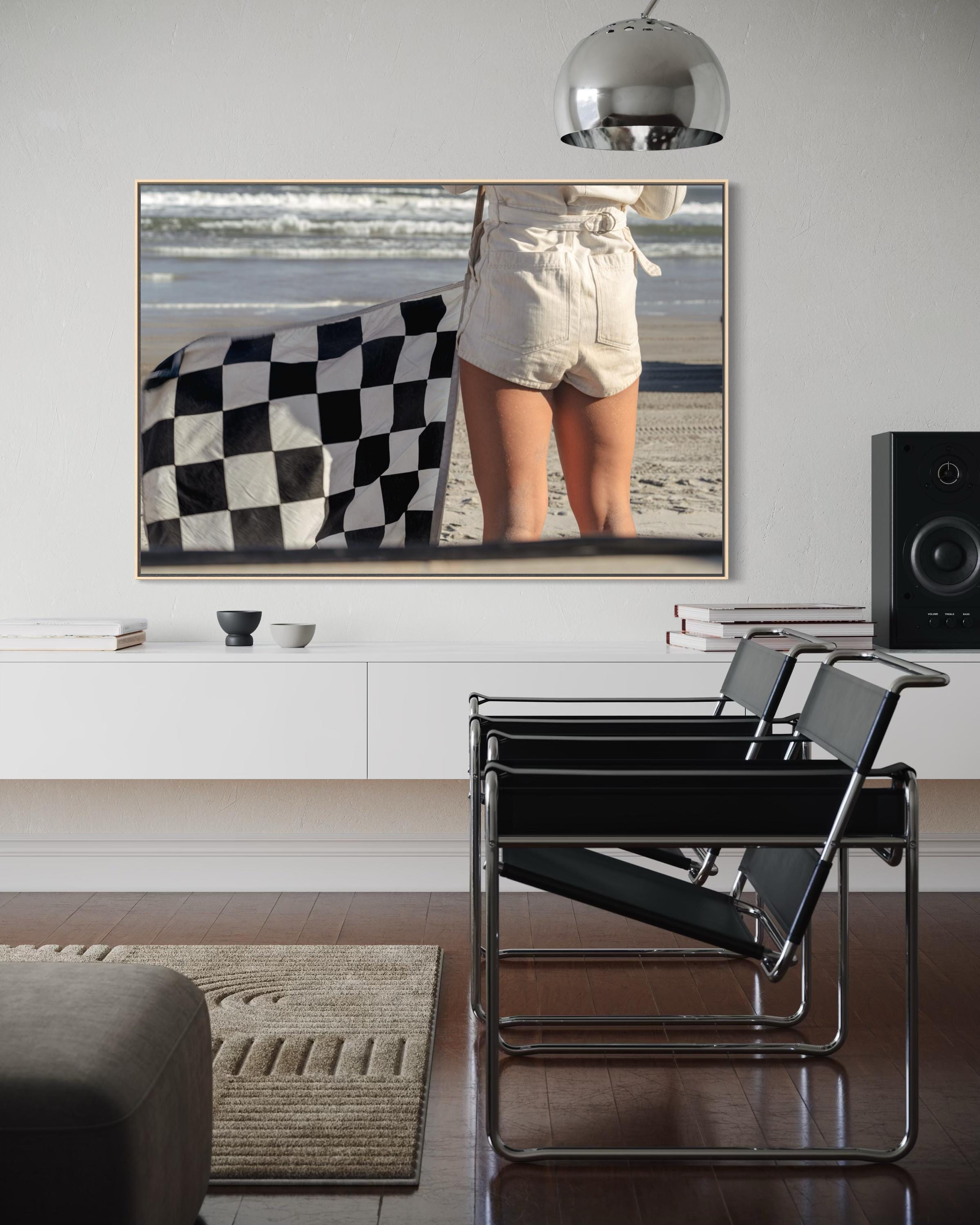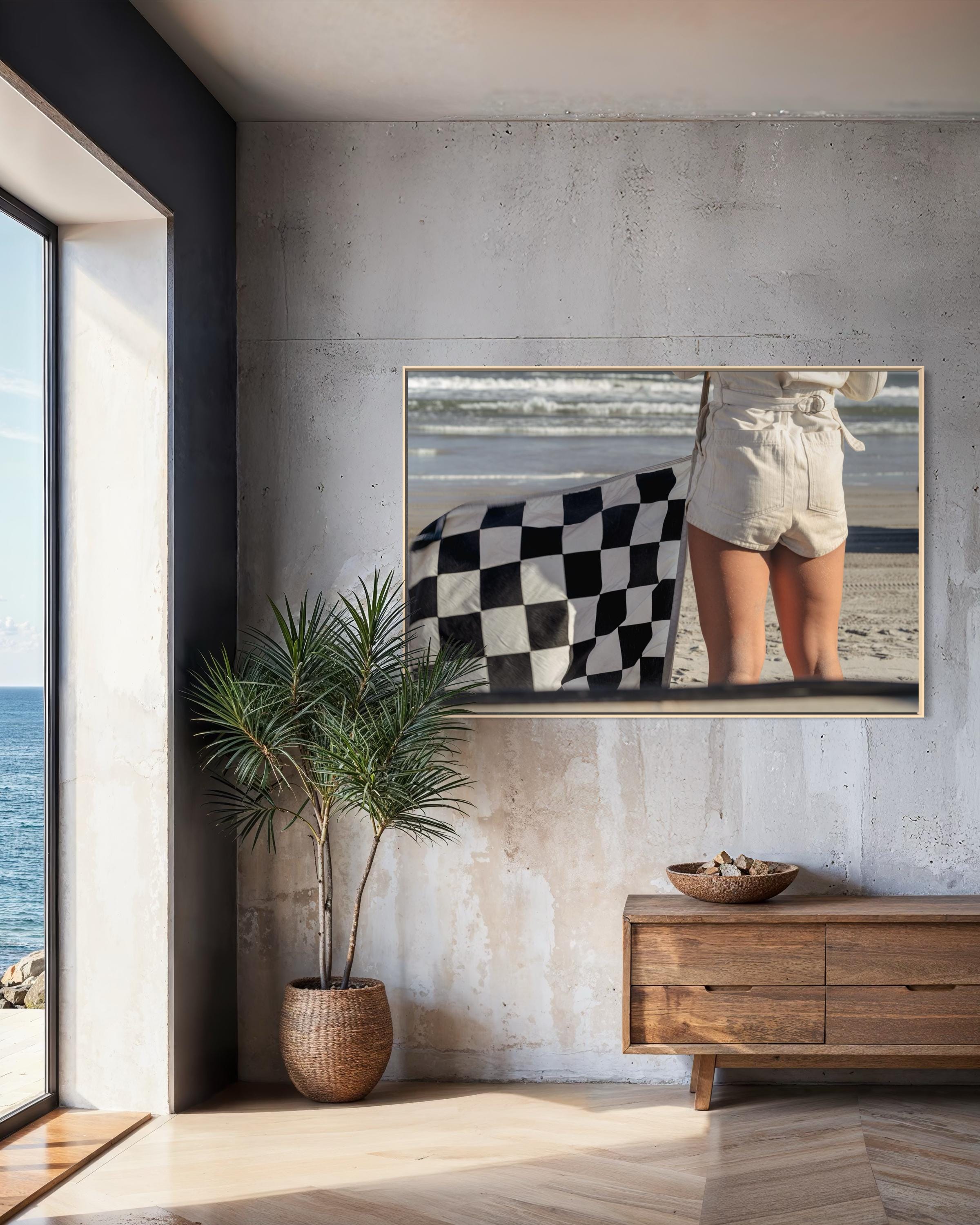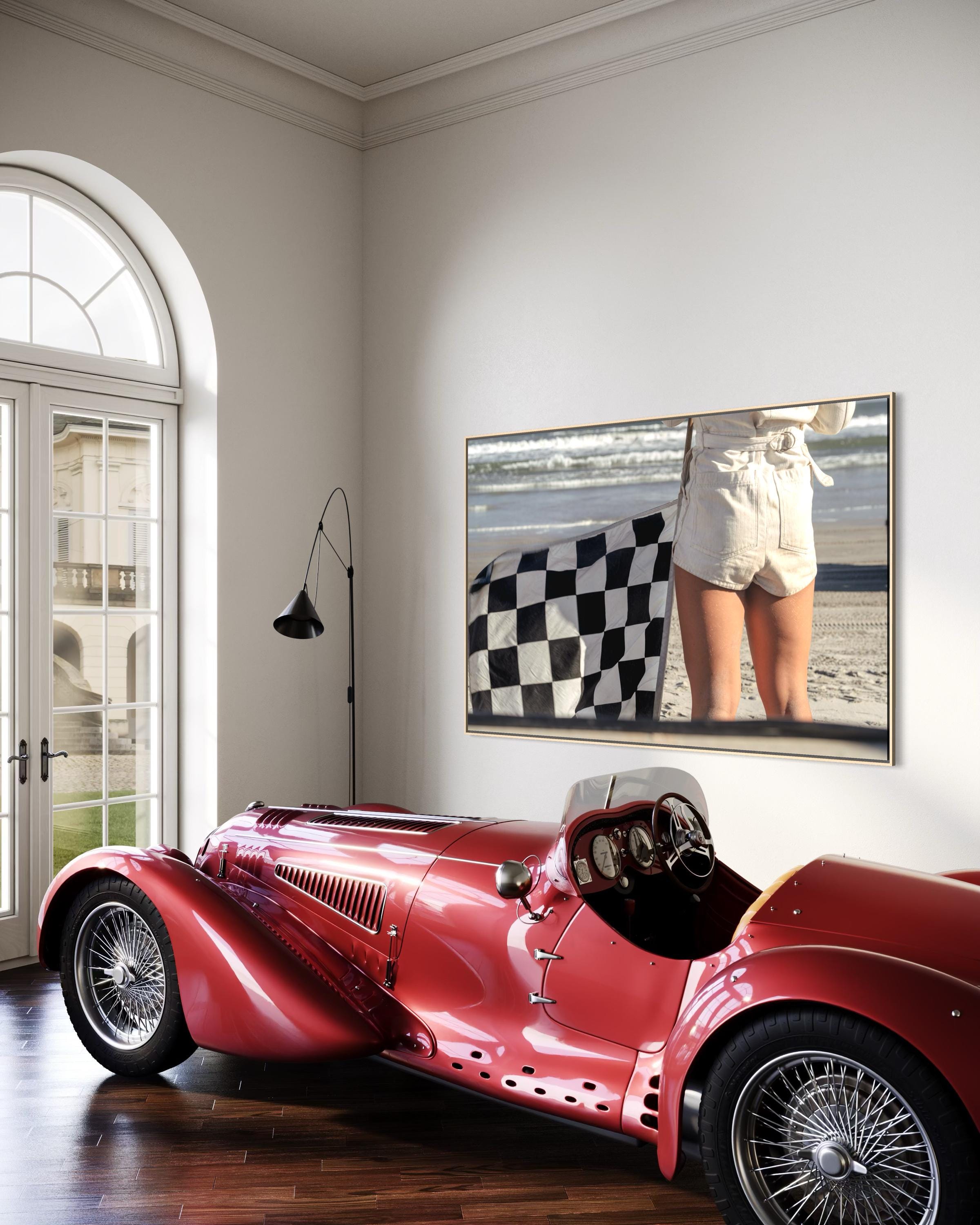 This close-up print captures a quiet but iconic moment of vintage racing culture. Featuring the poised stance of the flag girl and a worn checkered flag against the Atlantic surf, this piece celebrates the raw beauty and understated confidence of The Race of Gentlemen.