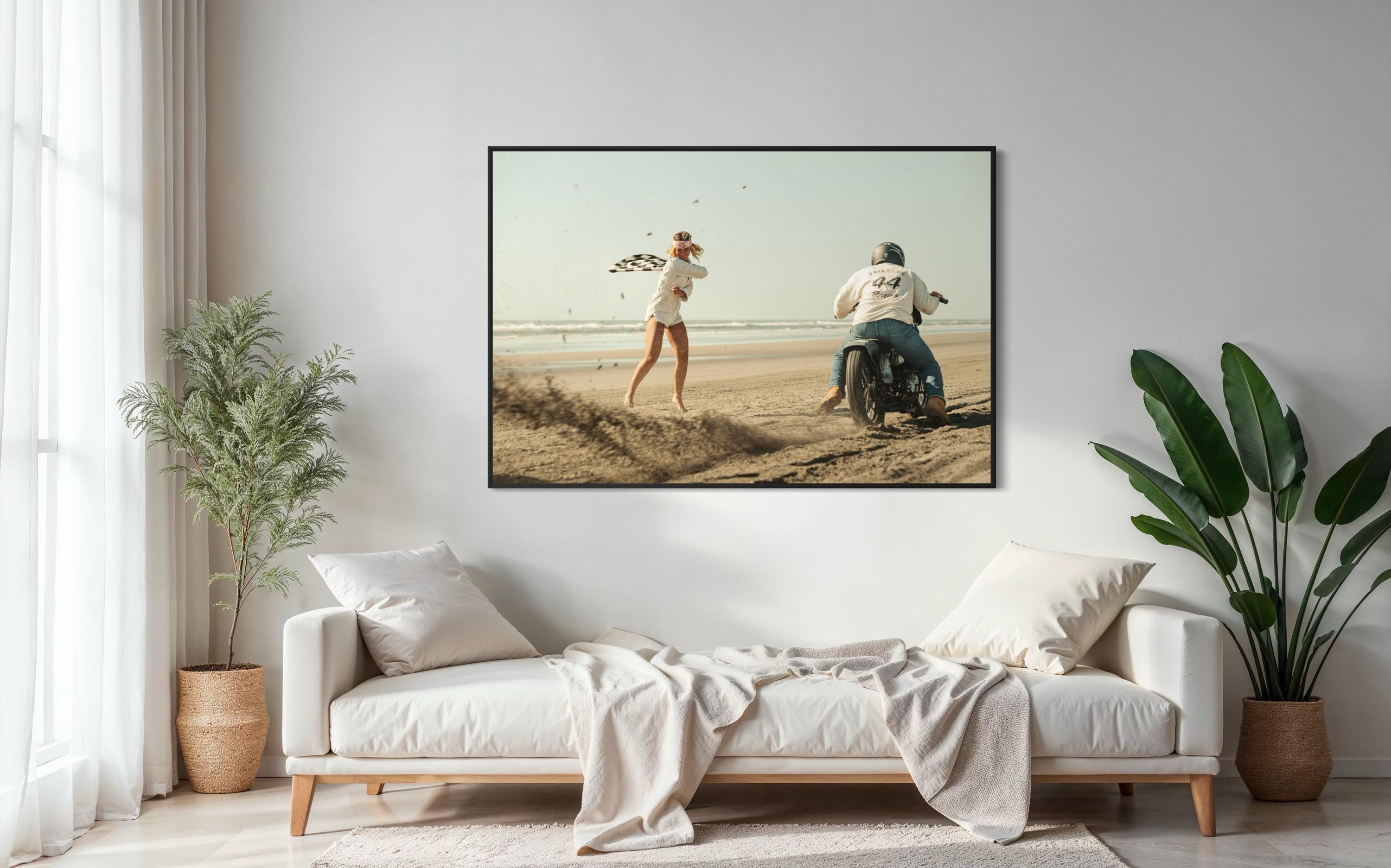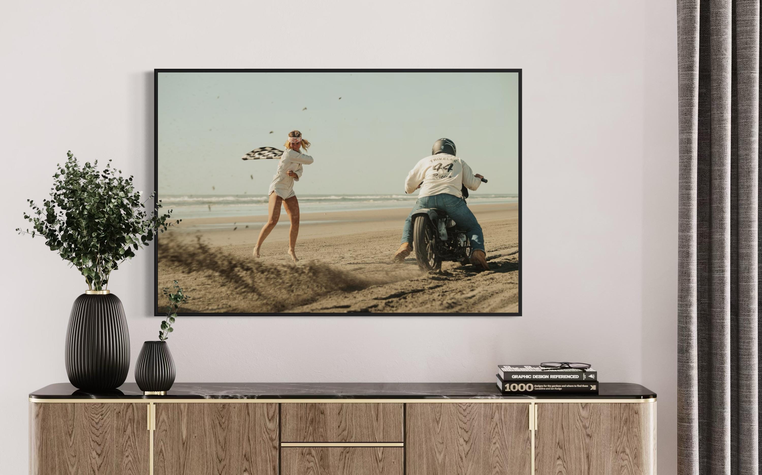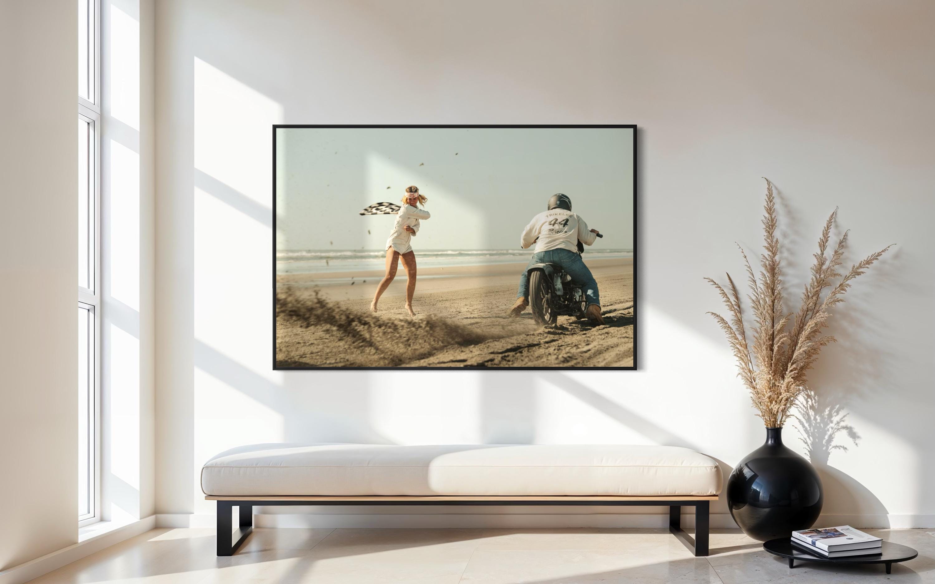 Capture the electric rush of vintage beach racing with this dynamic photograph from The Race of Gentlemen (TROG). A bold Harley-Davidson flag girl launches a racer into the sand-slinging moment of motion — raw energy, grit, and style collide in this nostalgic piece of Americana.