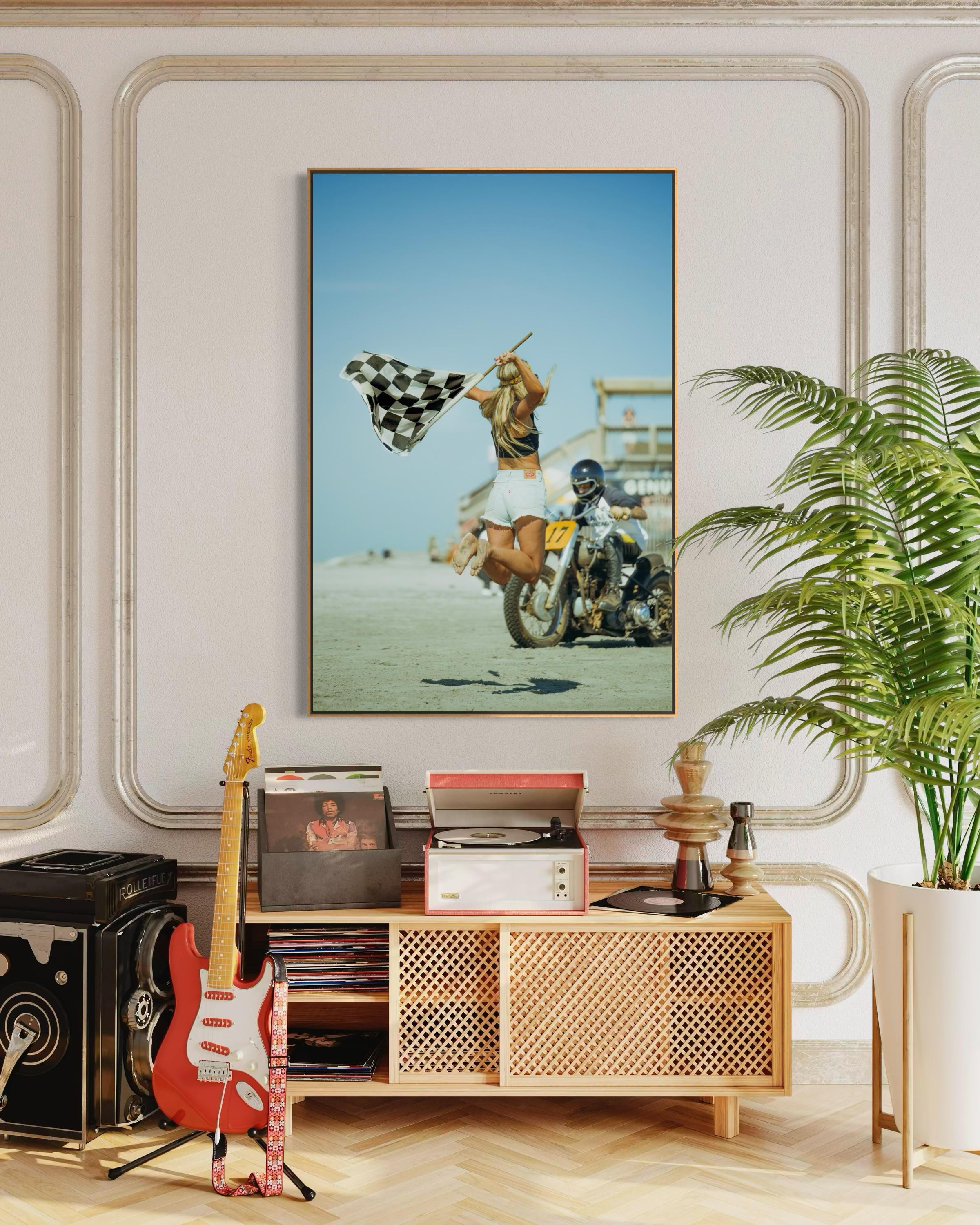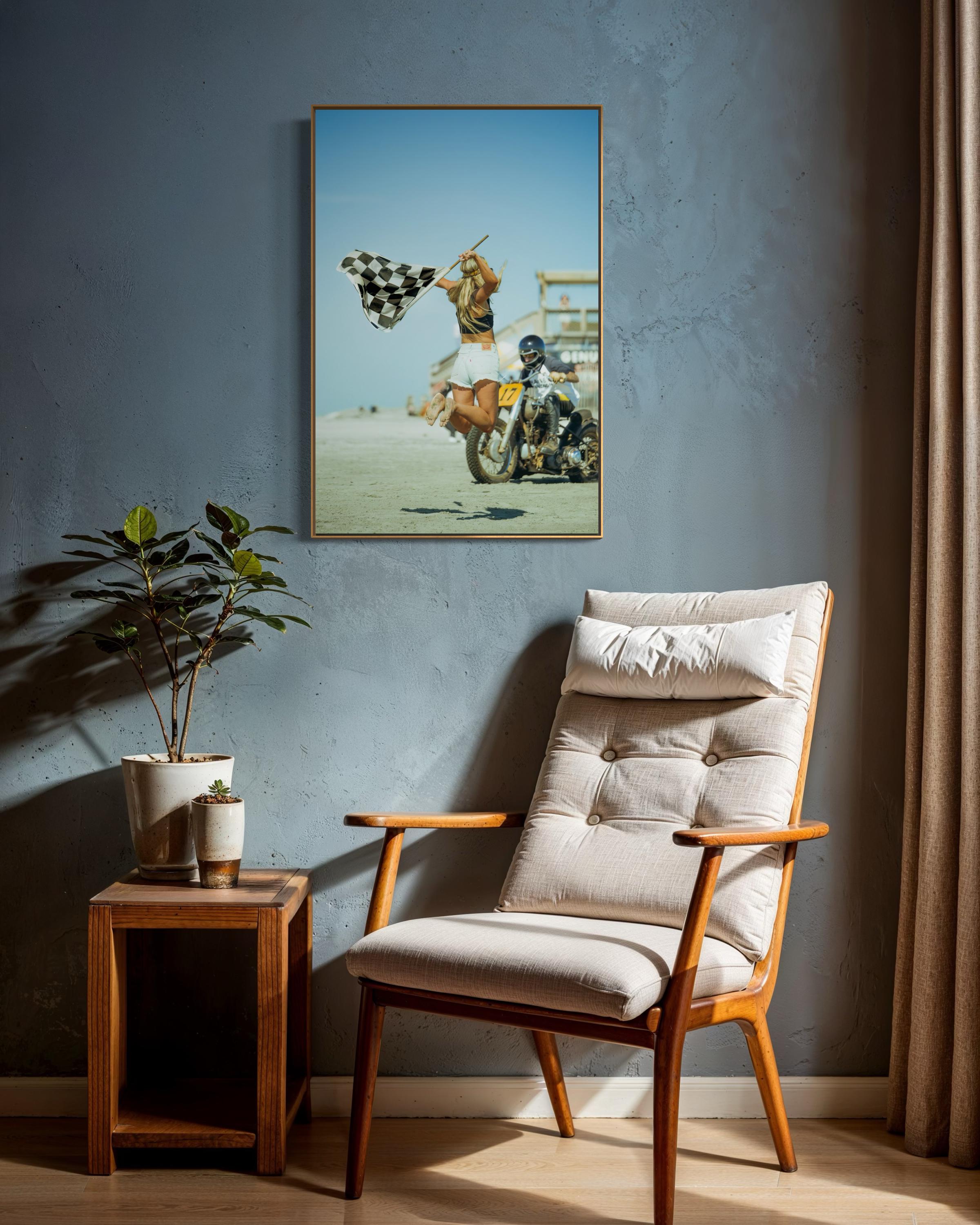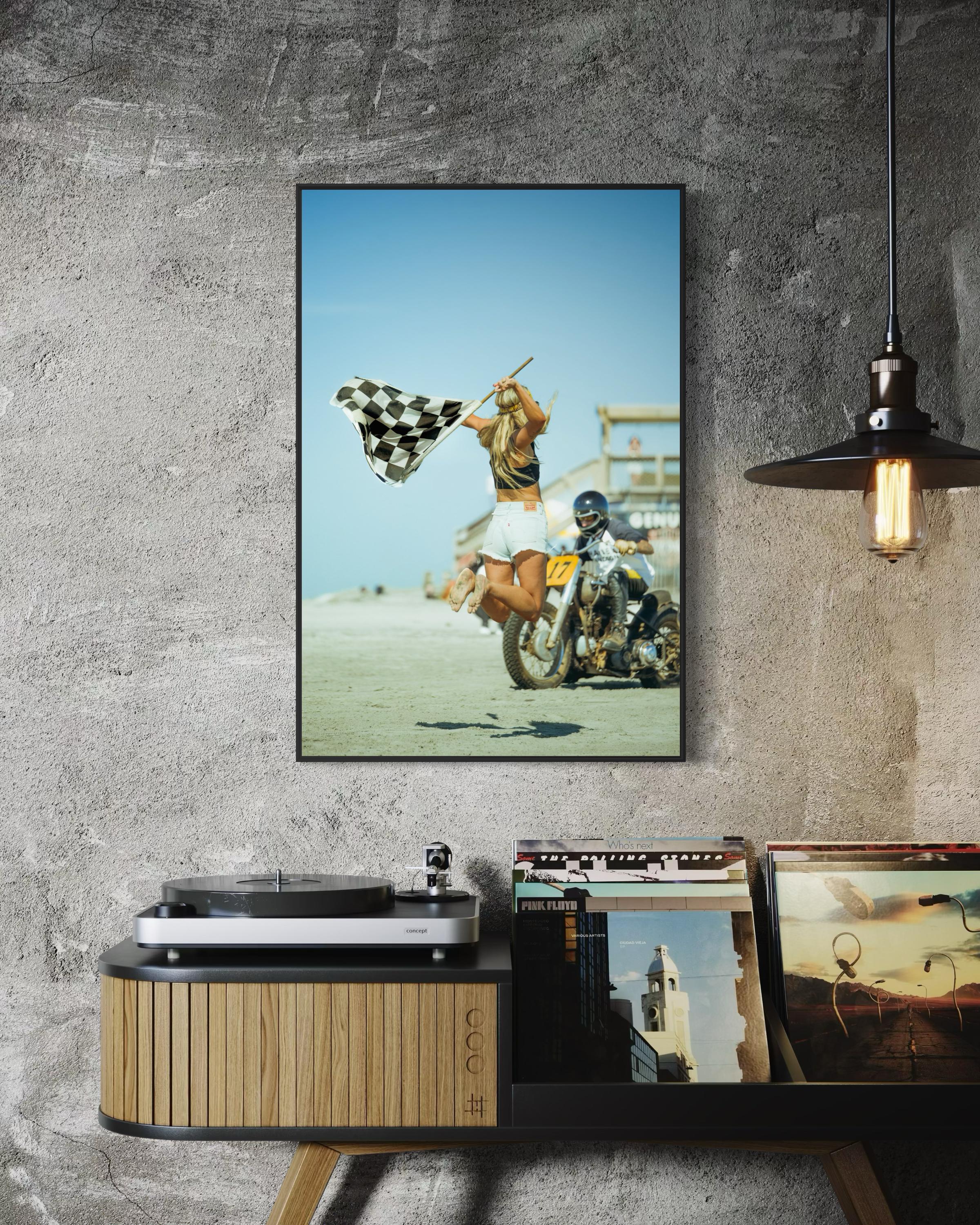 Fine Art Print - Vintage Motorcycle Race Start with Flag Girl and Race Flag, TROG, Pin up, race of gentlemen, beach race, Americana Decor