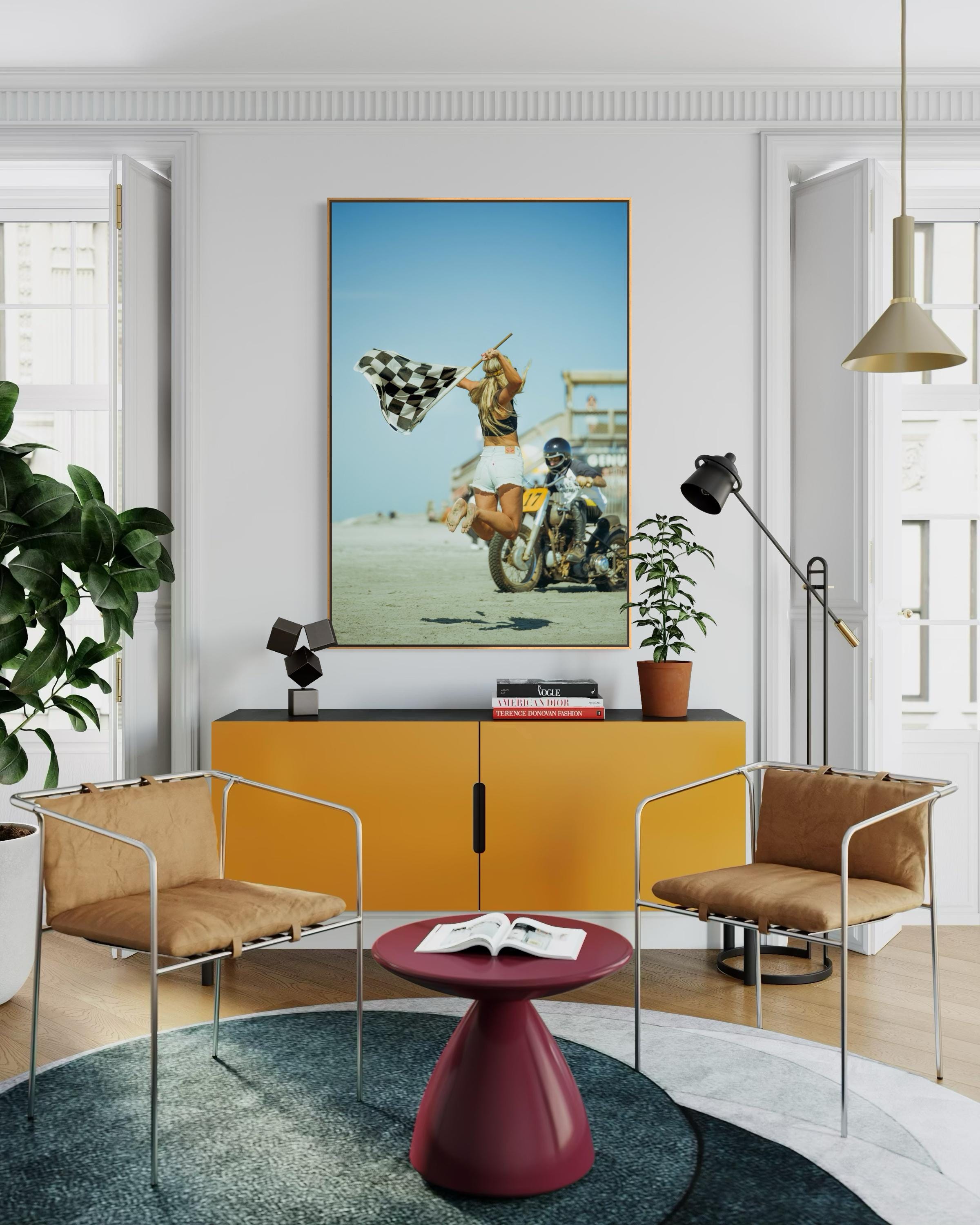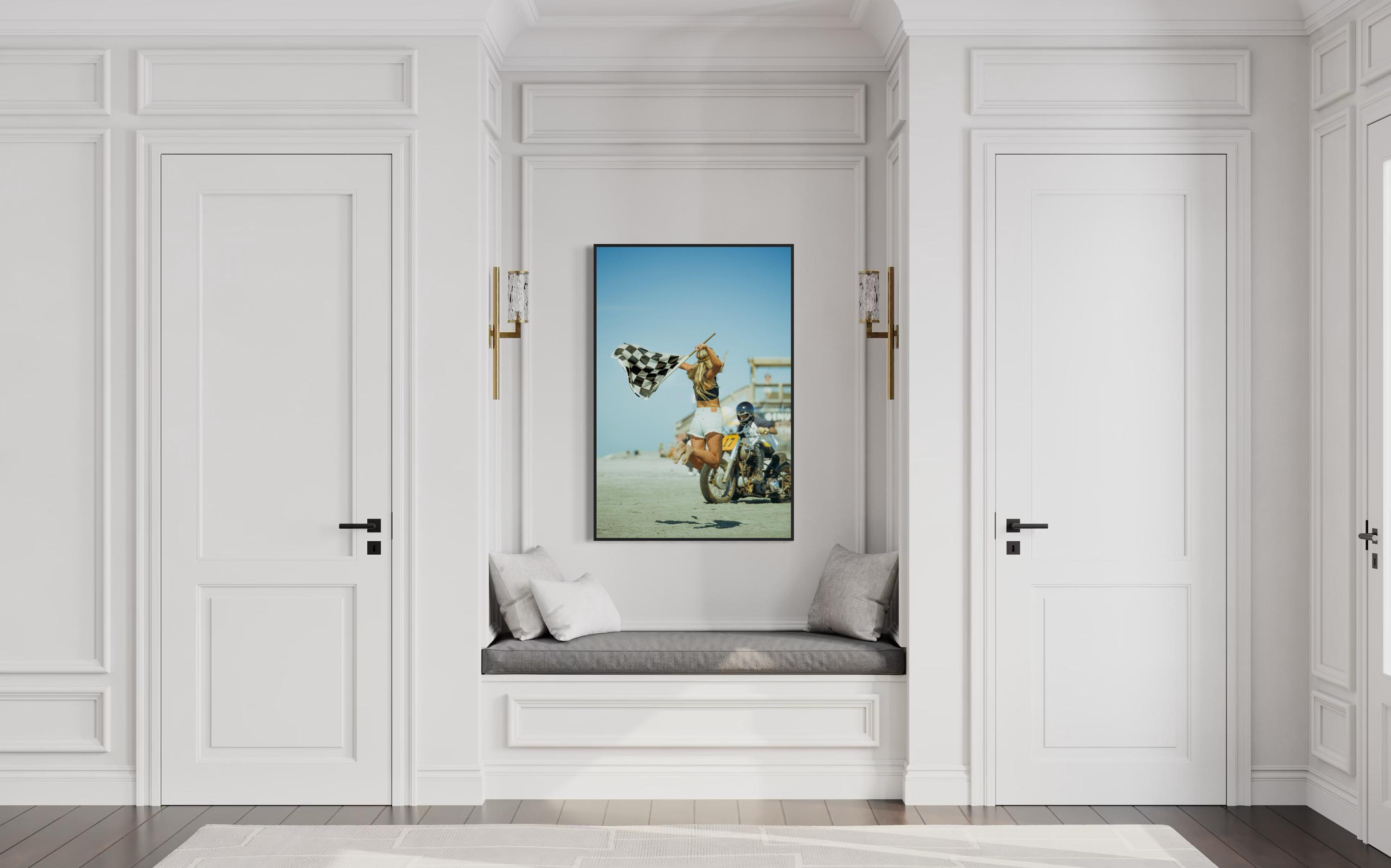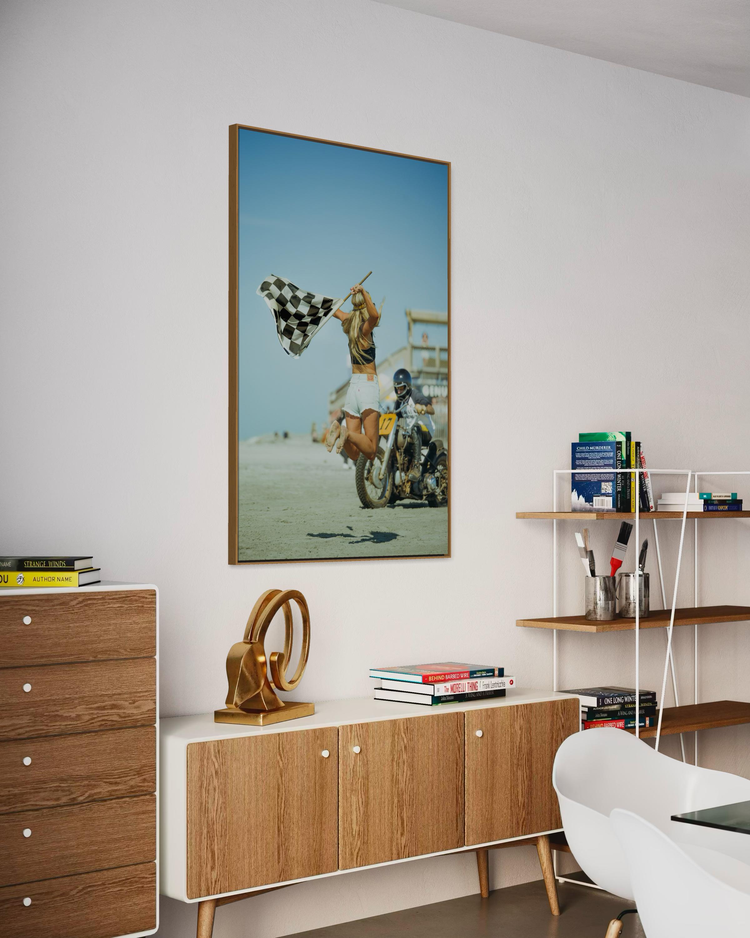 Fine Art Print - Vintage Motorcycle Race Start with Flag Girl and Race Flag, TROG, Pin up, race of gentlemen, beach race, Americana Decor
