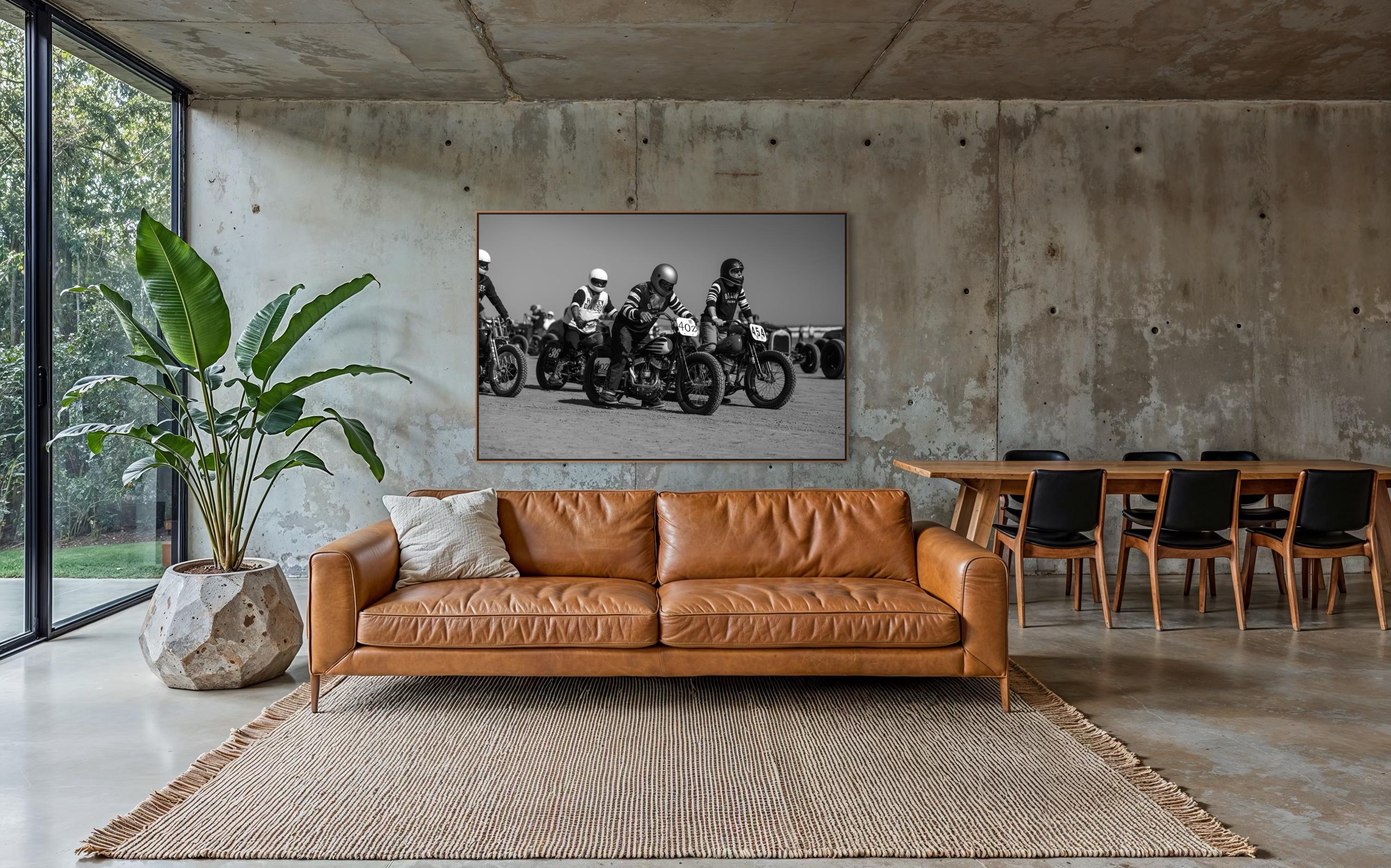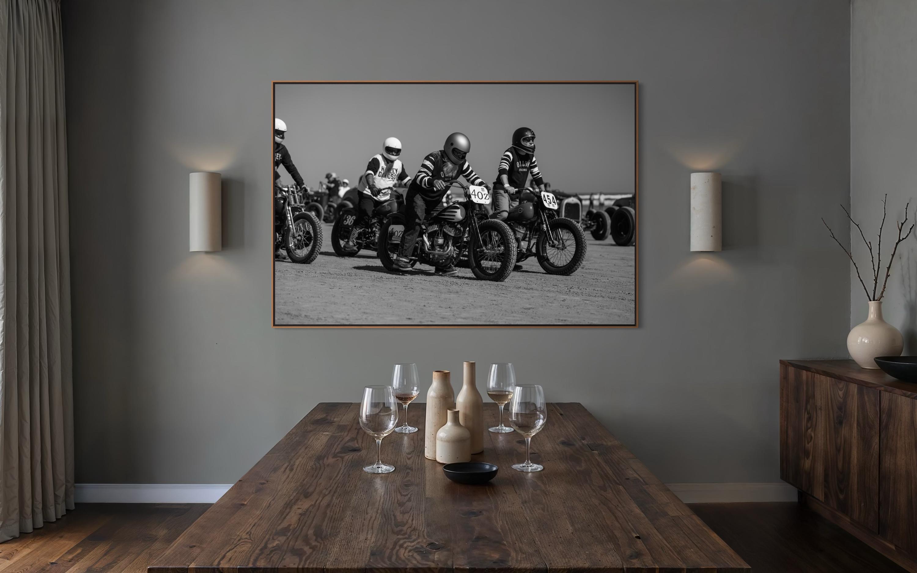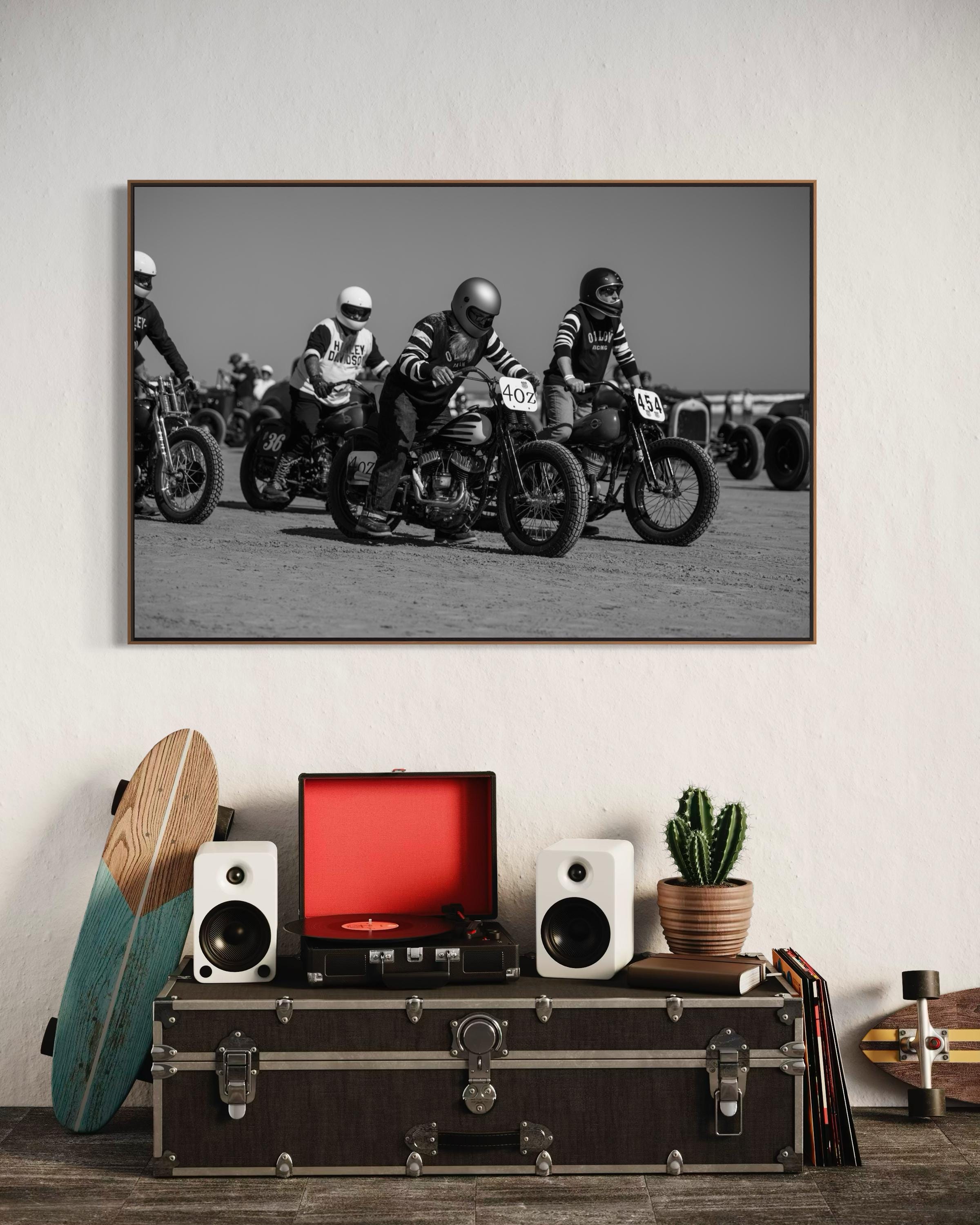 Captured moments before ignition, this striking black-and-white photo brings you into the adrenaline-charged atmosphere of The Race of Gentlemen. Lined up on the sandy start line, vintage Harley and Indian motorcycles sit poised beneath their determined riders, dressed in period-correct racing gear. Grit, style, and timeless brotherhood—frozen in time.
