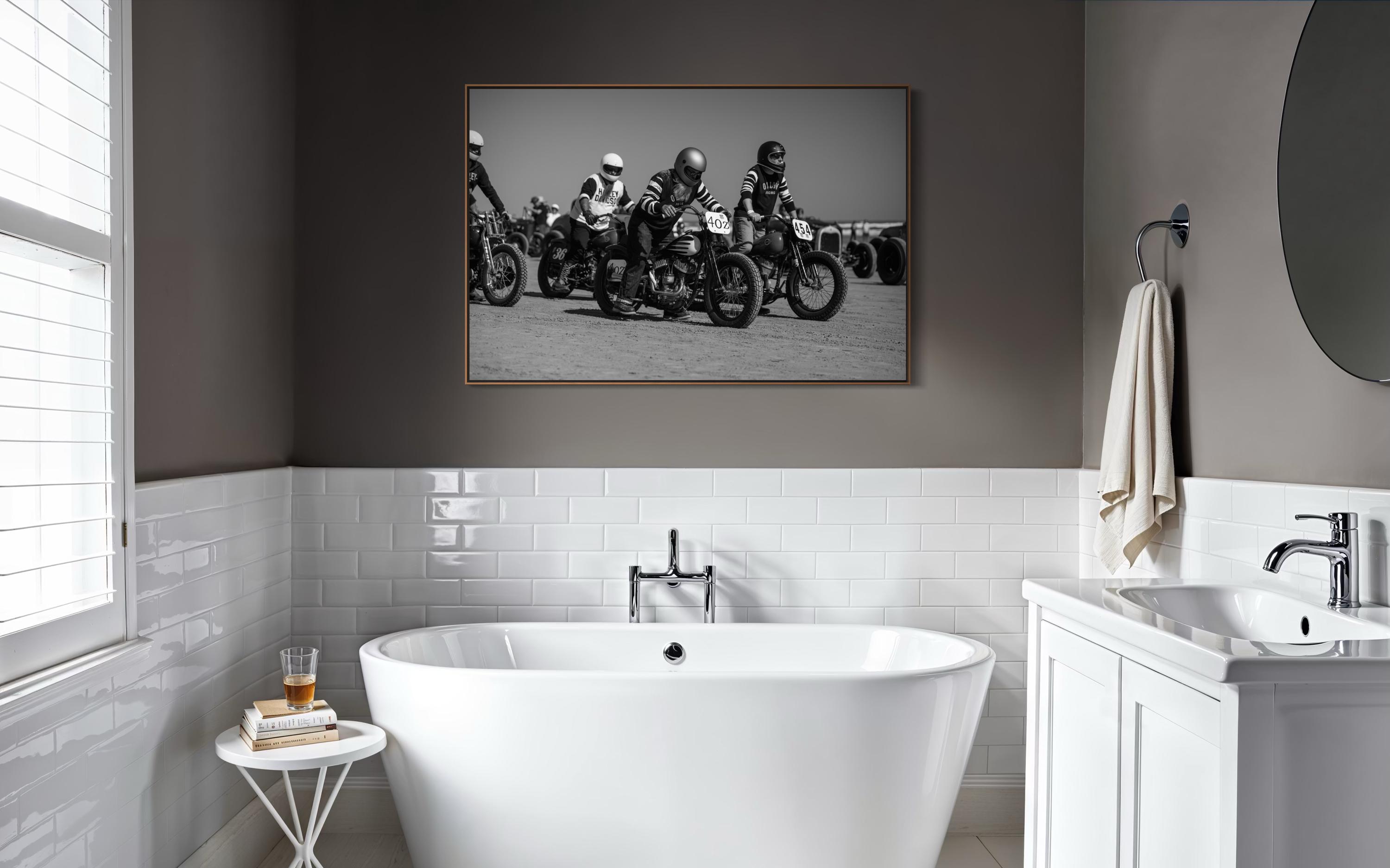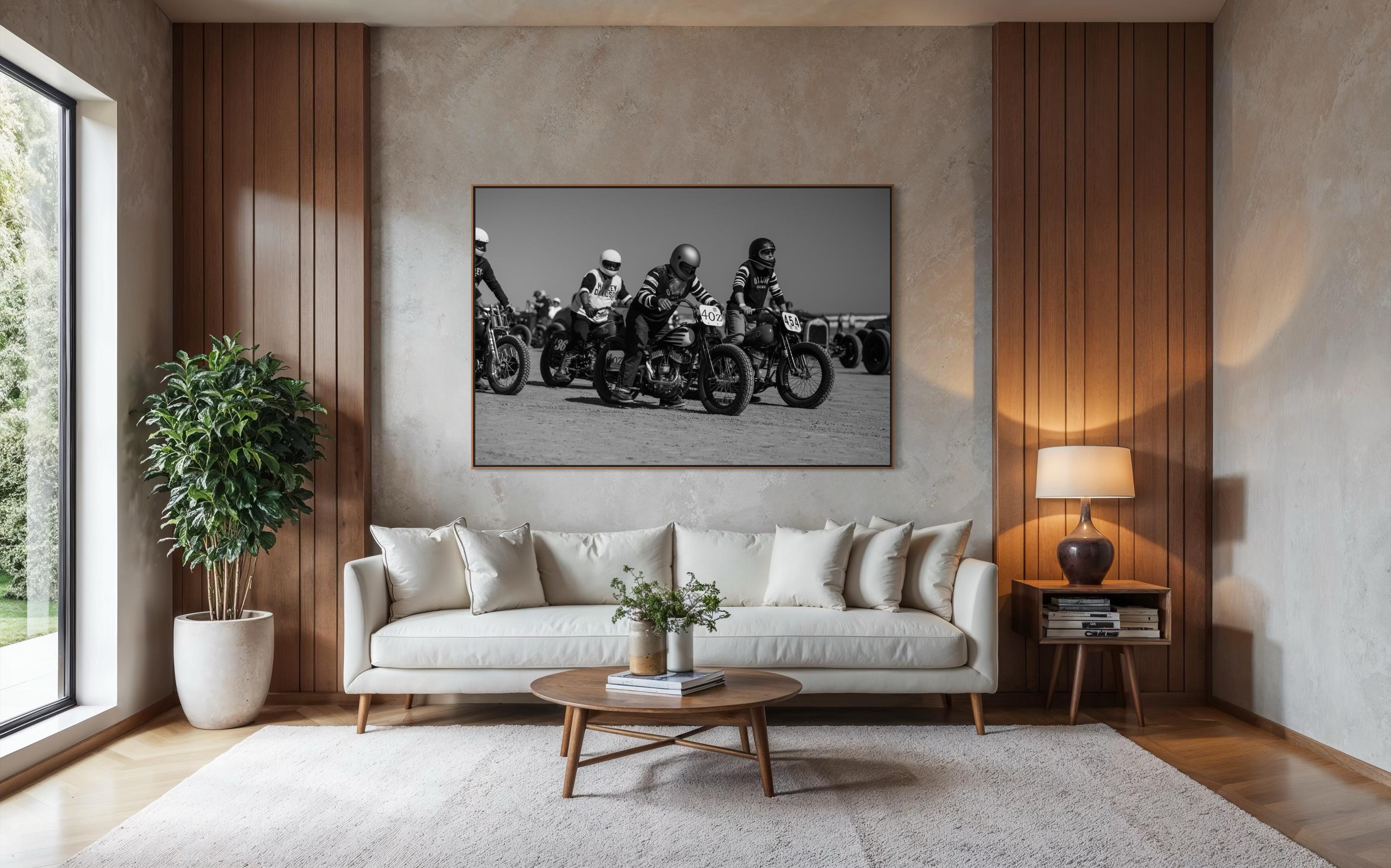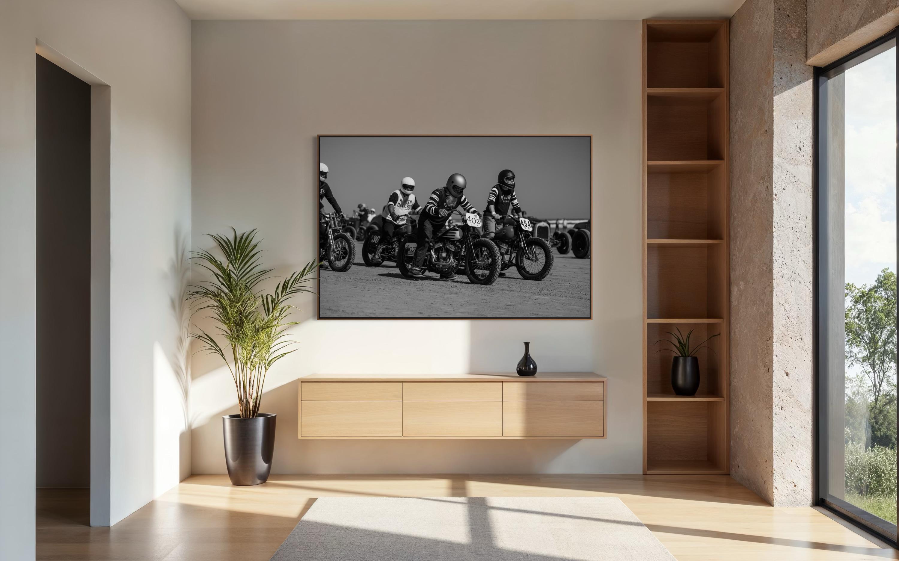 Captured moments before ignition, this striking black-and-white photo brings you into the adrenaline-charged atmosphere of The Race of Gentlemen. Lined up on the sandy start line, vintage Harley and Indian motorcycles sit poised beneath their determined riders, dressed in period-correct racing gear. Grit, style, and timeless brotherhood—frozen in time.