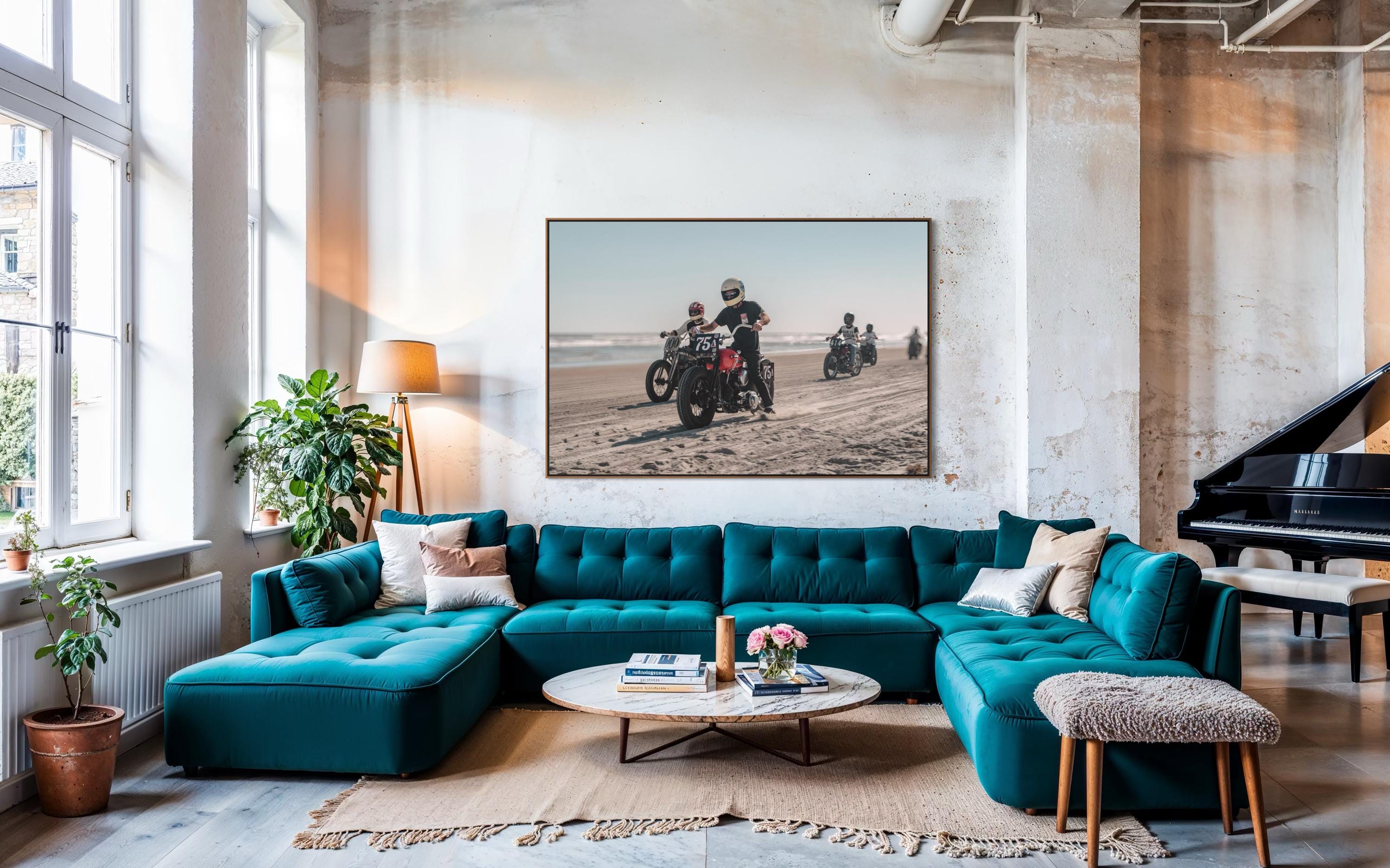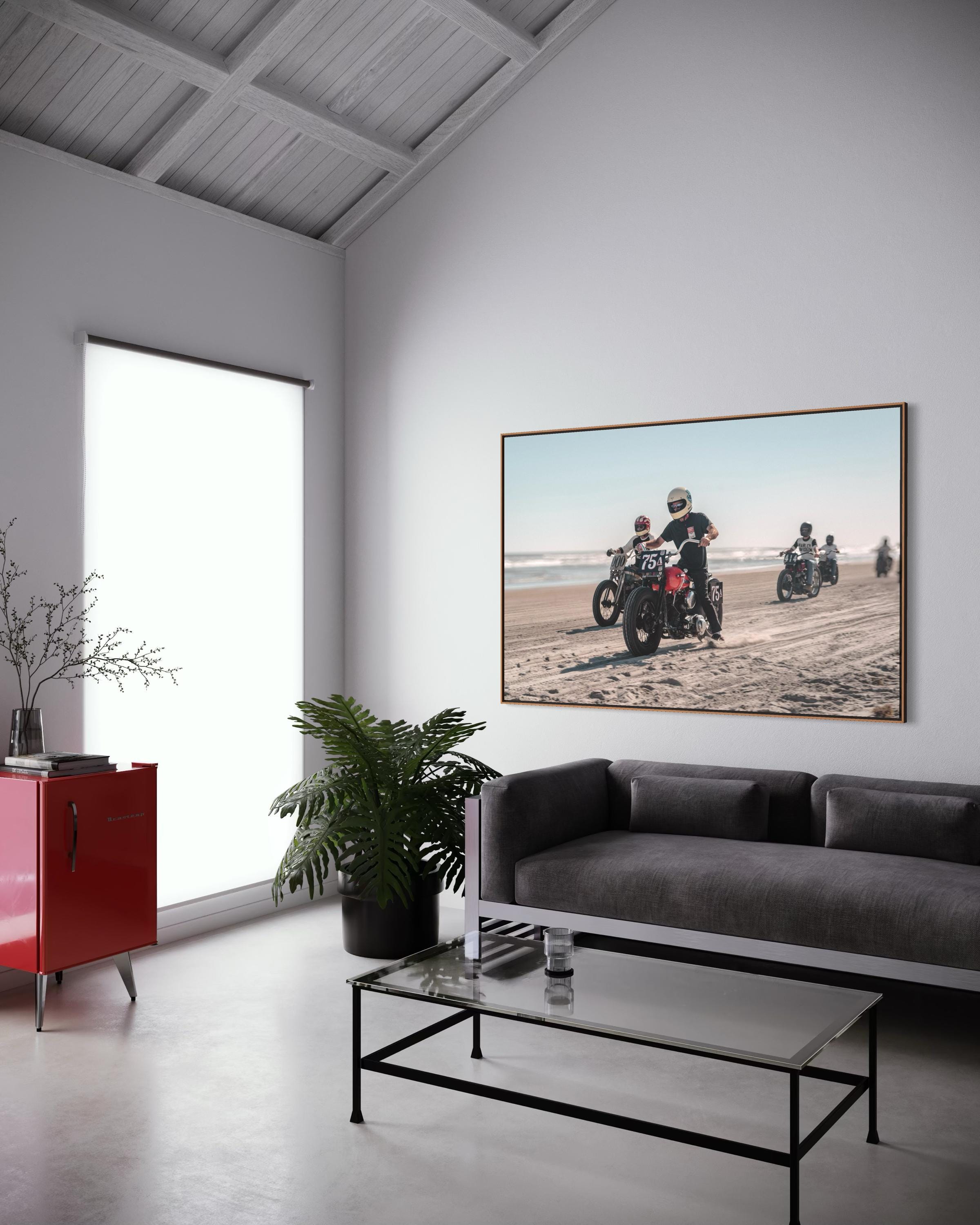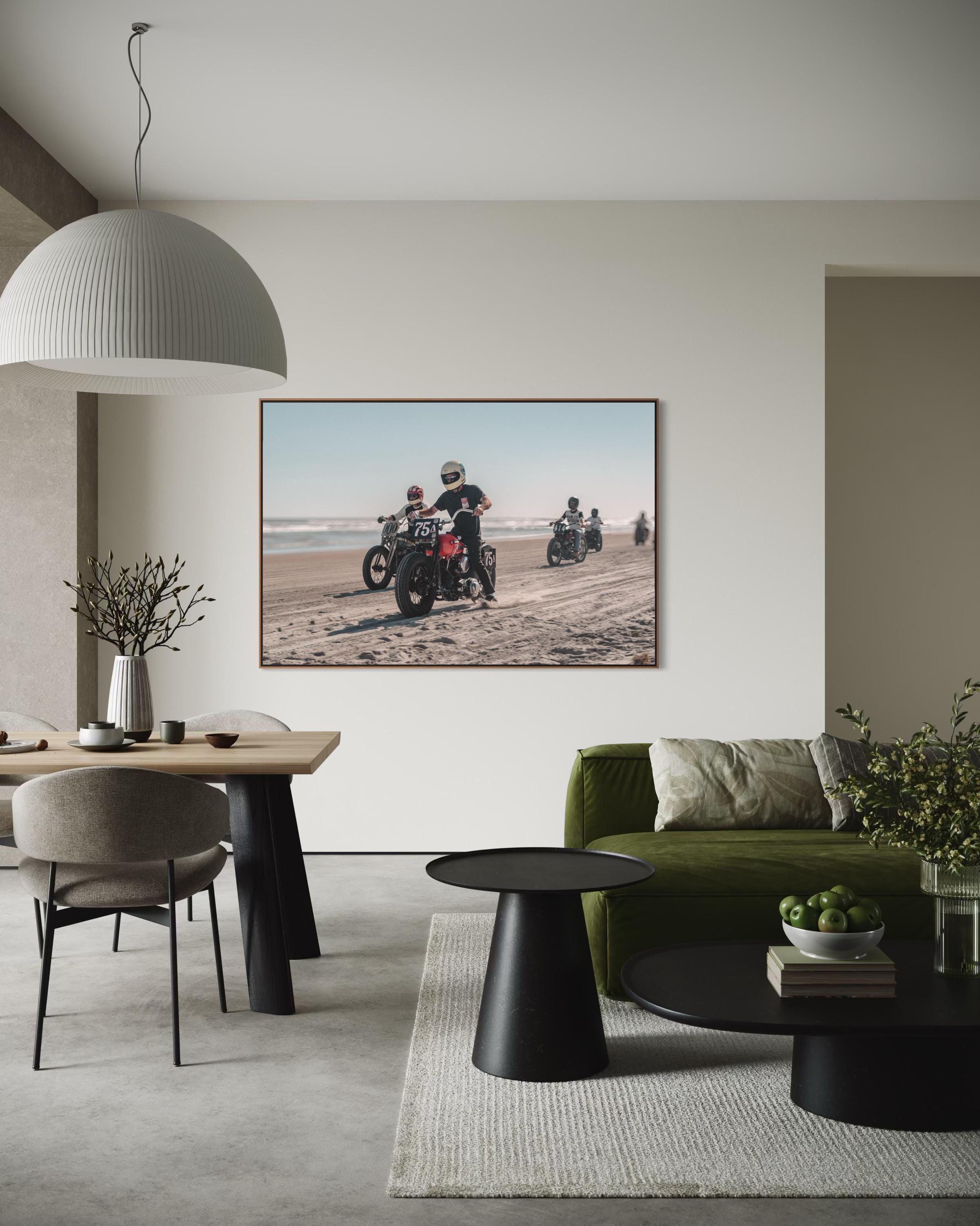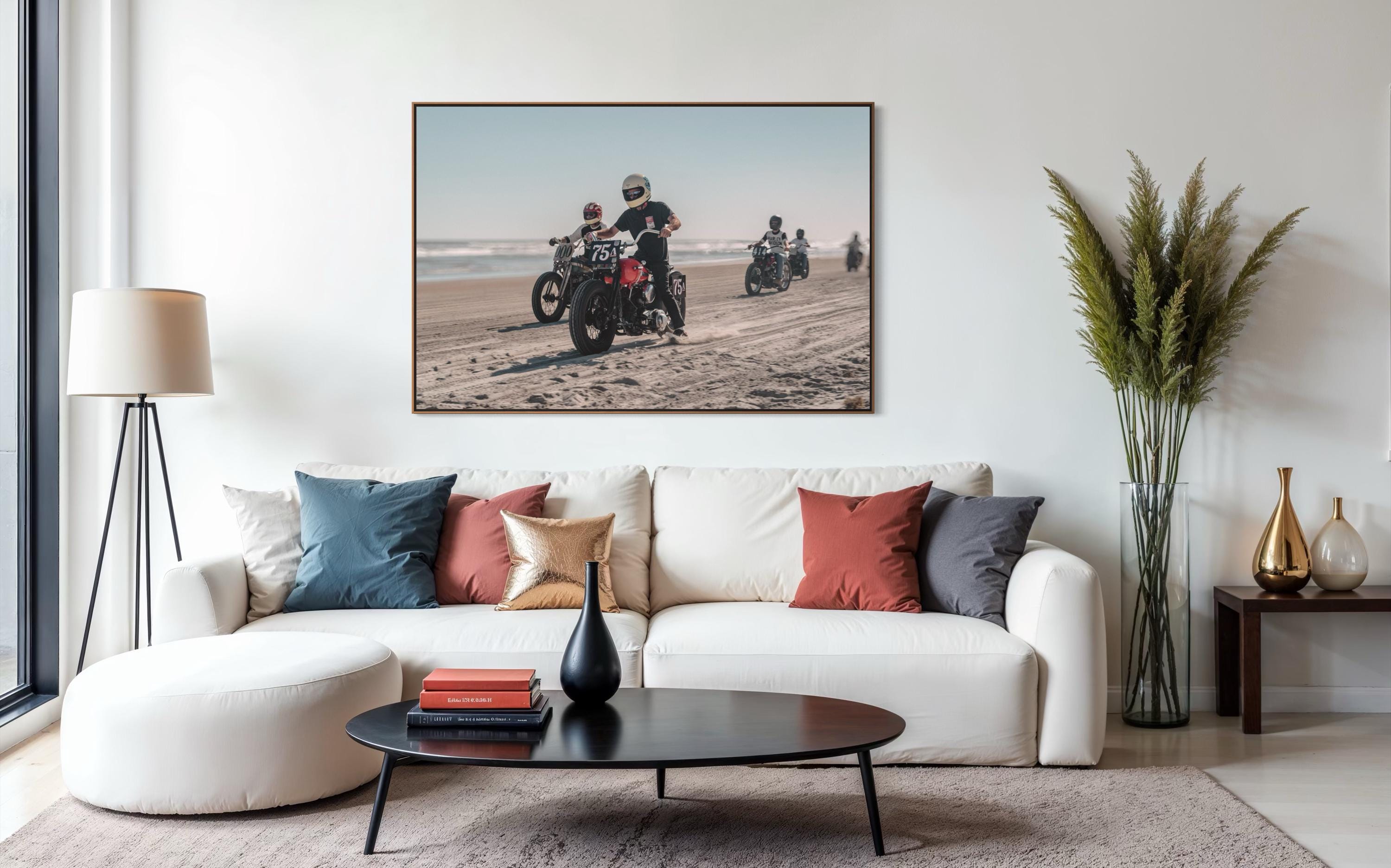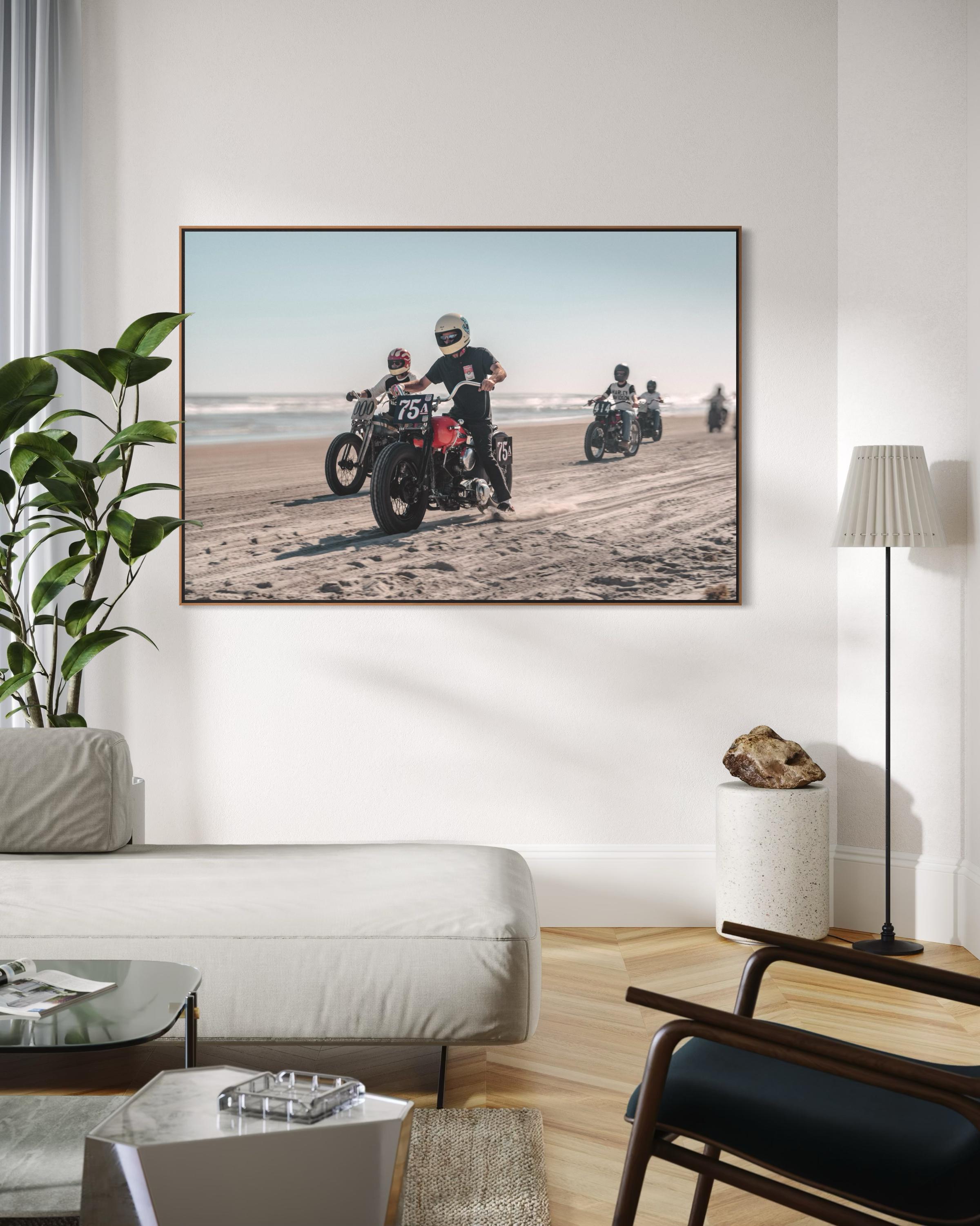 Captured mid-race at The Race of Gentlemen, this photograph showcases a rare and visceral moment: racers pushing their vintage motorcycles across the sand, grit in their eyes and determination in every step. Numbered bikes, sandy boots, and hand-painted helmets bring the spirit of classic beach racing roaring to life.