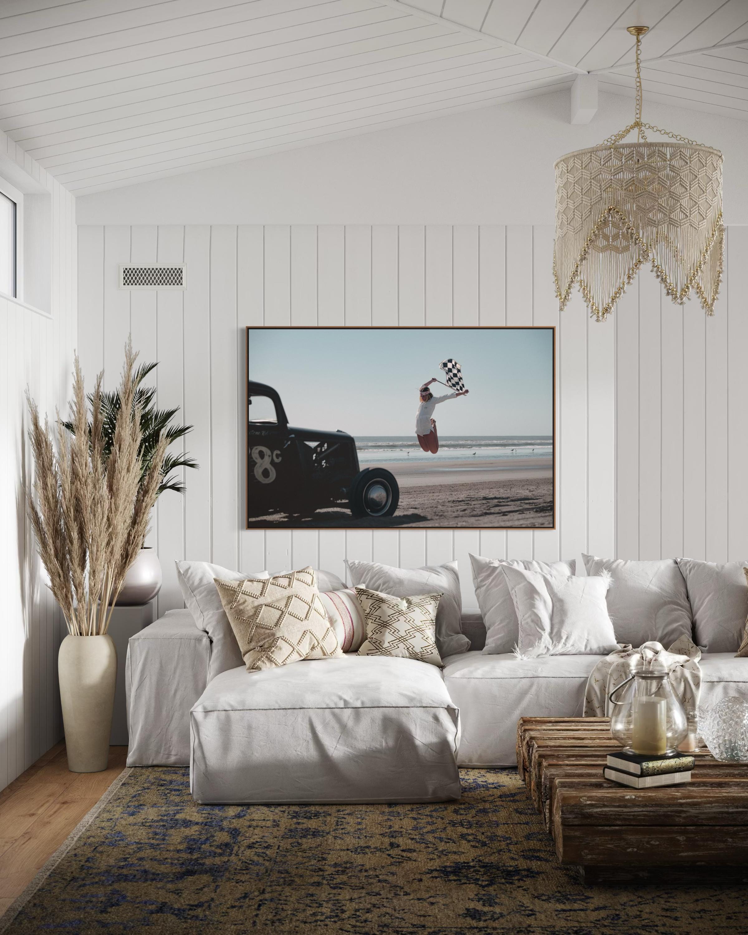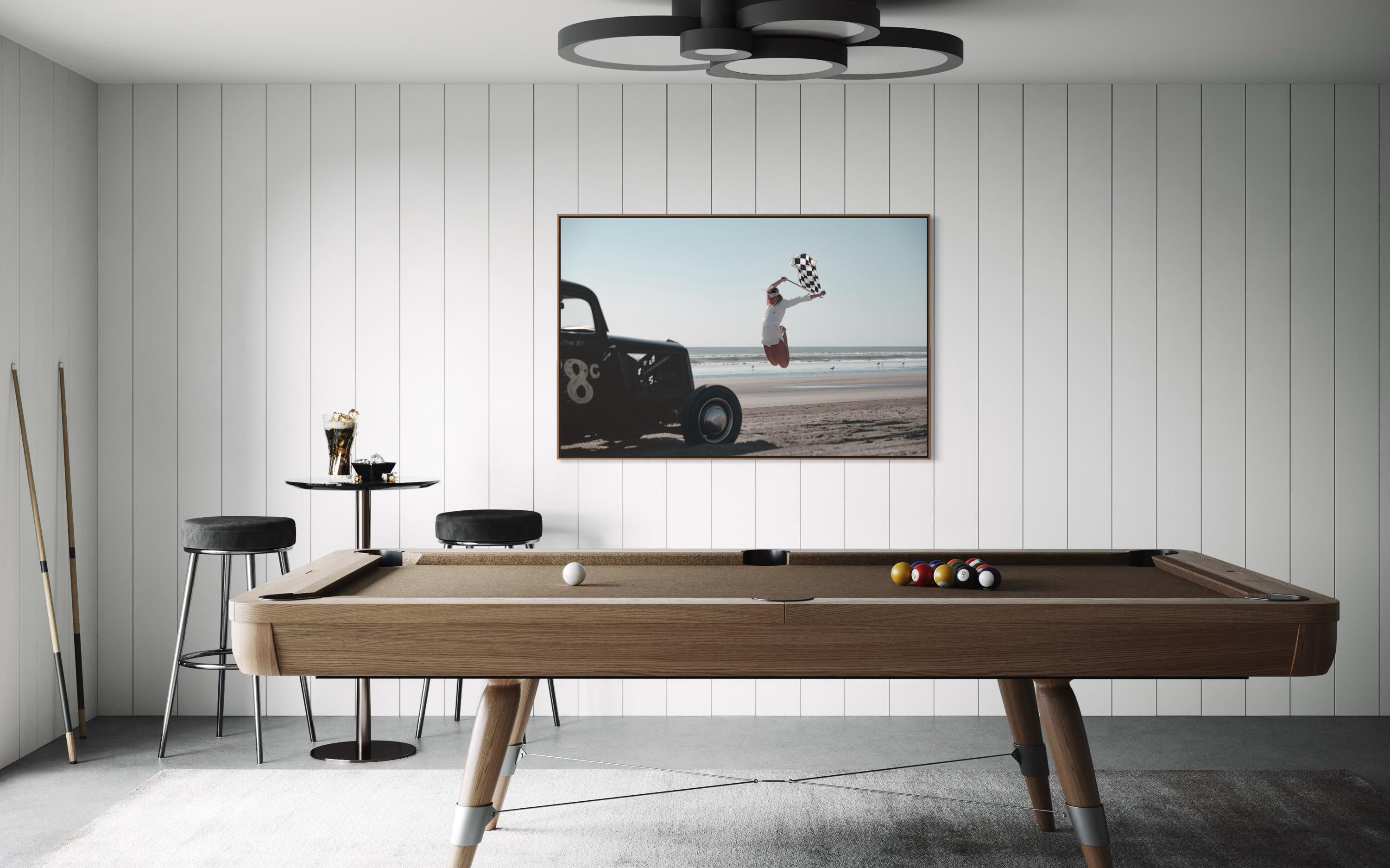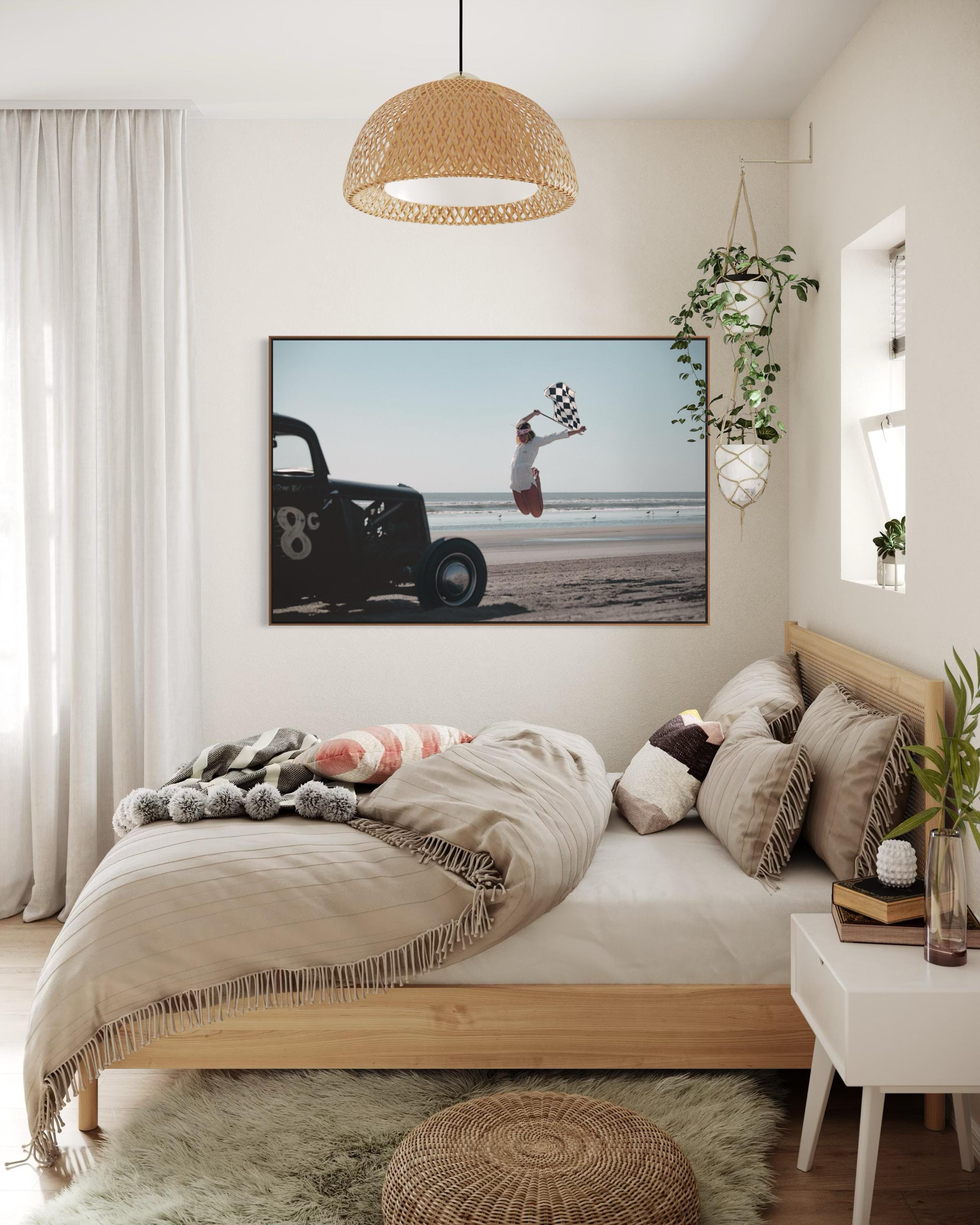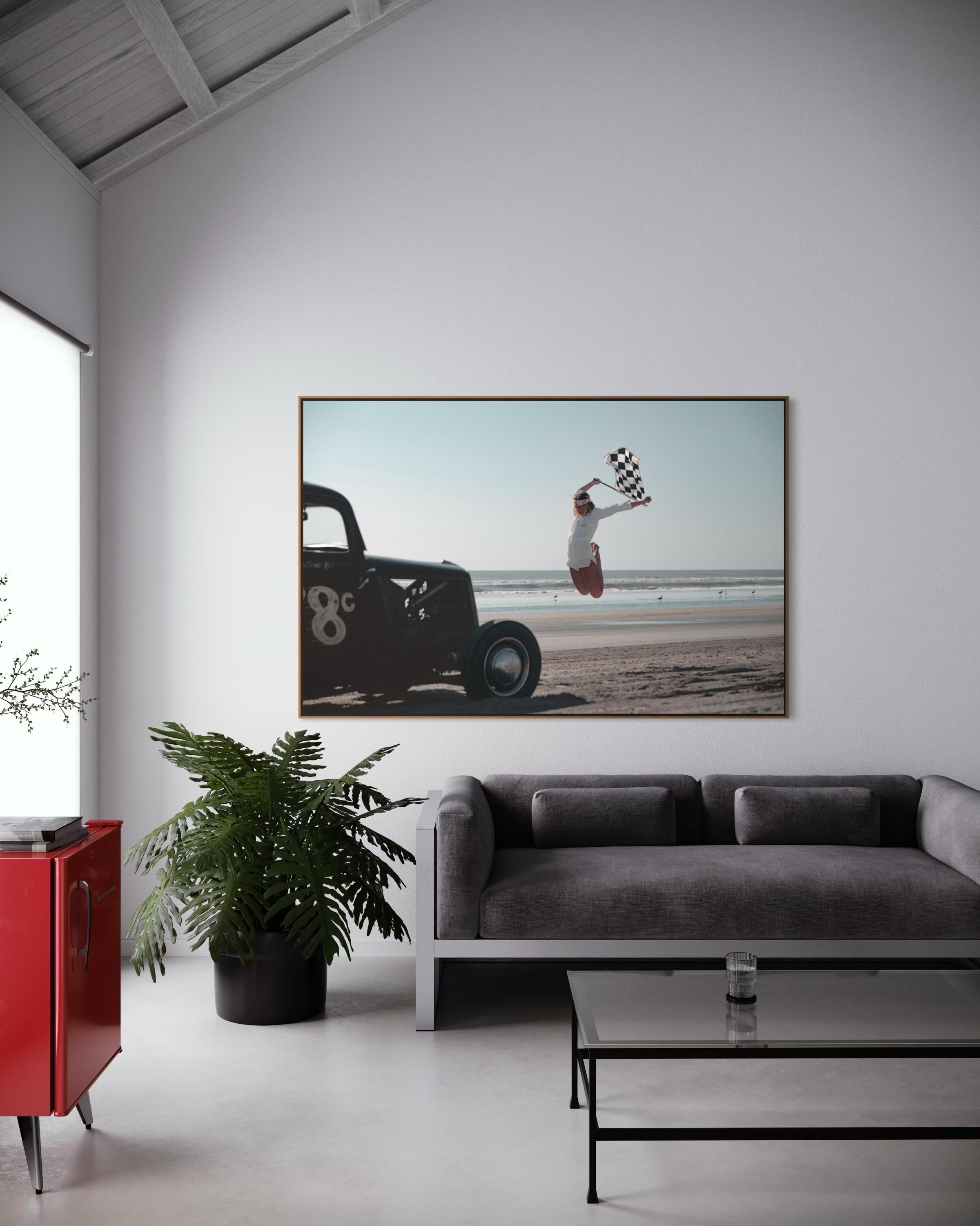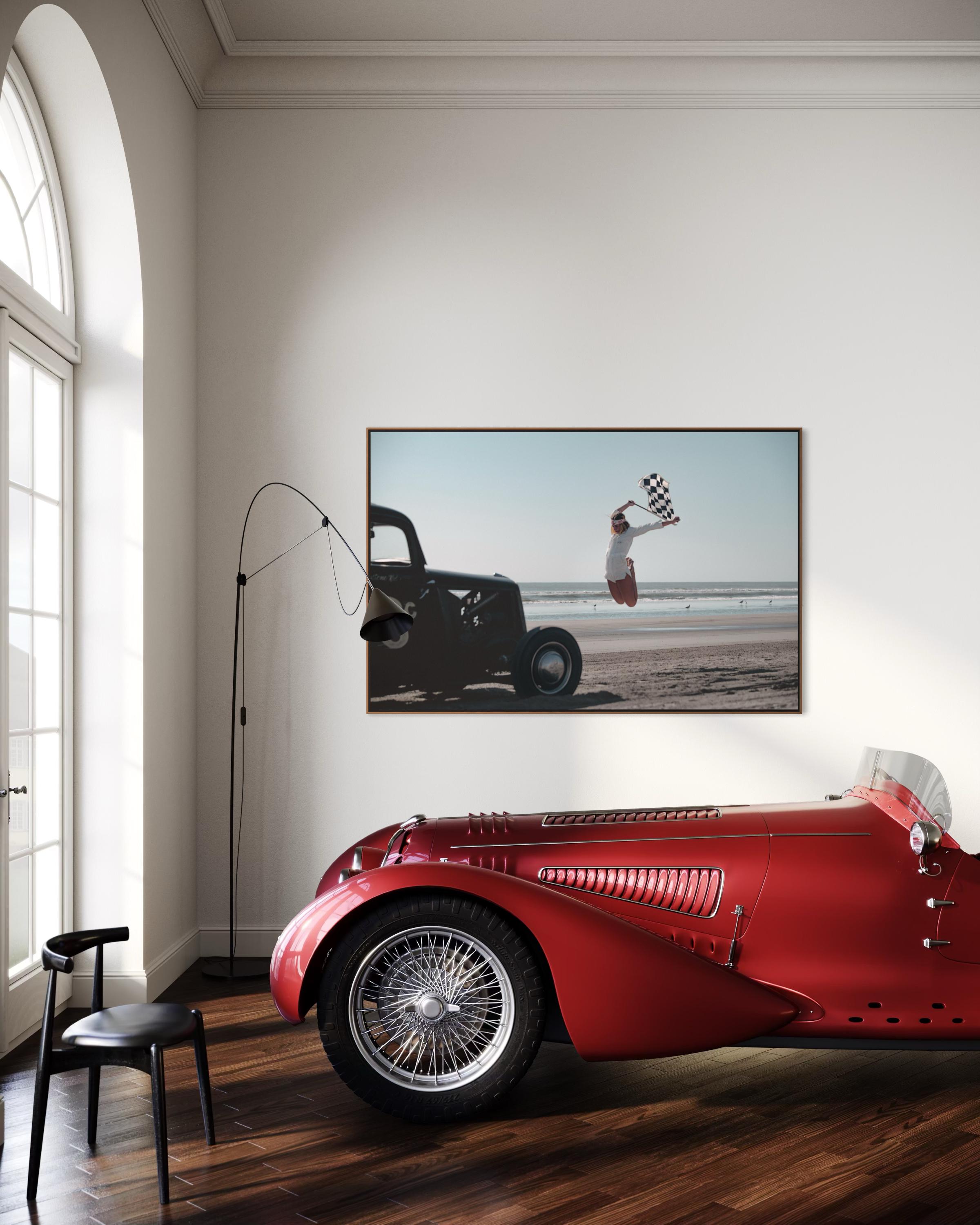 Fine Art Print - Vintage Hot Rod race on Beach Race Girl with Checkered Flag, garage poster, gift, TROG