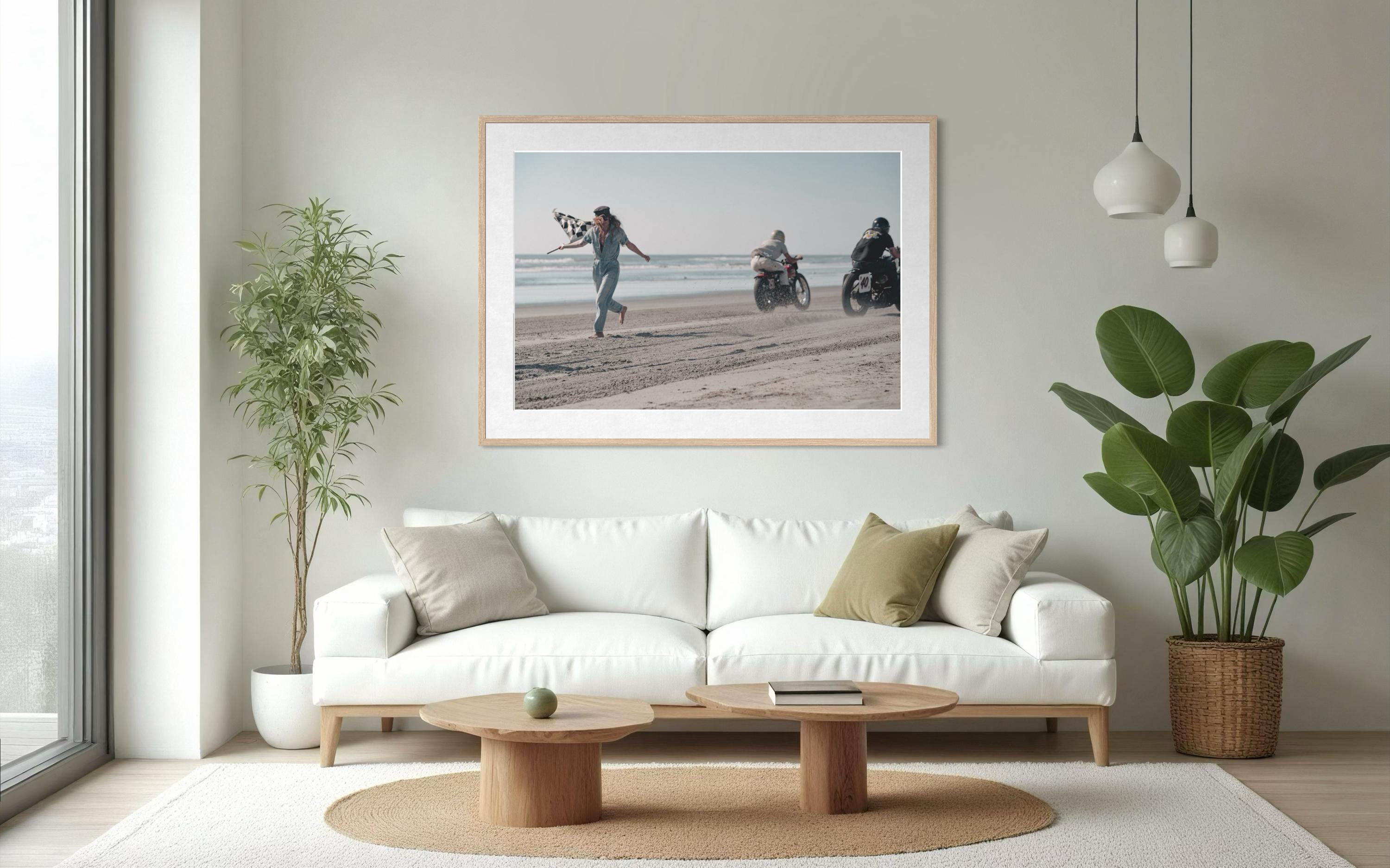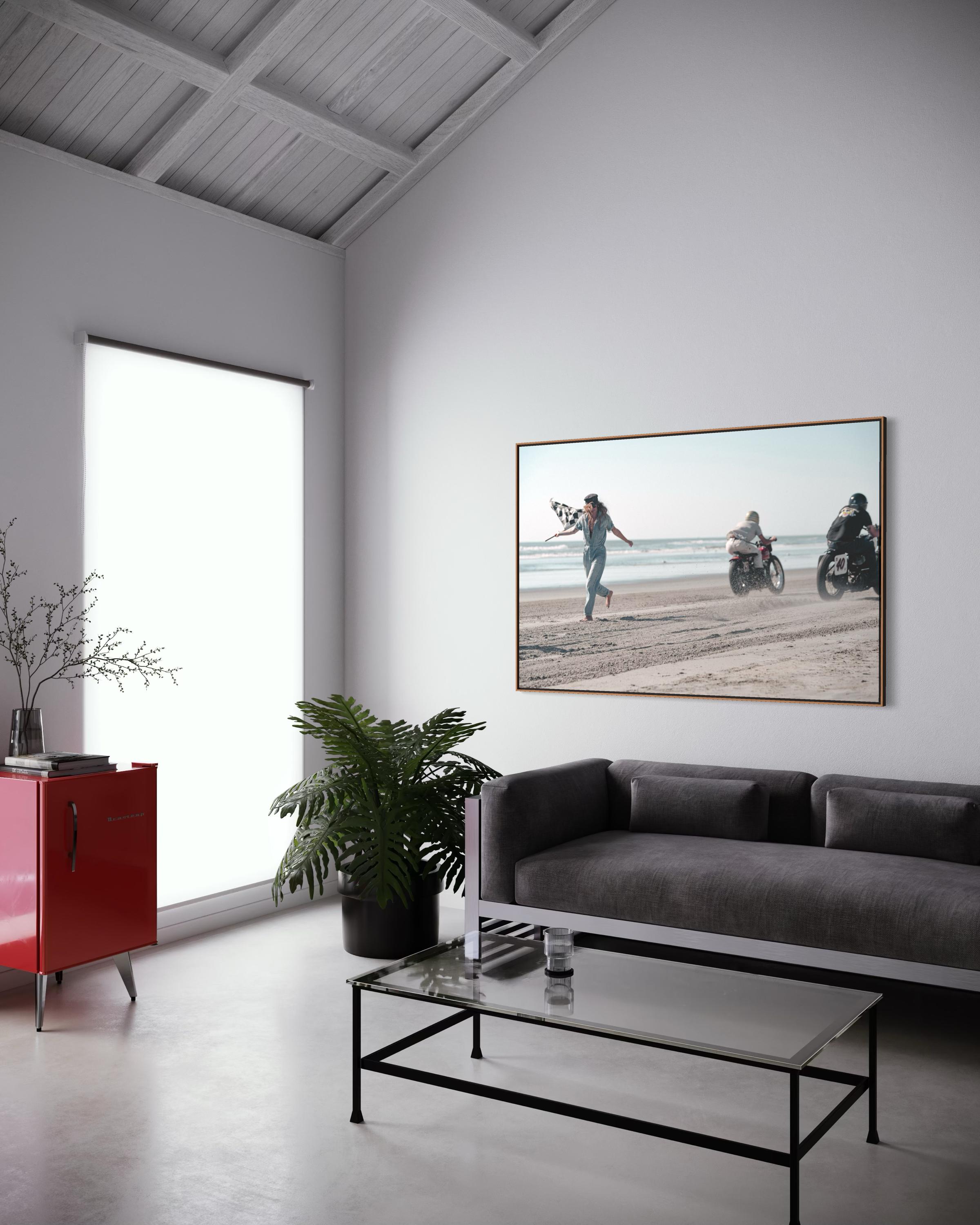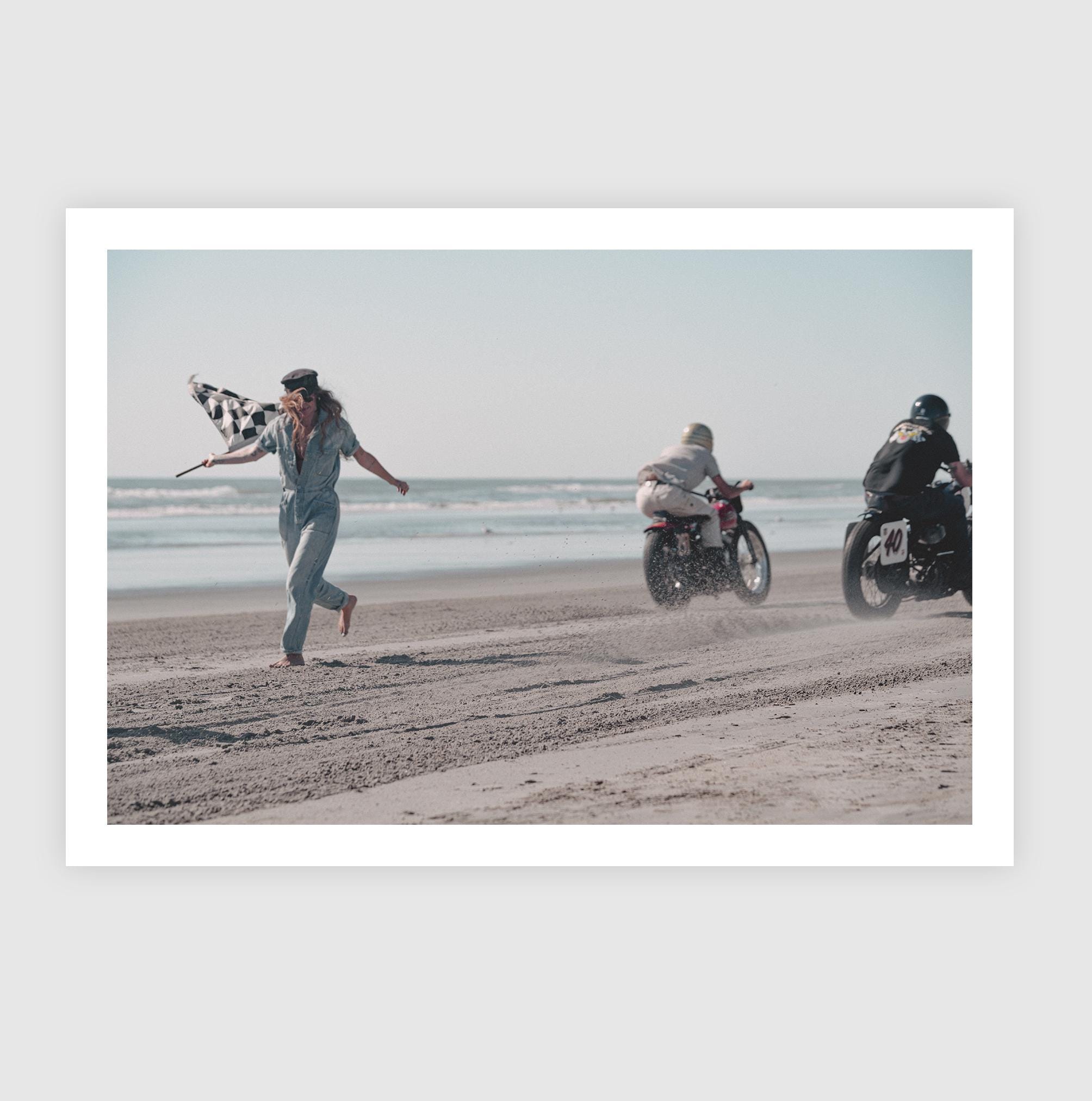 The flag drops, sand flies, and the race is on. This dynamic print captures the electrifying moment of launch at The Race of Gentlemen (TROG), where a barefoot flag girl dashes across the sand as vintage bikes roar past her. Rider #100 rockets forward while the ocean gleams in the background.