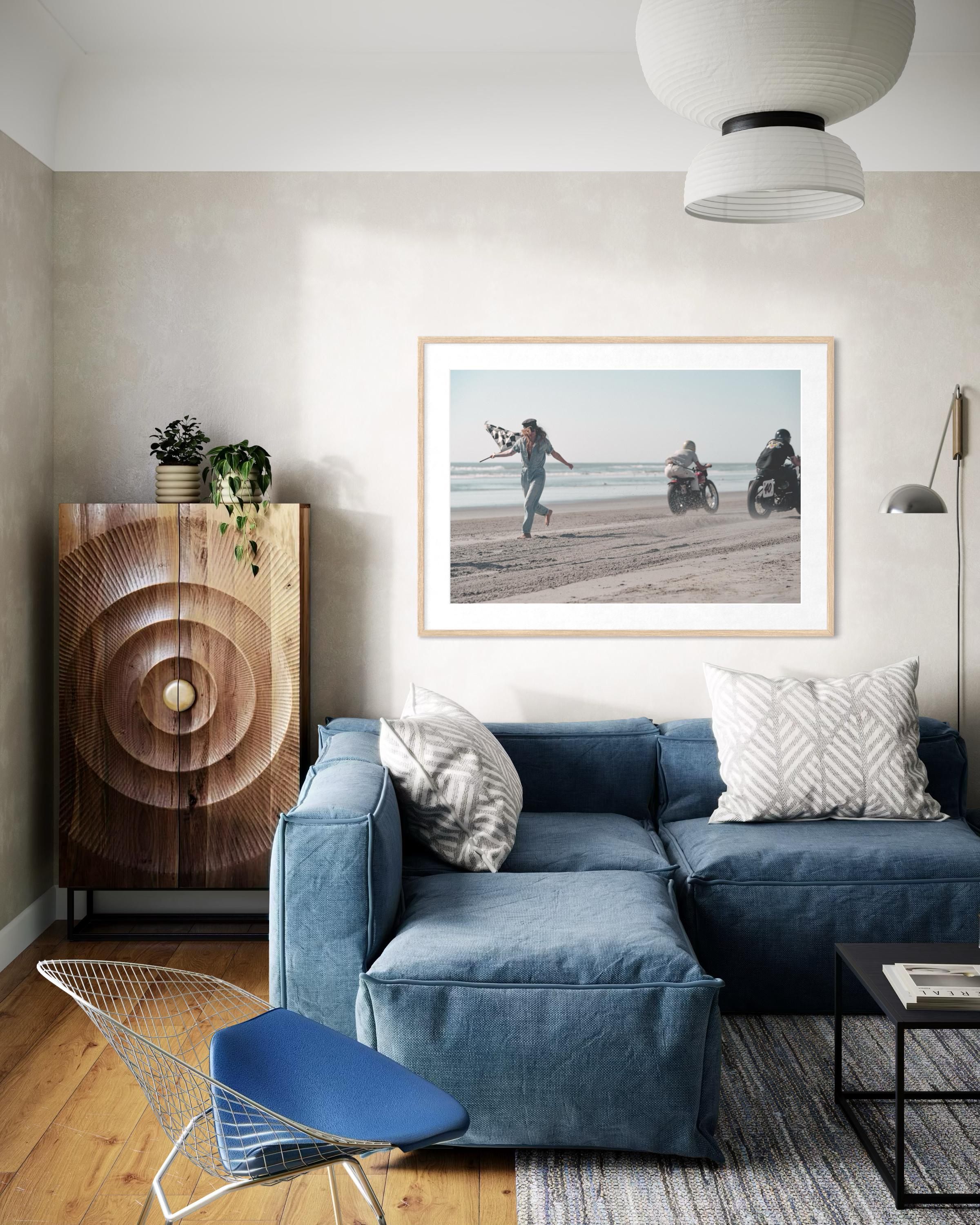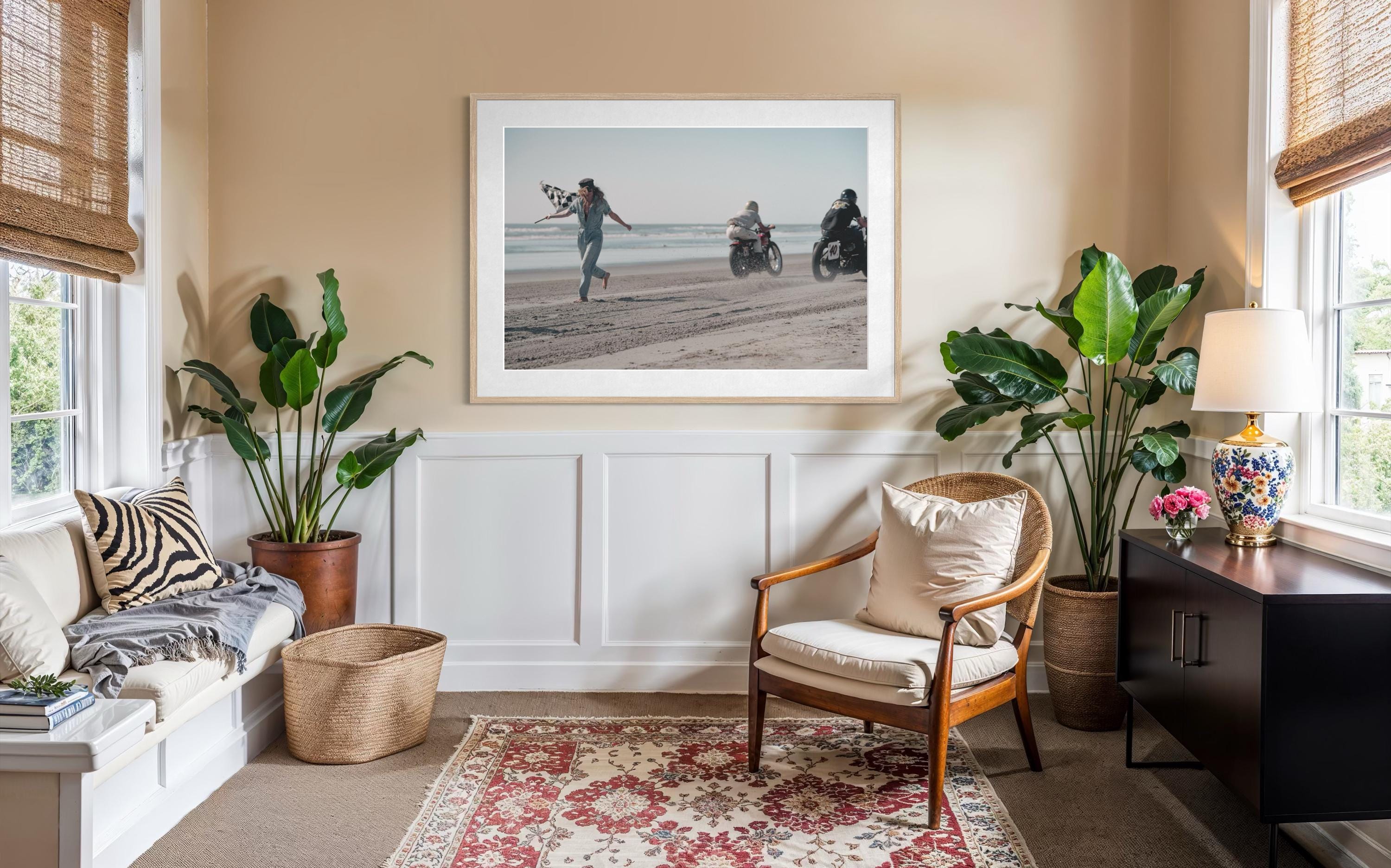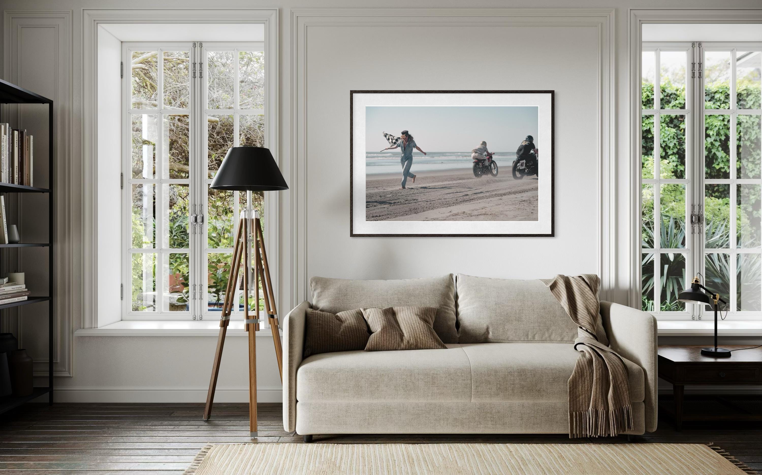 The flag drops, sand flies, and the race is on. This dynamic print captures the electrifying moment of launch at The Race of Gentlemen (TROG), where a barefoot flag girl dashes across the sand as vintage bikes roar past her. Rider #100 rockets forward while the ocean gleams in the background.