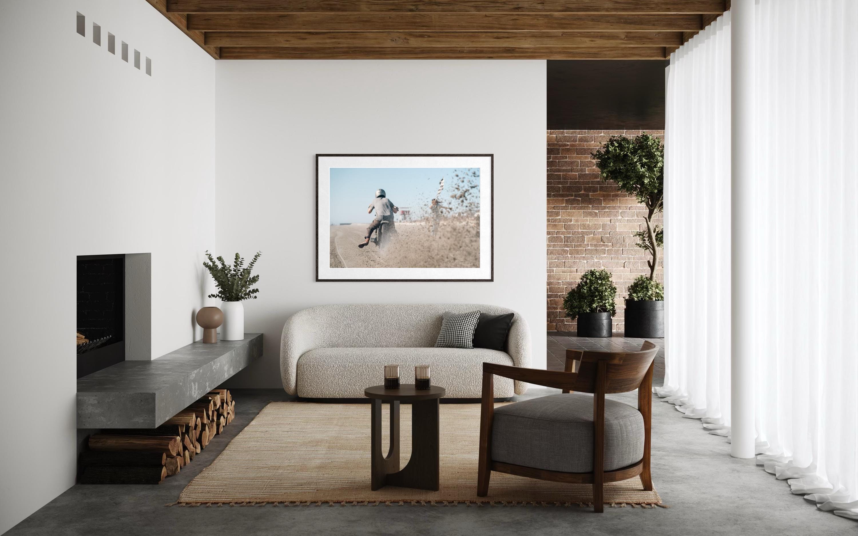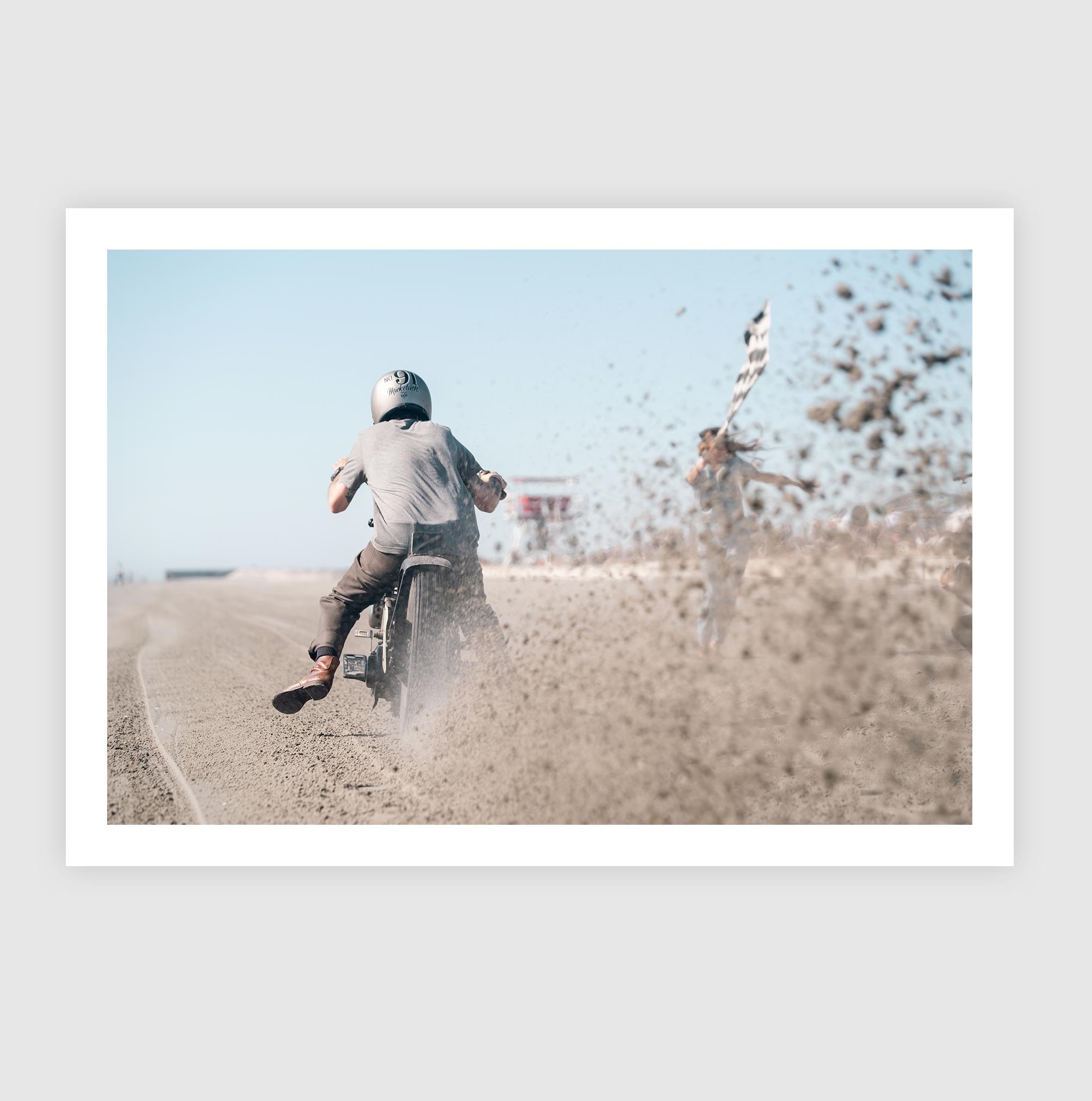 The flag drops, sand flies, and the race is on. This dynamic print captures the electrifying moment of launch at The Race of Gentlemen (TROG), where a barefoot flag girl dashes across the sand as vintage bikes roar past her. Rider #100 rockets forward while the ocean gleams in the background.