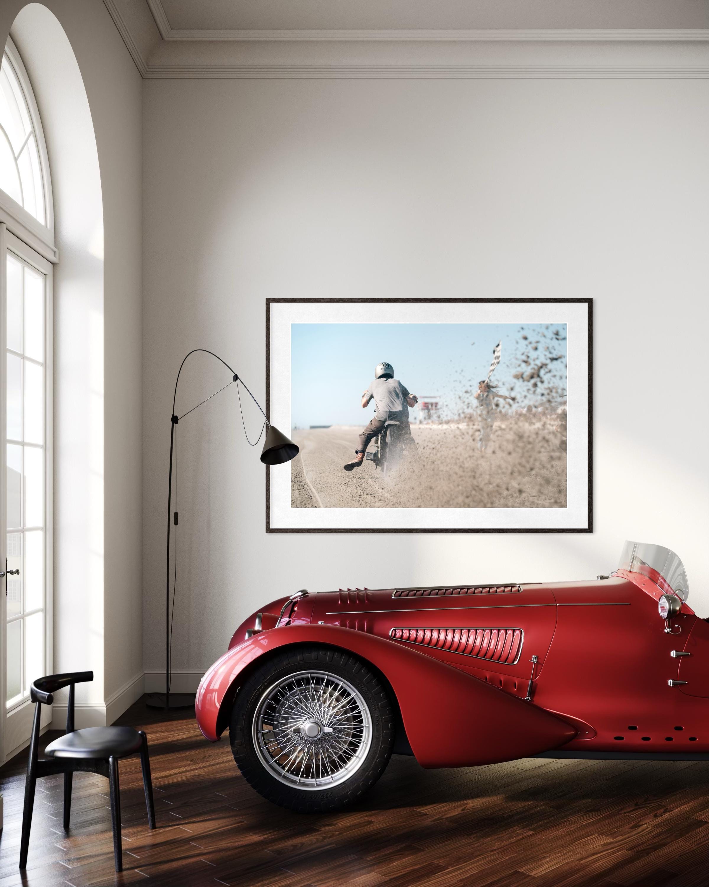 Fine Art Print - Motorcycle Racing at start line with Flag Girl + Beach Sand Splash, Coastal Decor, TROG, Office Garage Biker Wall Art, Gift