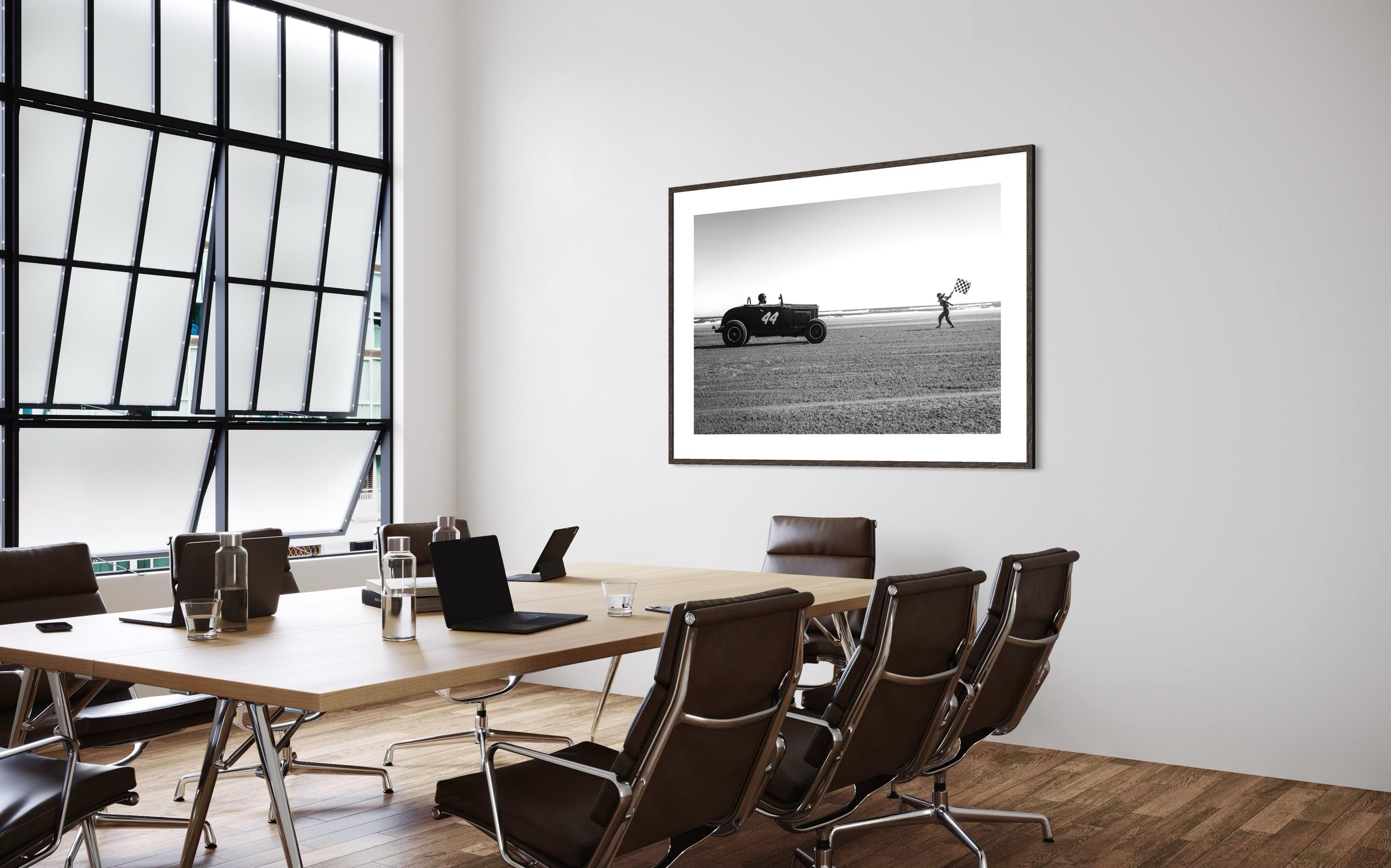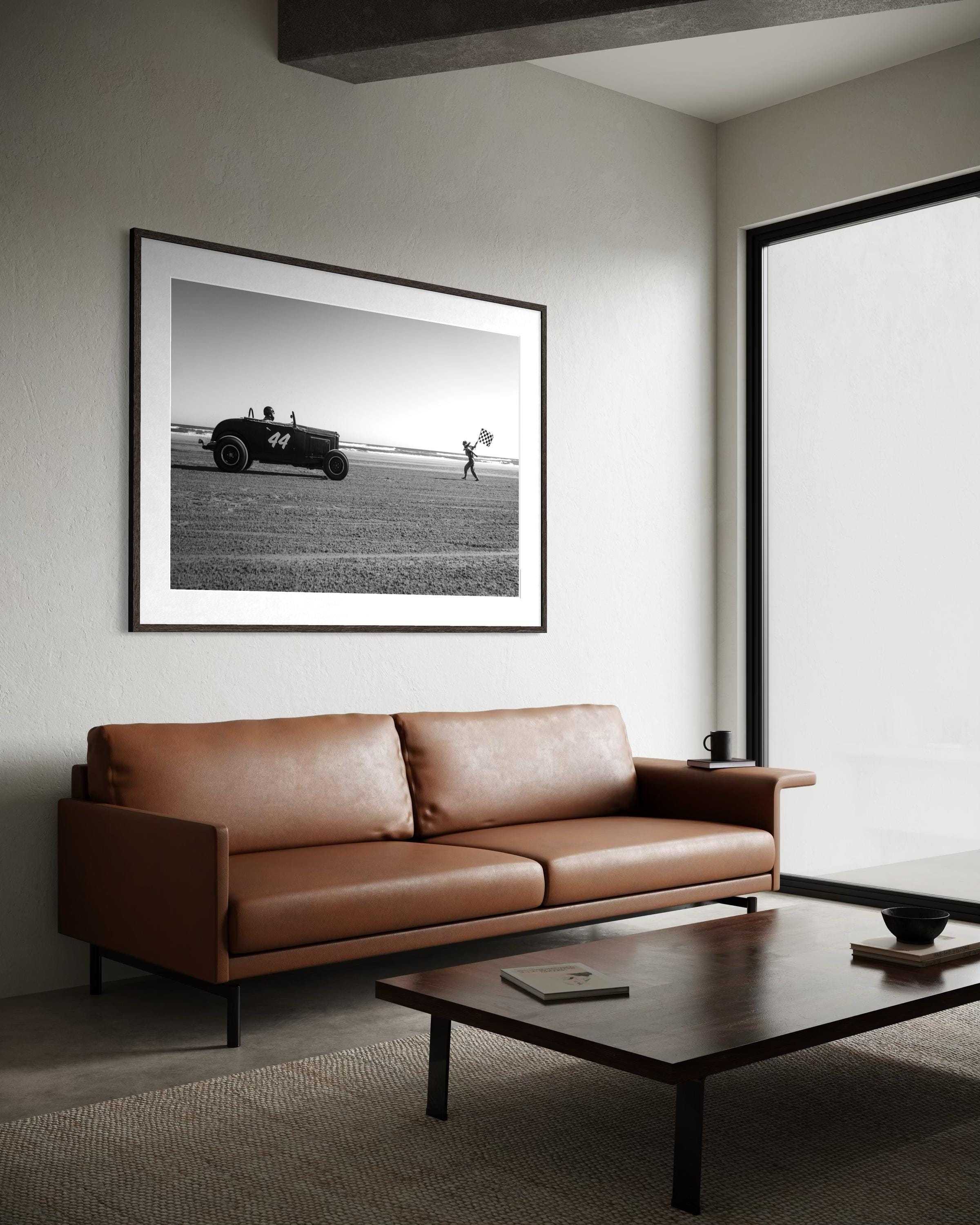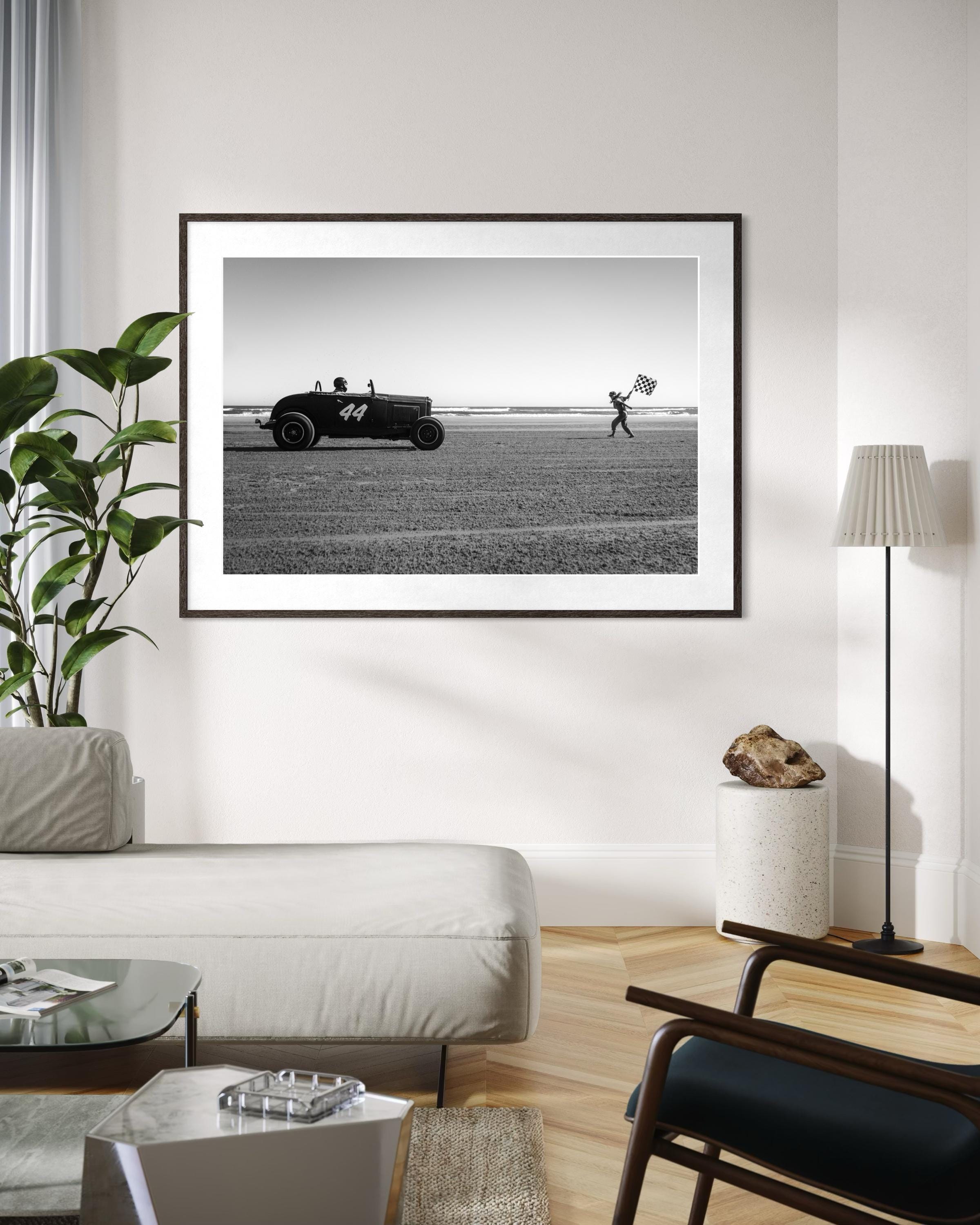 A black & white moment frozen in time, a 1930s-style hot rod takes off on the sand while a flag girl launches the race with energy and grace. Captured at the legendary Race of Gentlemen, this fine art photograph celebrates the raw nostalgia of vintage motorsport.