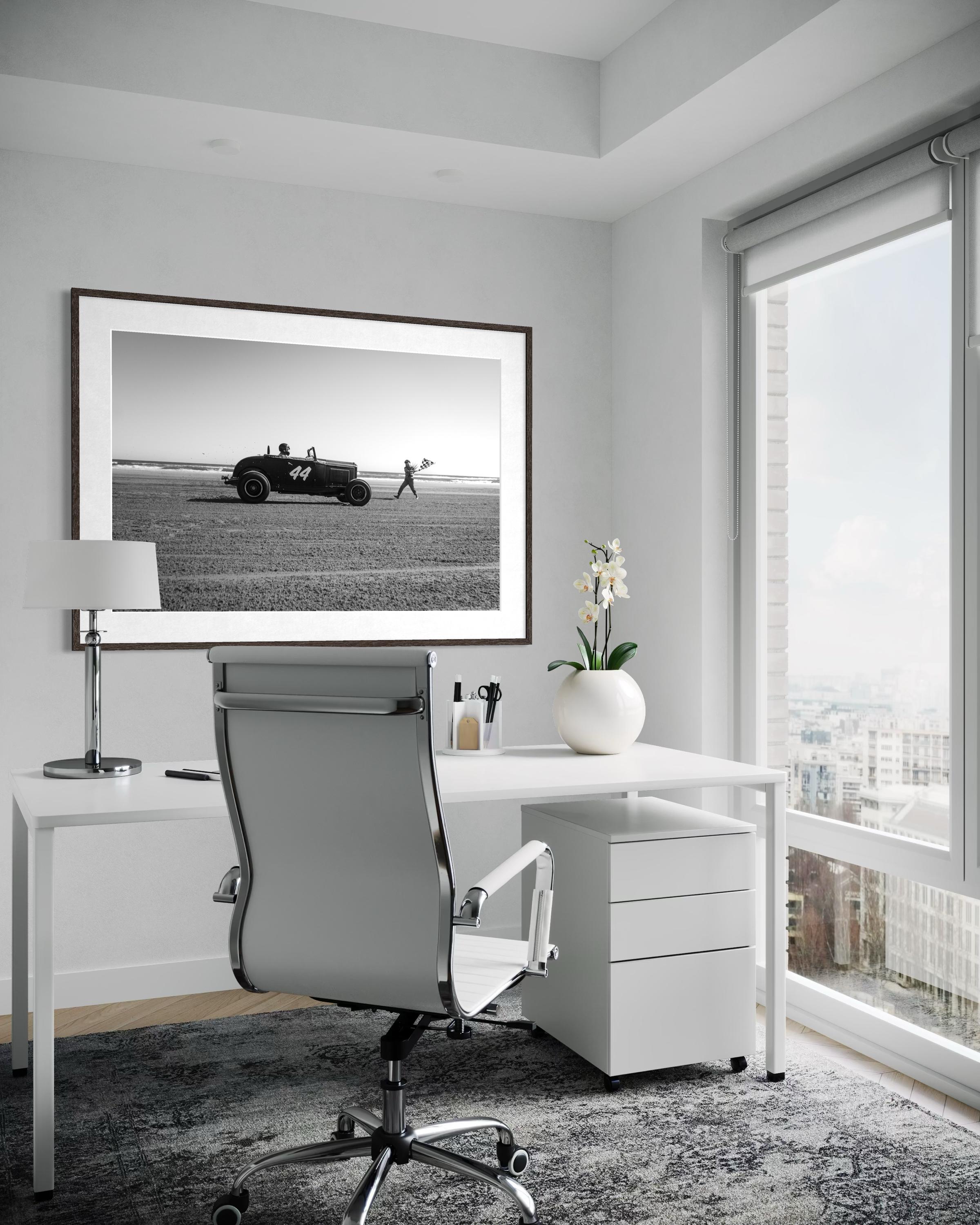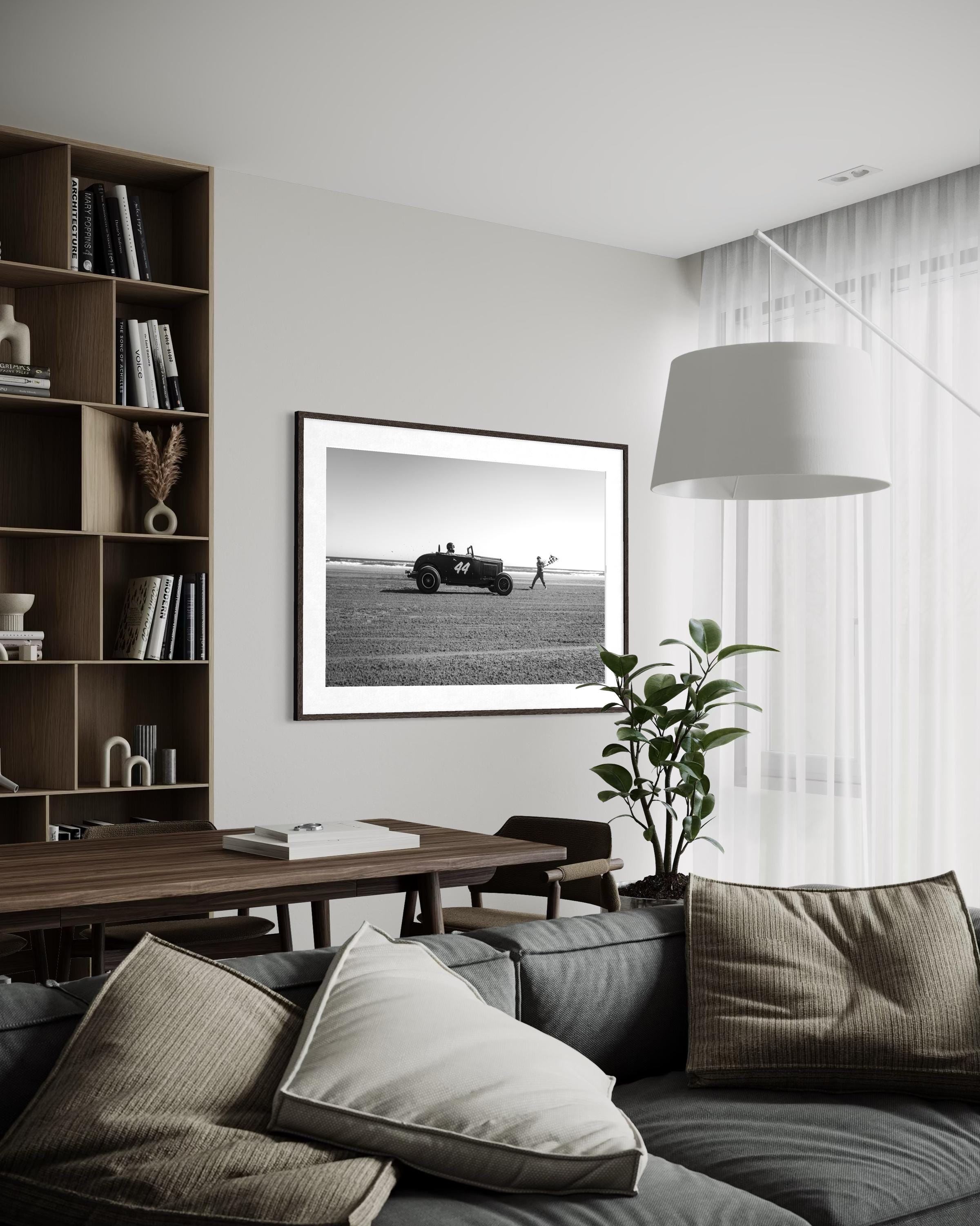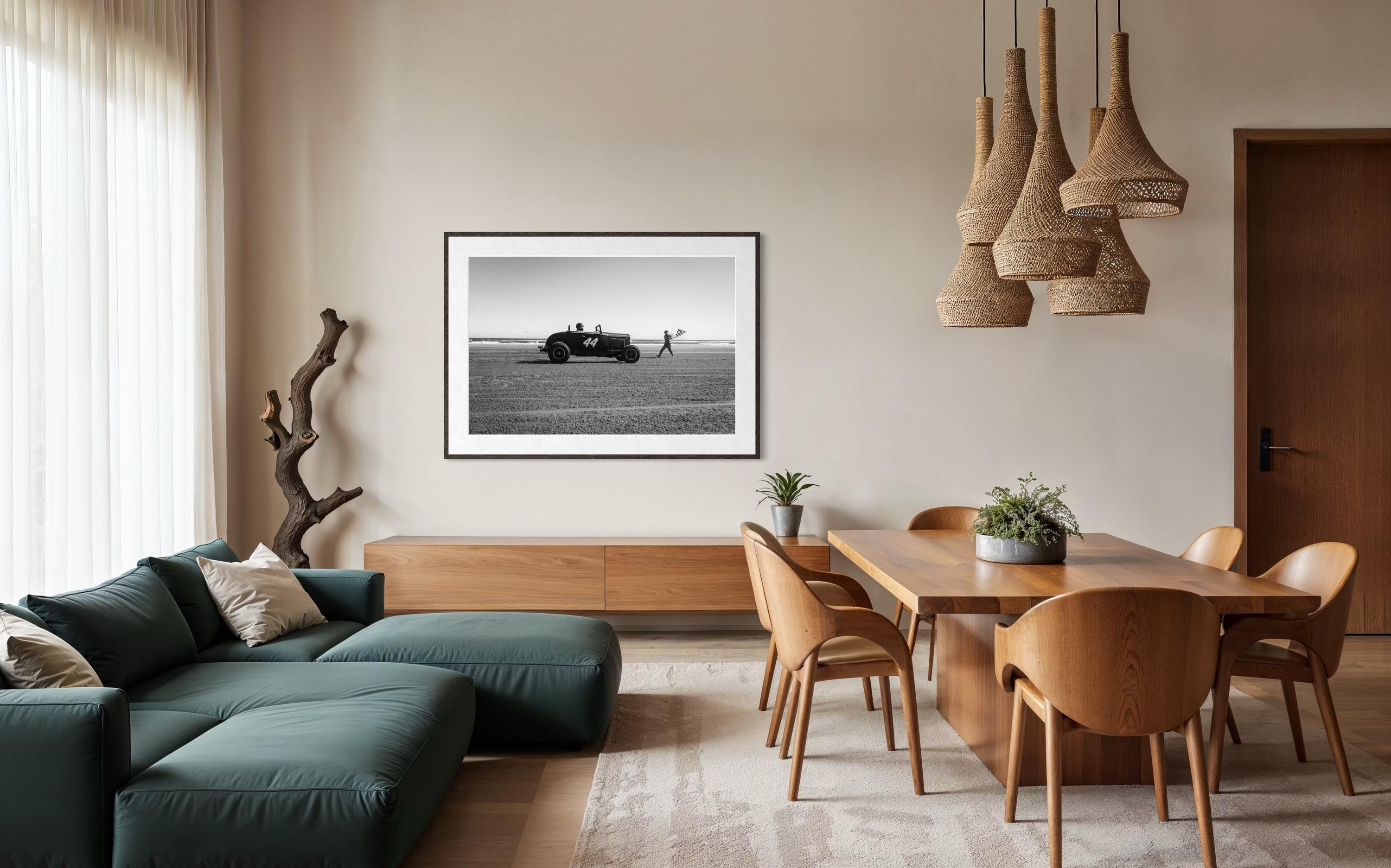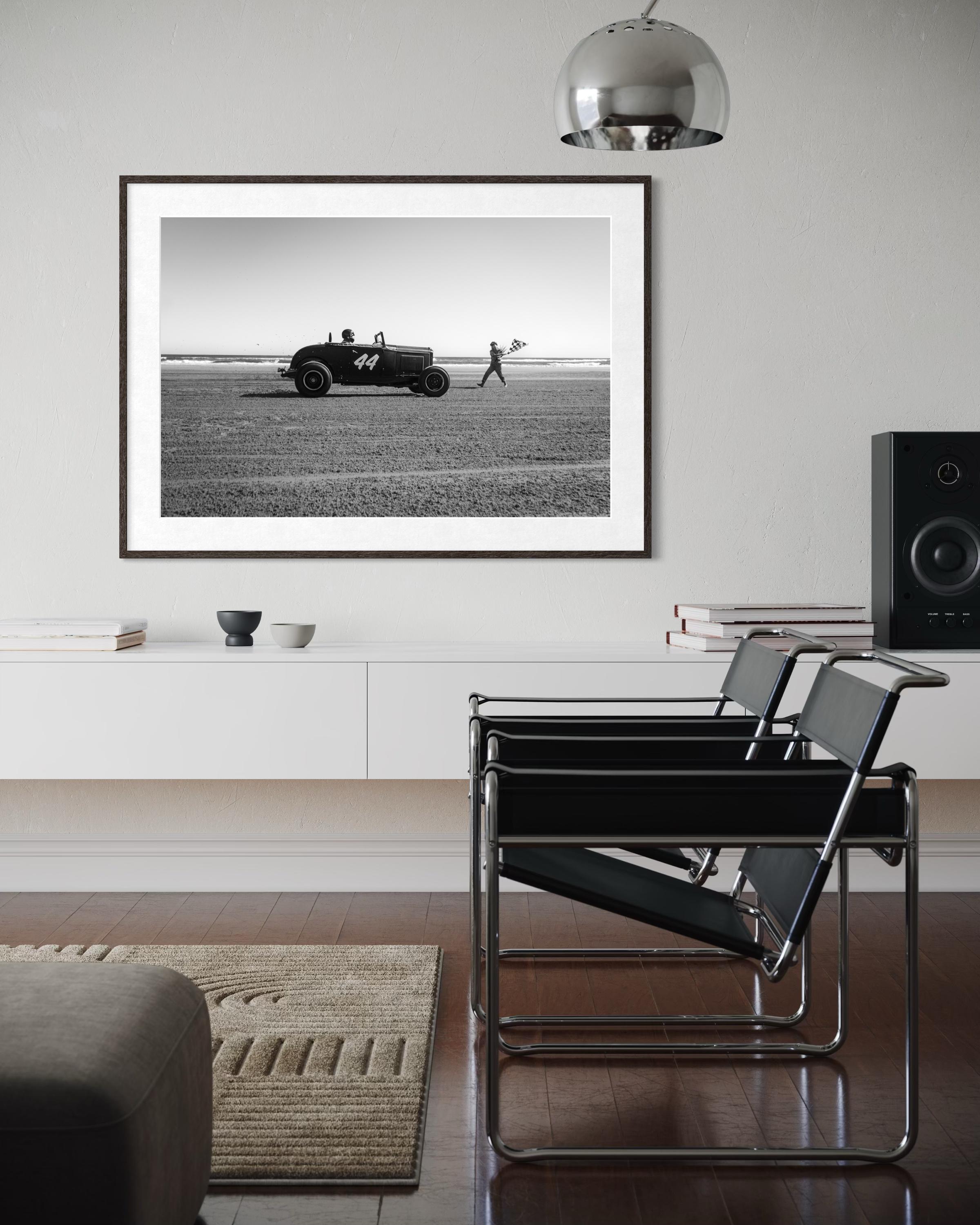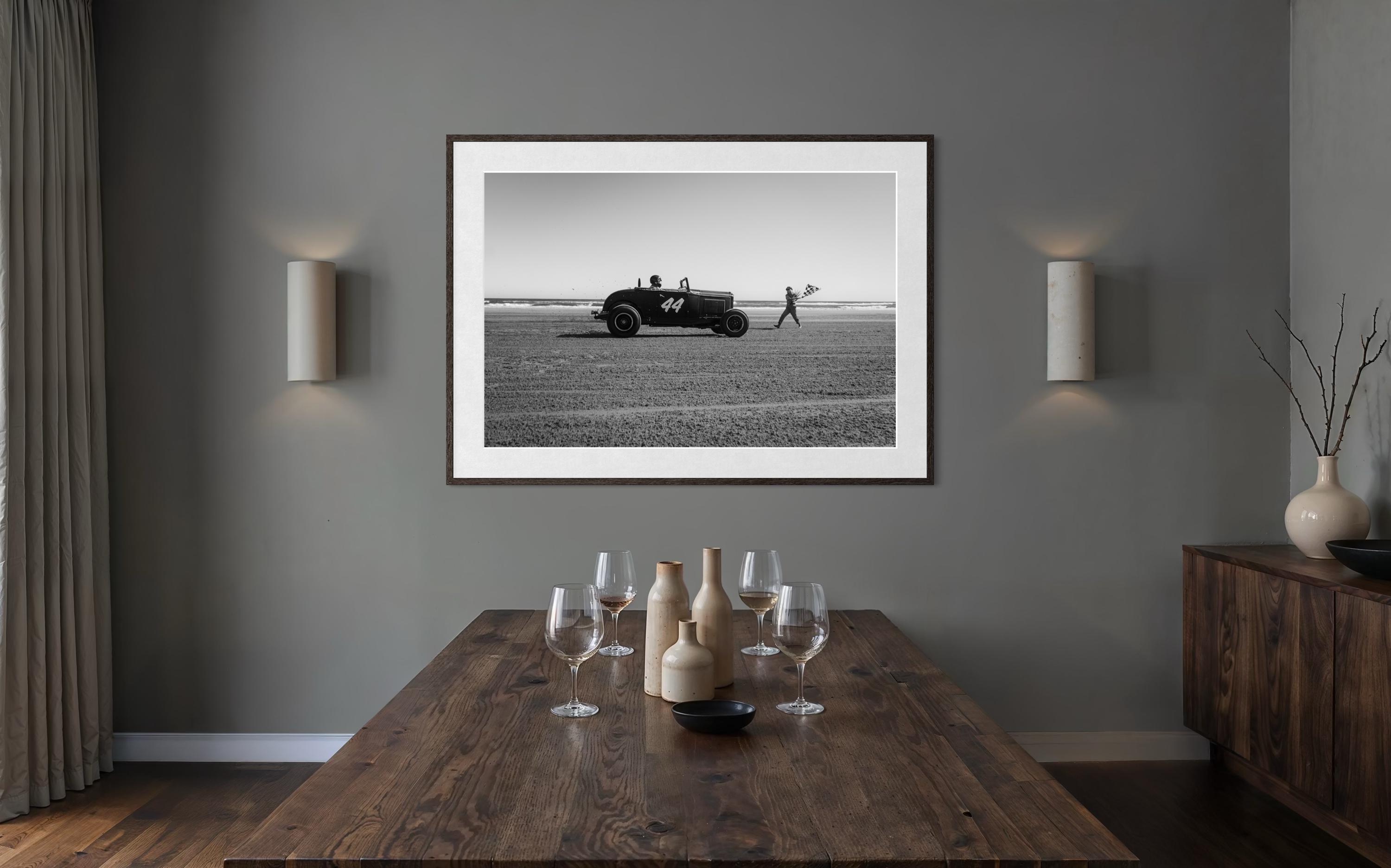 A black & white moment frozen in time, a 1930s-style hot rod takes off on the sand while a flag girl launches the race with energy and grace. Captured at the legendary Race of Gentlemen, this fine art photograph celebrates the raw nostalgia of vintage motorsport.