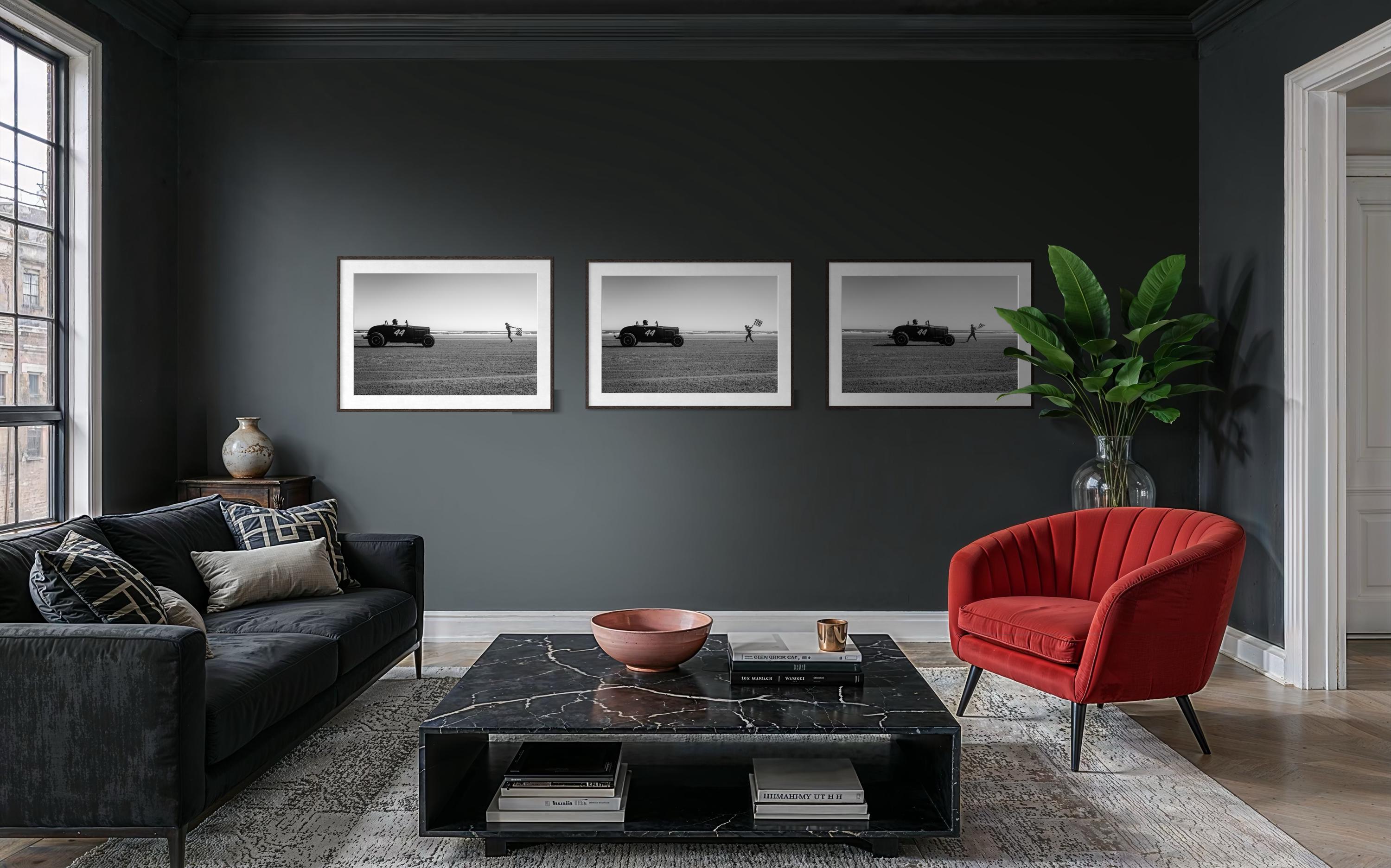 Fine Art Print - Hot Rod Beach Race Start x Flag Girl, 44, TROG, Black and White Wall Art, Racing Decor for Man Cave, Triptych 1 of 3